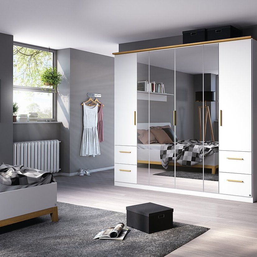 Berücksichtige die Platzierung des Schranks im Raum, um zu vermeiden, dass direktes Sonnenlicht reflektiert wird und Blendungen entstehen. Spiegeltüren am Kleiderschrank können den Raum optisch vergrößern, sollten aber so positioniert werden, dass sie harmonisch ins Raumkonzept passen.