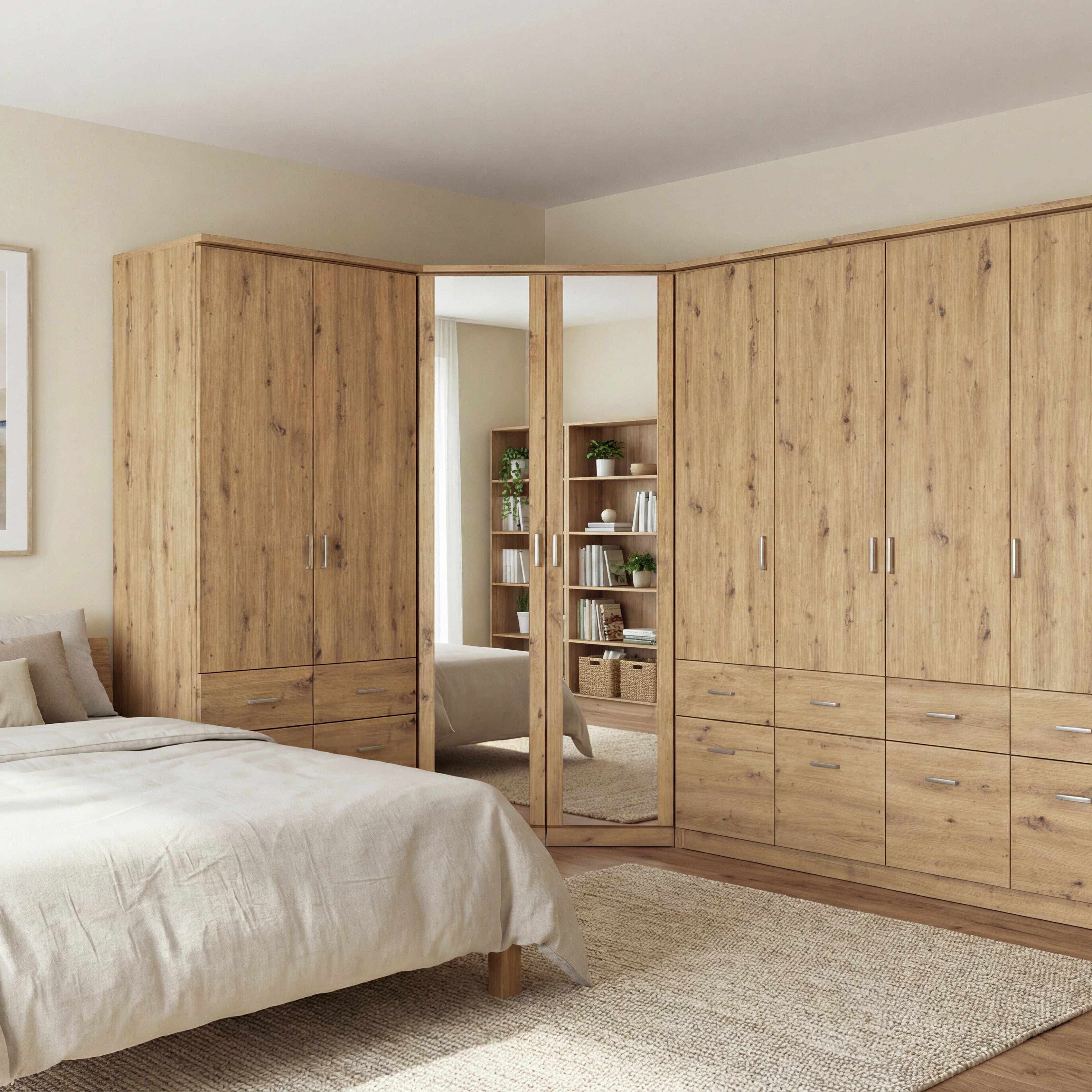 • Eckkleiderschränke nutzen den Raum effektiv und schaffen zusätzlichen Stauraum durch ihre optimale Ecklösung. So passt sich der Schrank individuellen Raumbedingungen perfekt an.