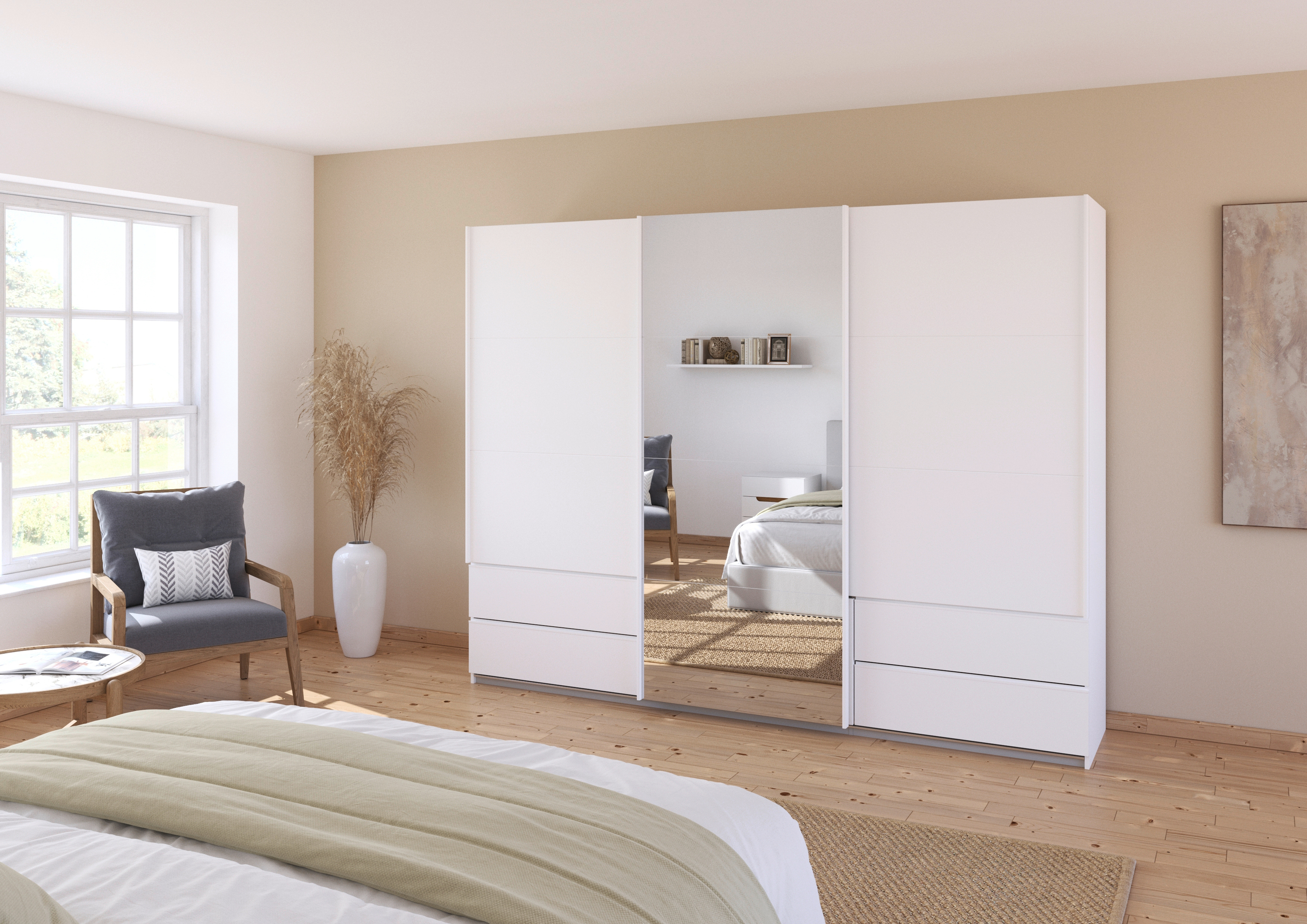 • Schwebetürenschränke / Schiebetürenschränke eignen sich hervorragend für kleinere Räume, da sie keinen zusätzlichen Platz beim Öffnen benötigen und sich dank ihrer Schwebetüren / Schiebetüren einfach zur Seite schieben lassen.