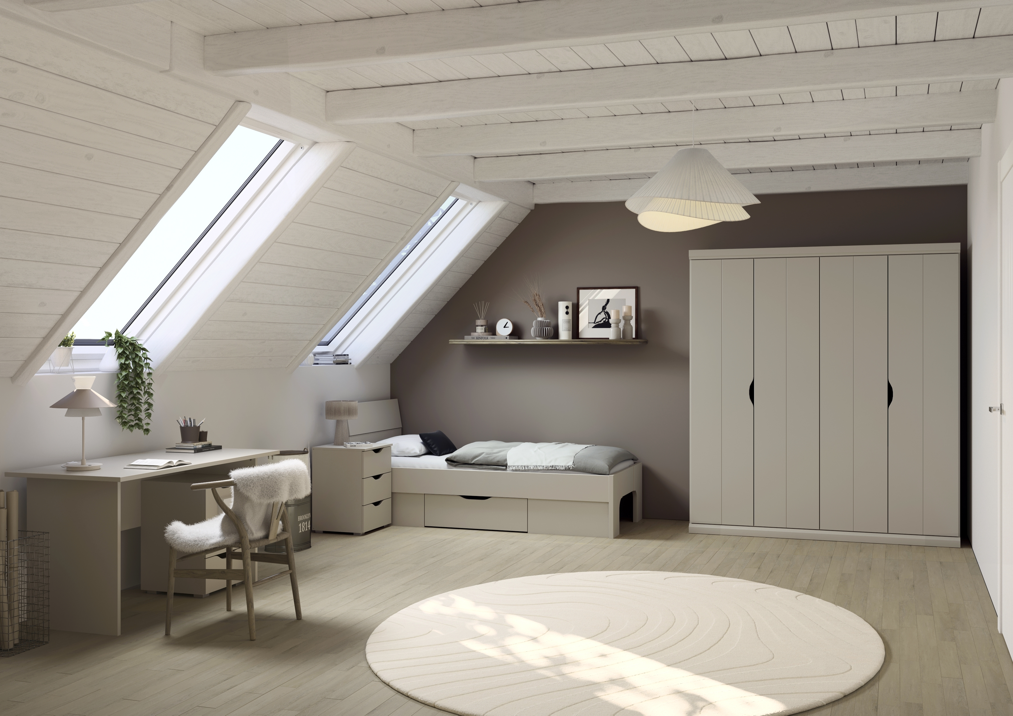 Das Jugendzimmer »Frieda« ist sowohl für Kinder als auch für Jugendliche geeignet. Die klare Gestaltung, die ruhige Farbgebung in Beige und die funktionale Ausstattung machen es zu einer langlebigen Lösung, die mit dem Alter, dem Stil und den Bedürfnissen der Kinder mitgeht.