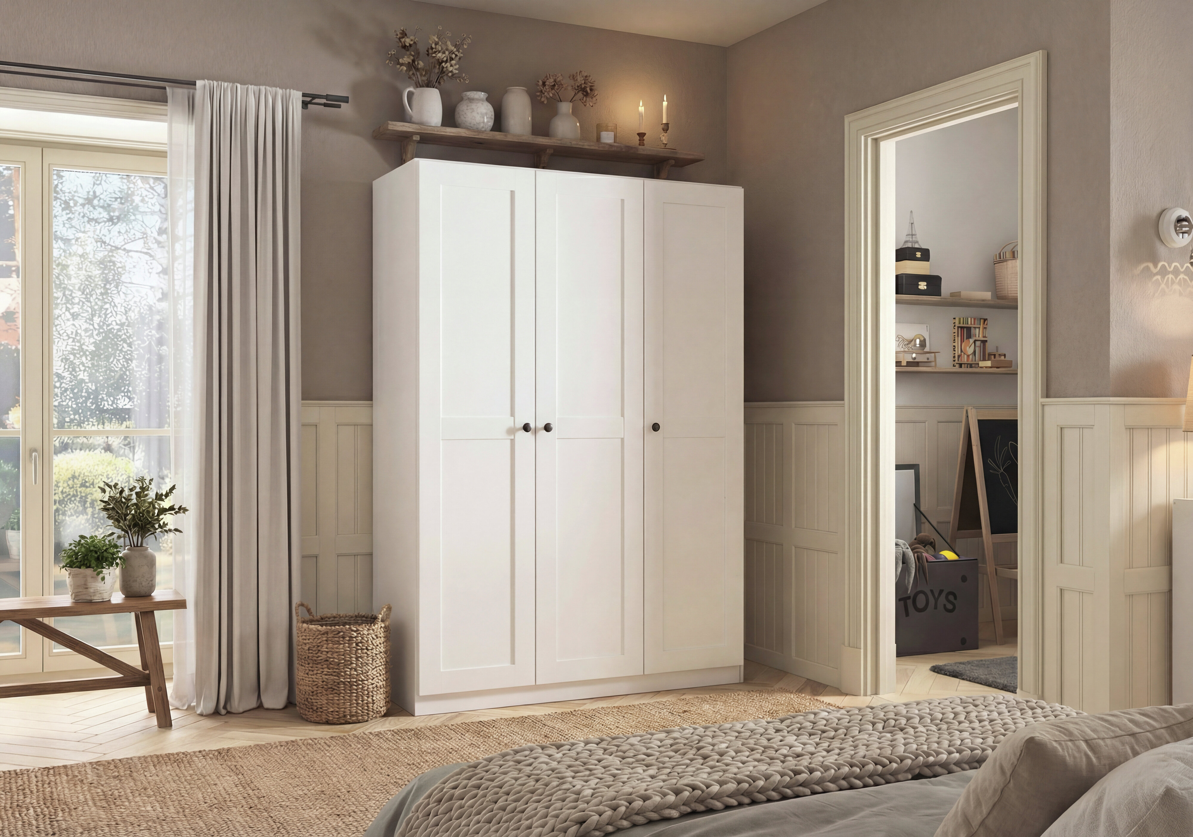 „Skagen“ verbindet den klassischen Landhausstil mit moderner Zurückhaltung in Weiß. Die klaren Kassettenfronten und die schwarzen Knopfgriffe verleihen dem Schrank eine ruhige, elegante Präsenz. Im Zusammenspiel mit hellen Wänden, zarten Stoffen und warmem Licht entsteht eine Atmosphäre, die an traditionelle Wohnkultur erinnert.