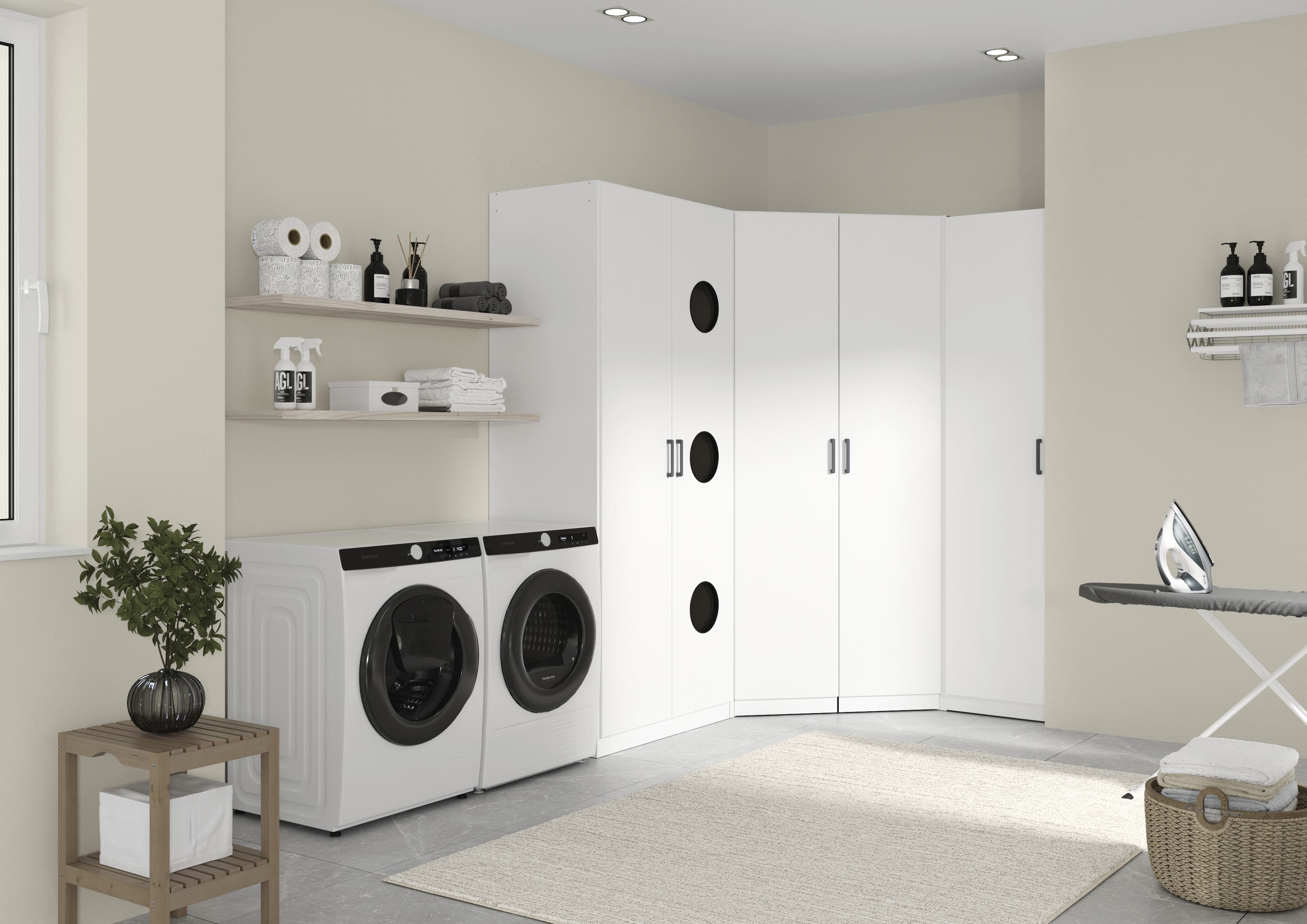 Waschmittel, Körbe, Tücher sowie saubere und schmutzige Wäsche lassen sich übersichtlich verstauen. Jeder Handgriff sitzt. Das Ergebnis ist mehr Effizienz und weniger Chaos.