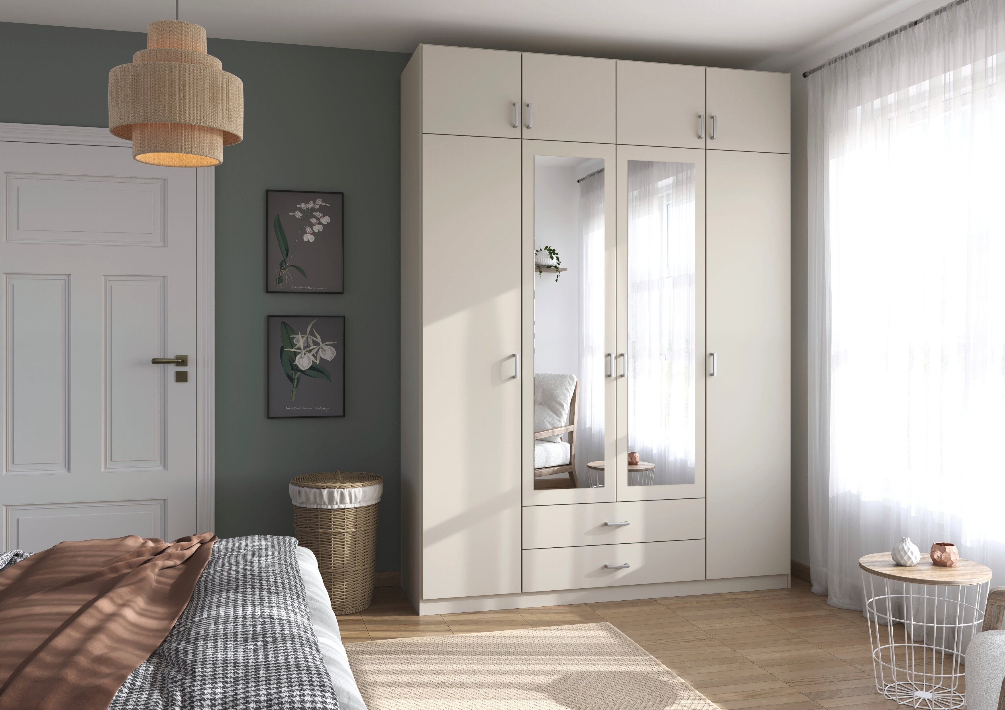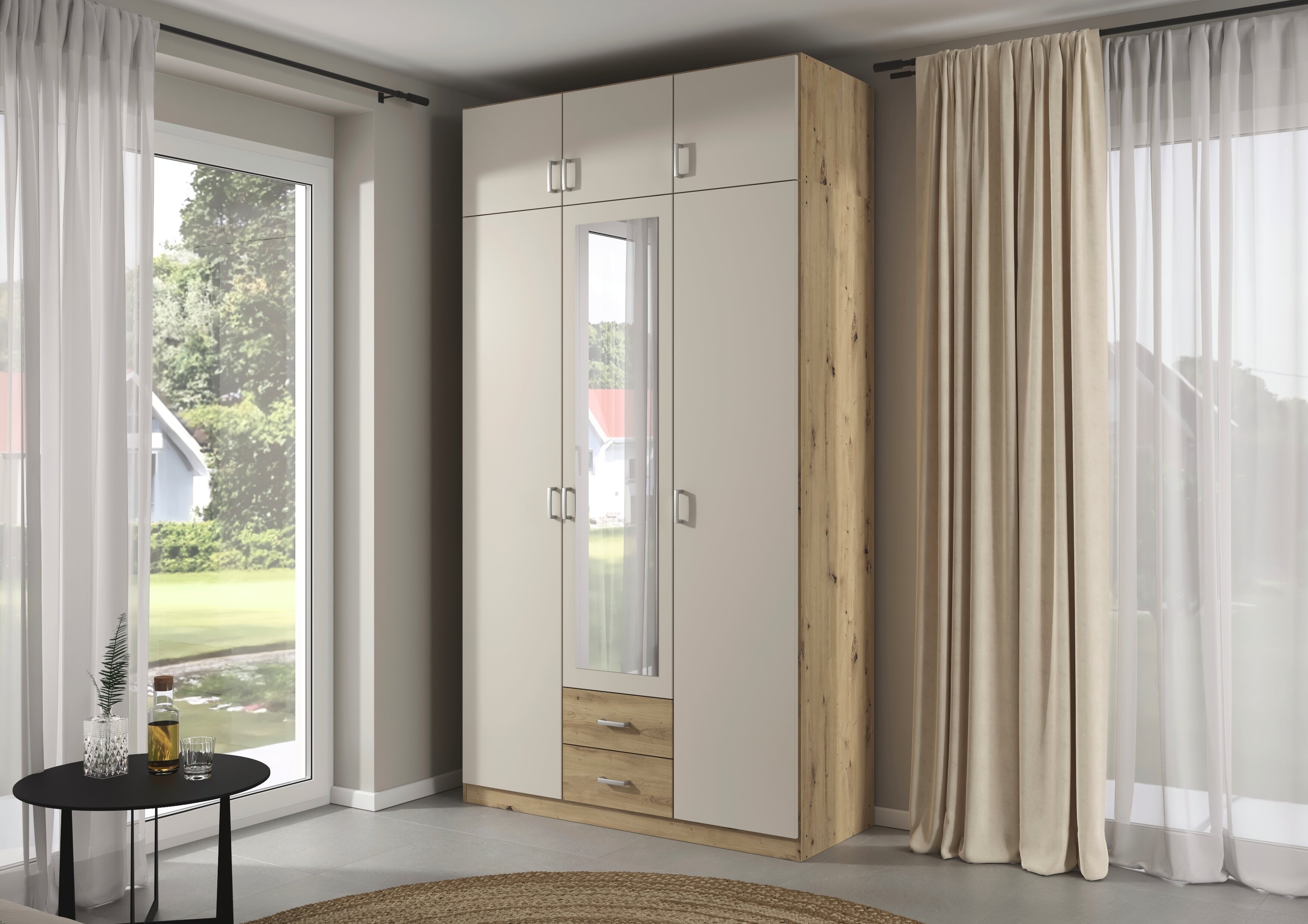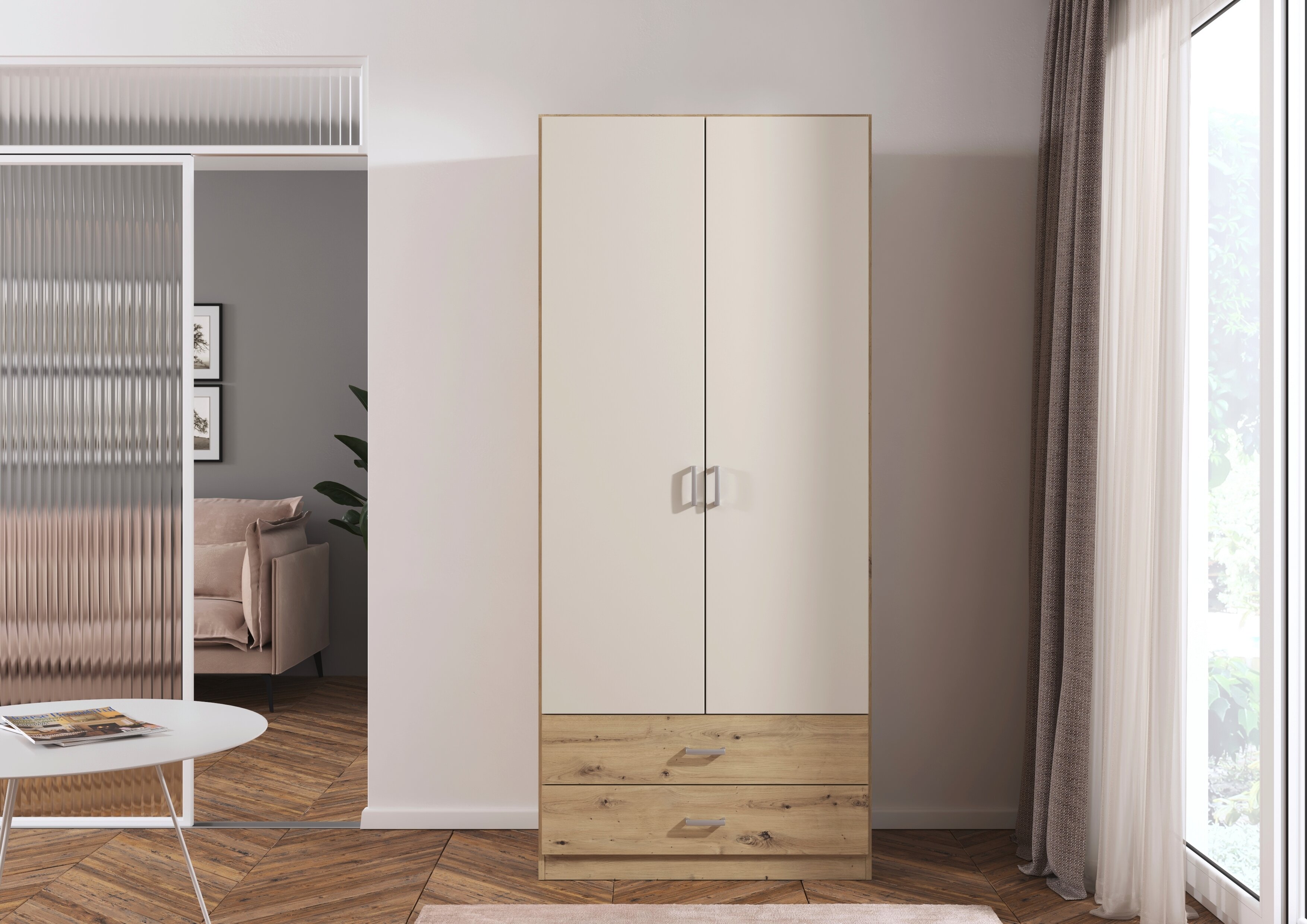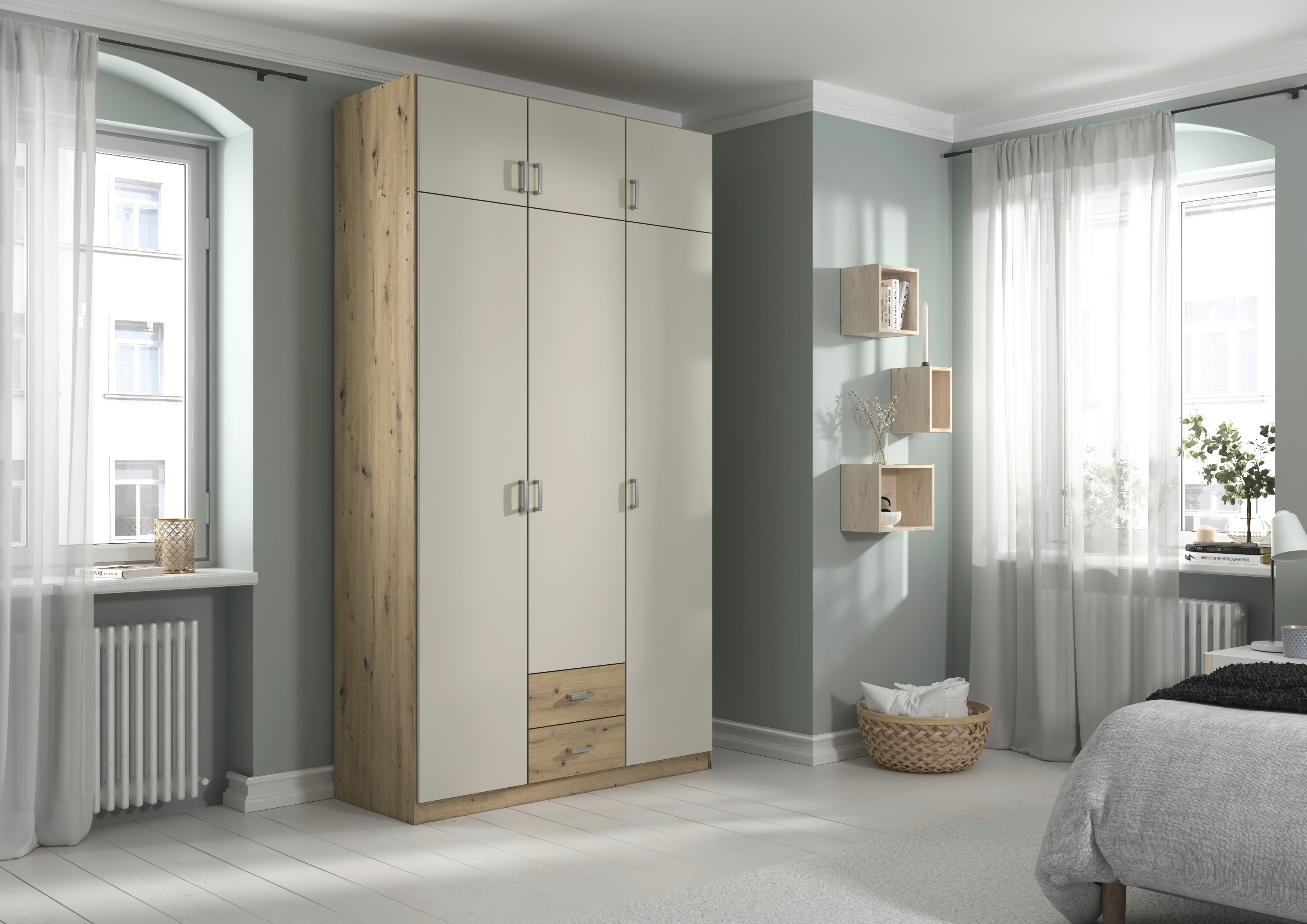 Die Kleiderschränke der Modellserie Gamma sind Ordnungshelfer und Blickfang in einem. Hier werden klassische Drehtüren mit praktischen Schubladen clever kombiniert. Im geräumigen Inneren des Schrankes finden deine Jacken, Pullover, Hosen und Co. ausreichend Platz, während du Wäsche und Accessoires in den Schubladen ordentlich aufbewahren kannst.
