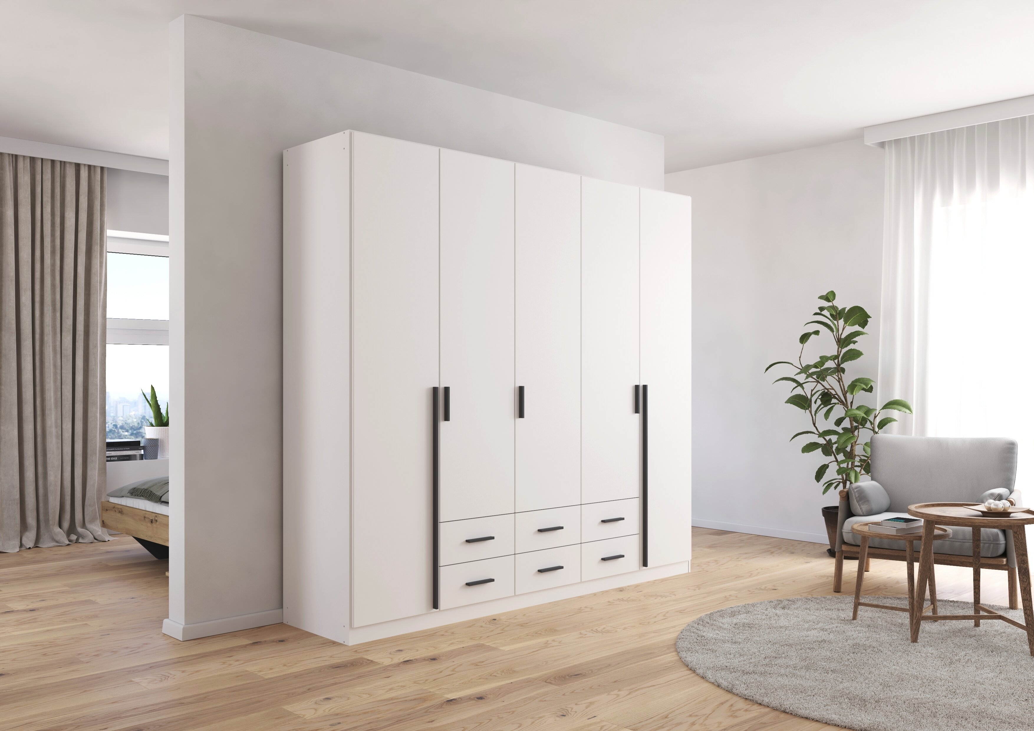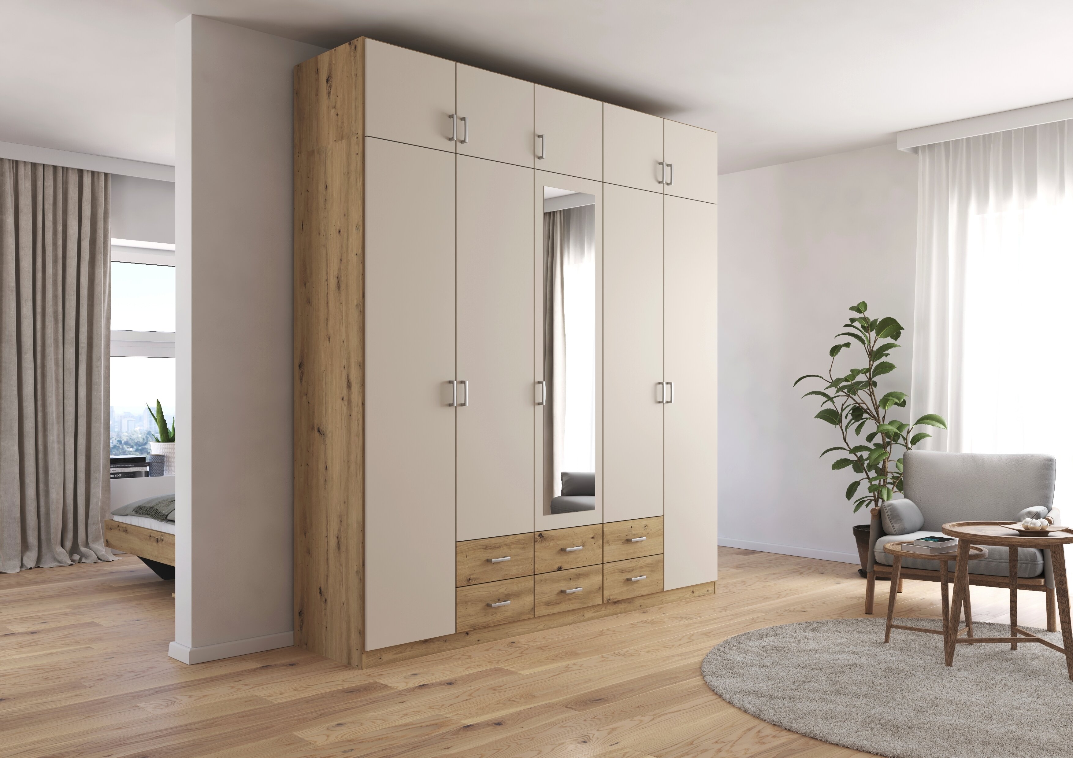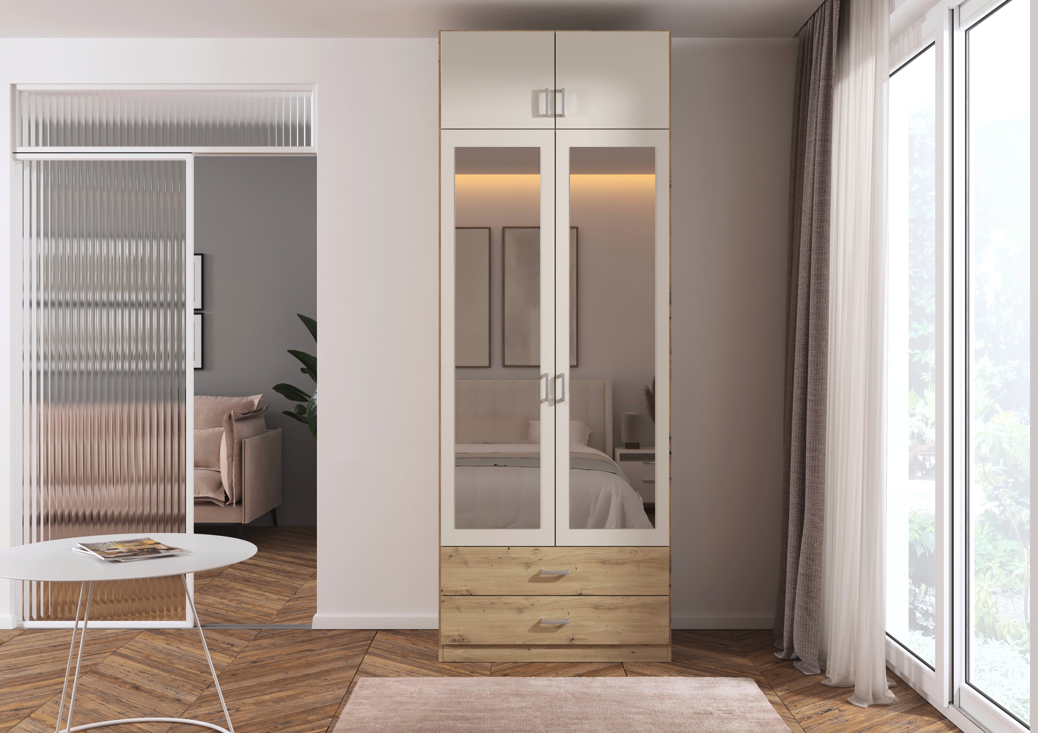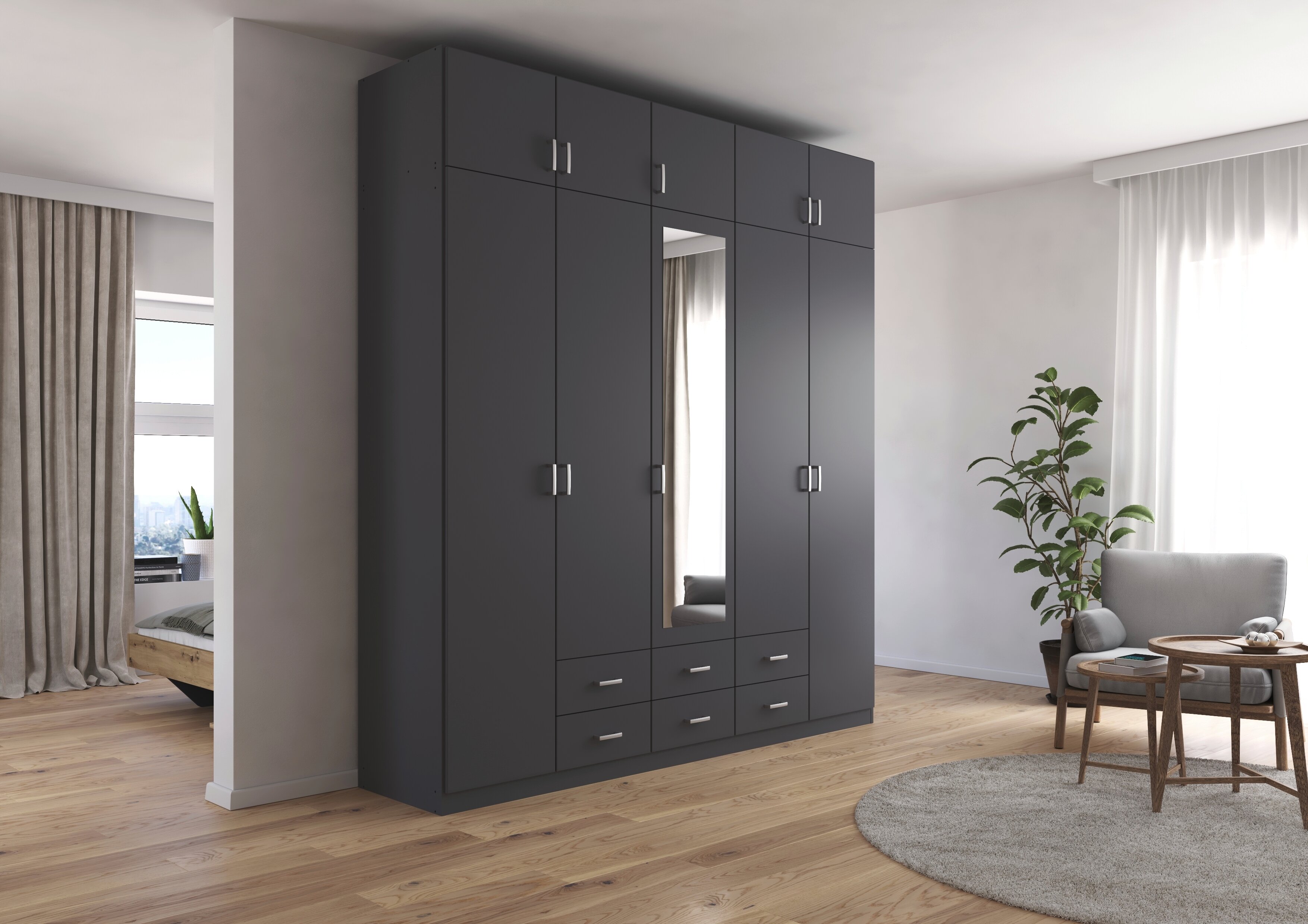 Die Kleiderschränke der Modellserie Gamma sind Ordnungshelfer und Blickfang in einem. Hier werden klassische Drehtüren mit praktischen Schubladen clever kombiniert. Im geräumigen Inneren des Schrankes finden deine Jacken, Pullover, Hosen und Co. ausreichend Platz, während du Wäsche und Accessoires in den Schubladen ordentlich aufbewahren kannst.