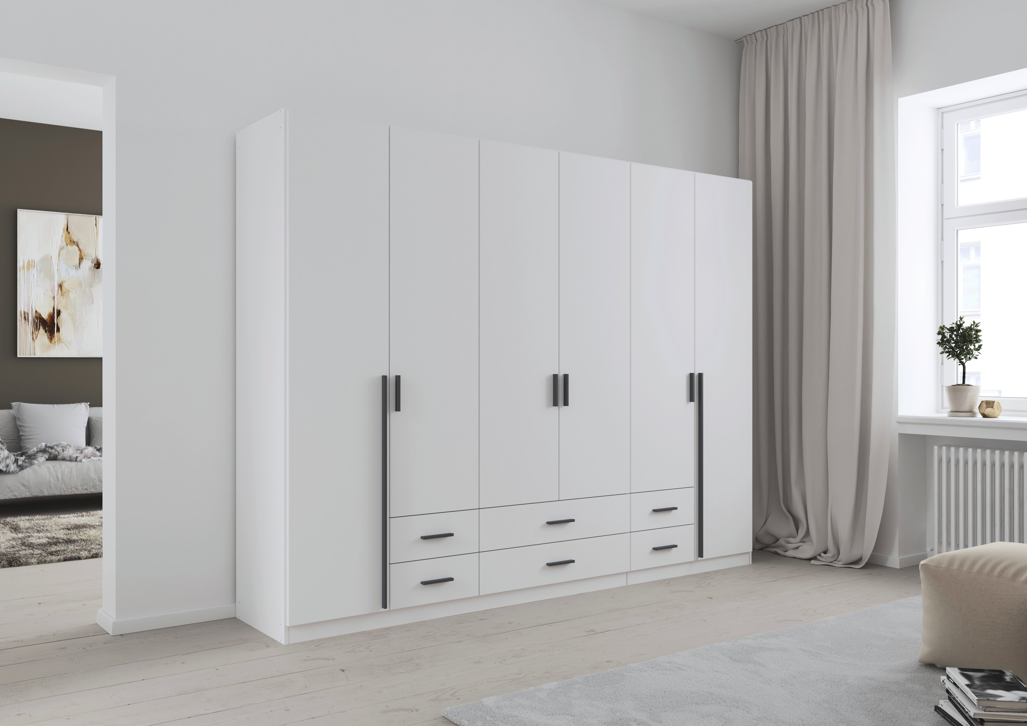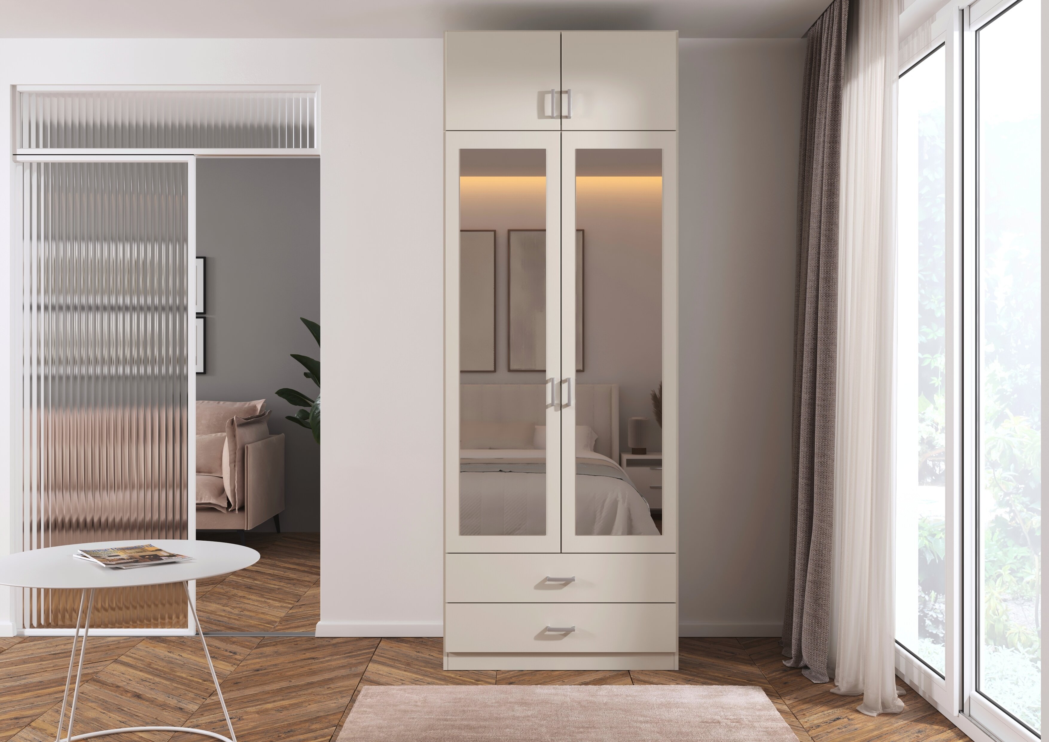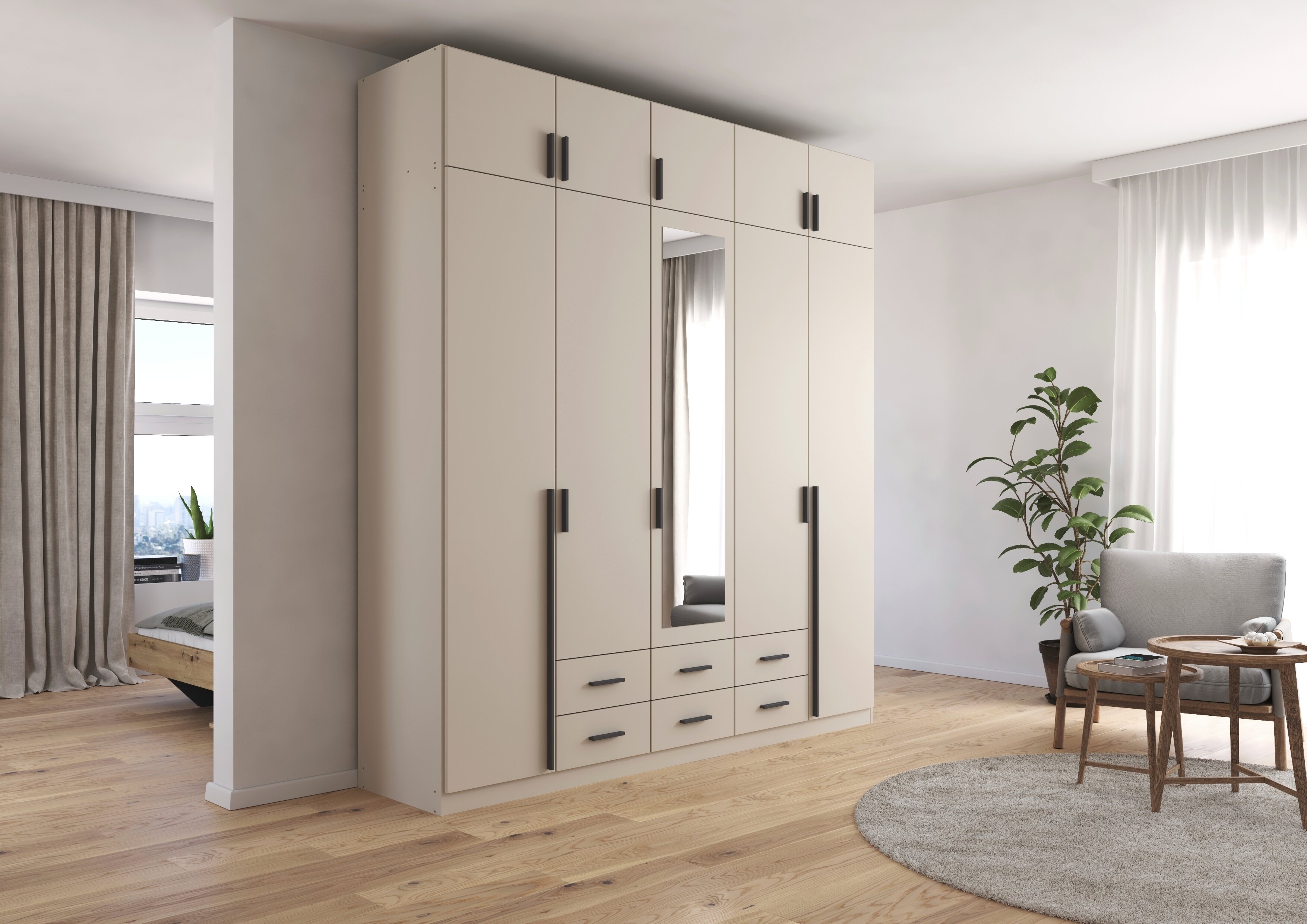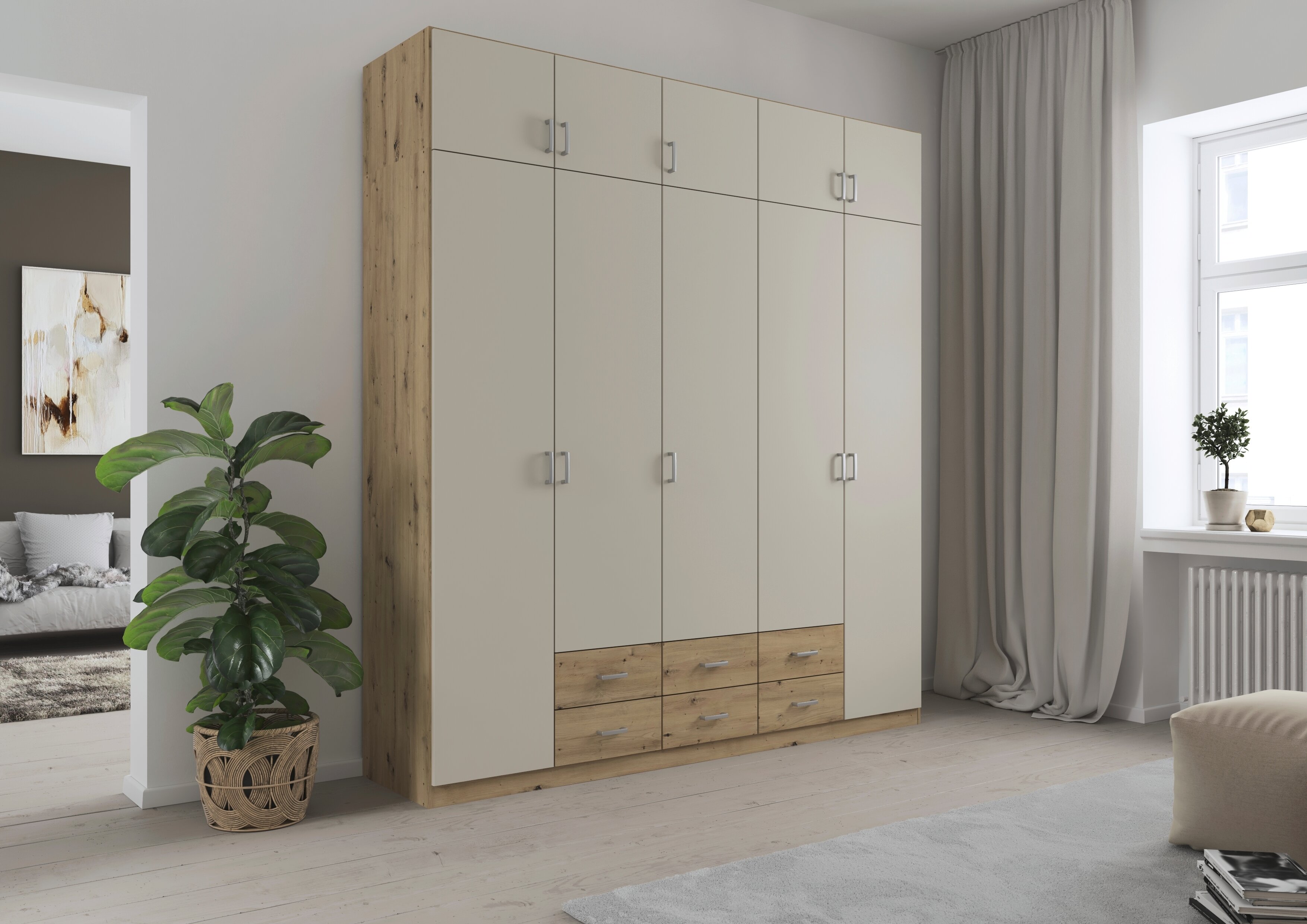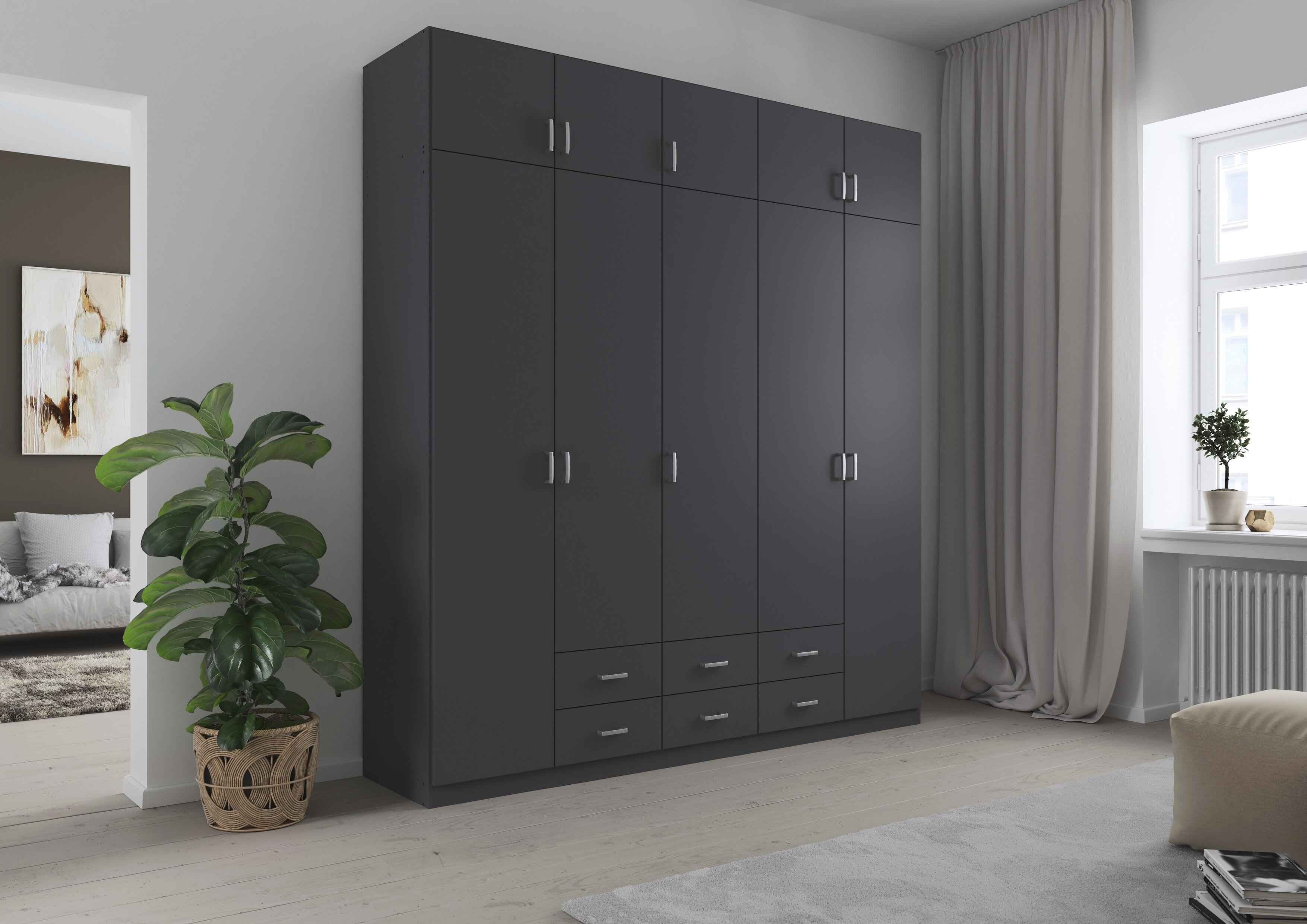 Die Kleiderschränke der Modellserie Gamma sind Ordnungshelfer und Blickfang in einem. Hier werden klassische Drehtüren mit praktischen Schubladen clever kombiniert. Im geräumigen Inneren des Schrankes finden deine Jacken, Pullover, Hosen und Co. ausreichend Platz, während du Wäsche und Accessoires in den Schubladen ordentlich aufbewahren kannst.