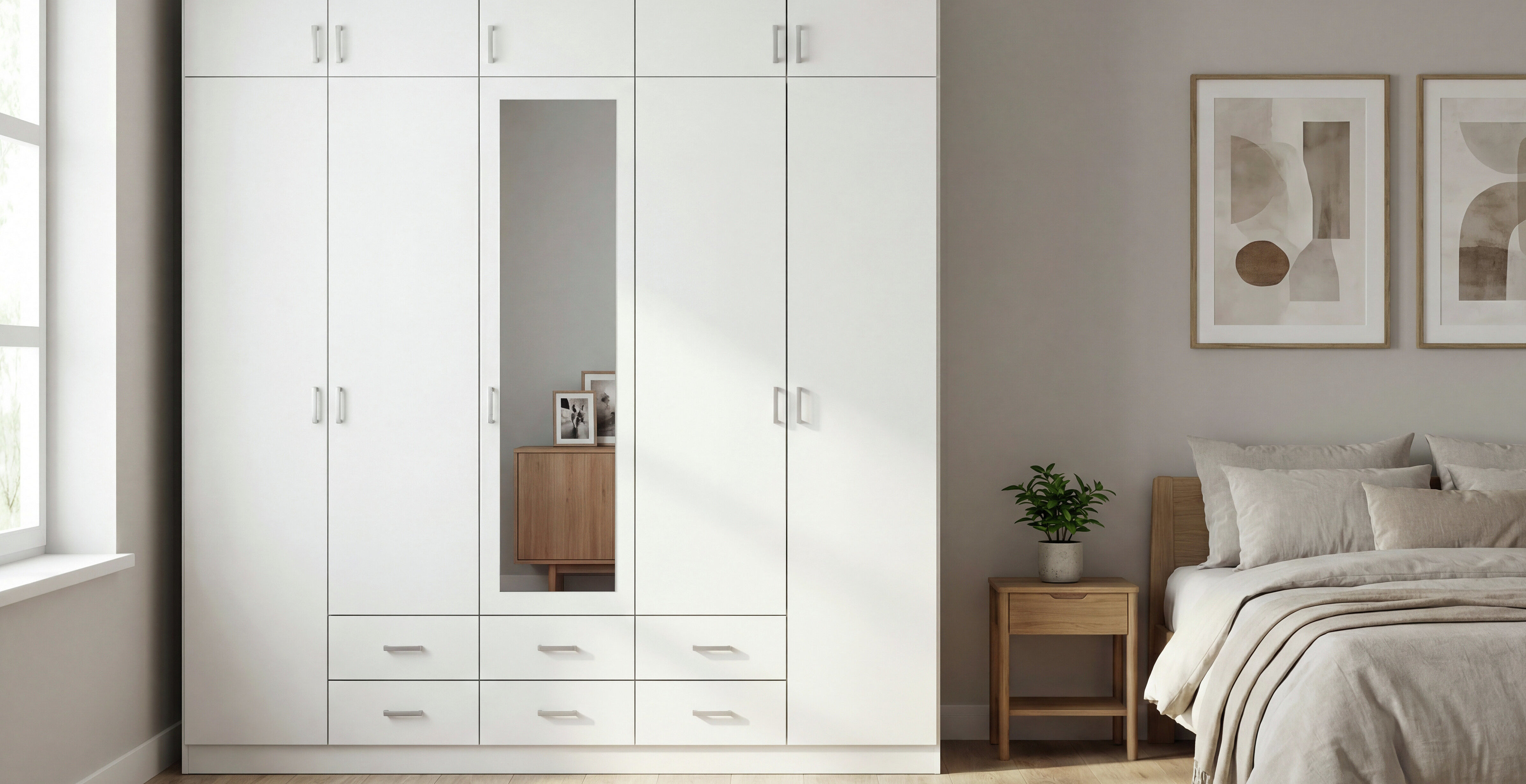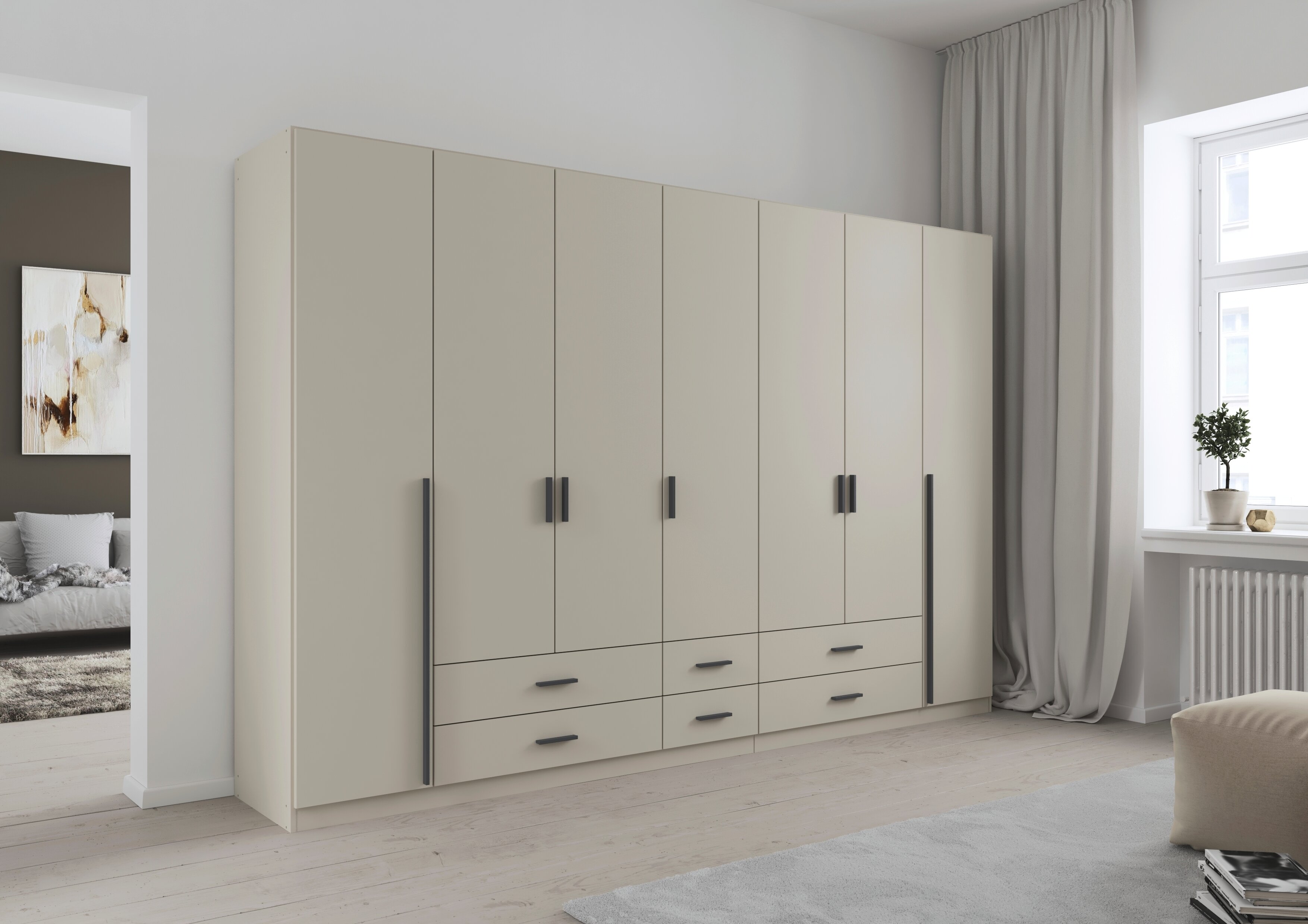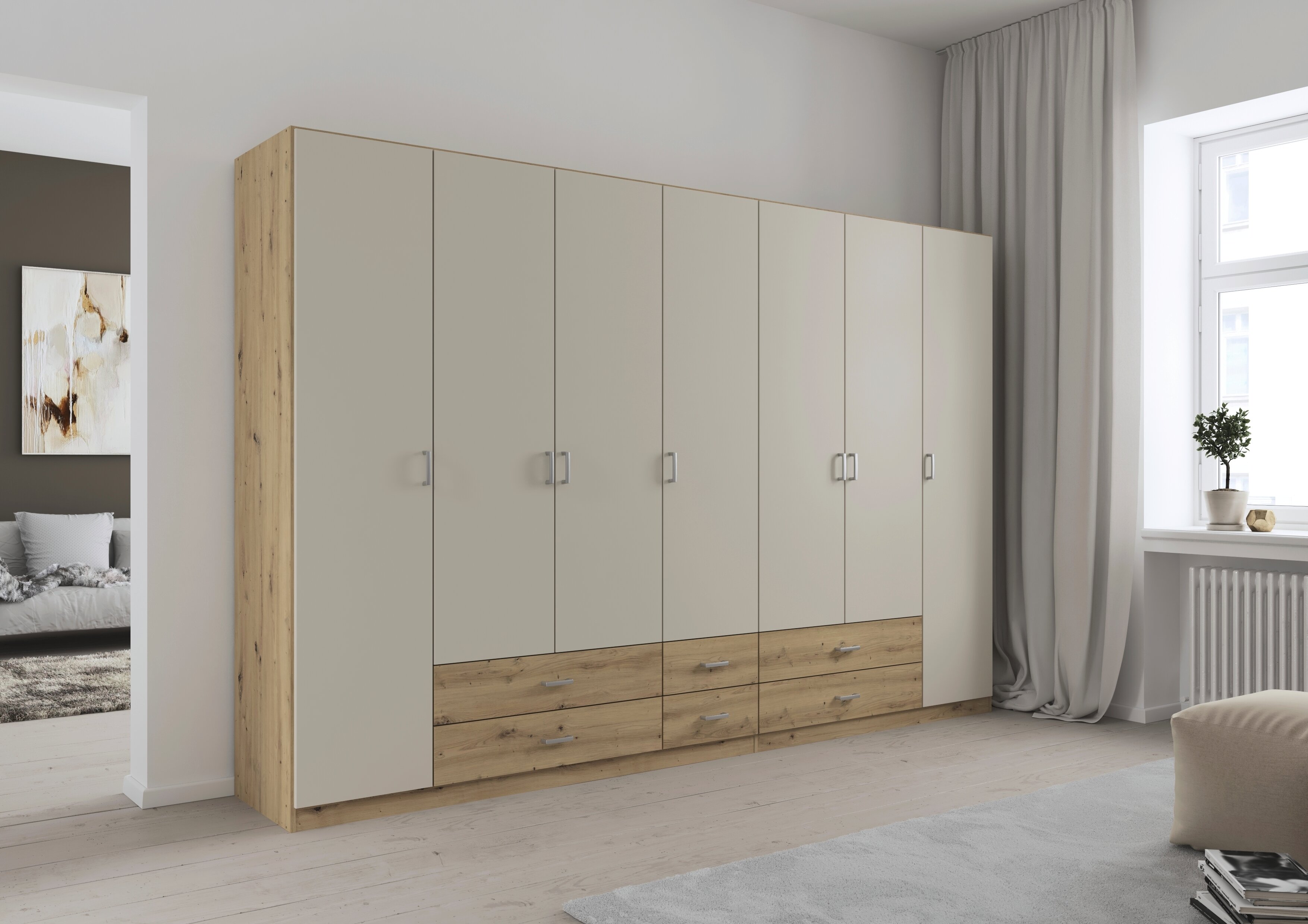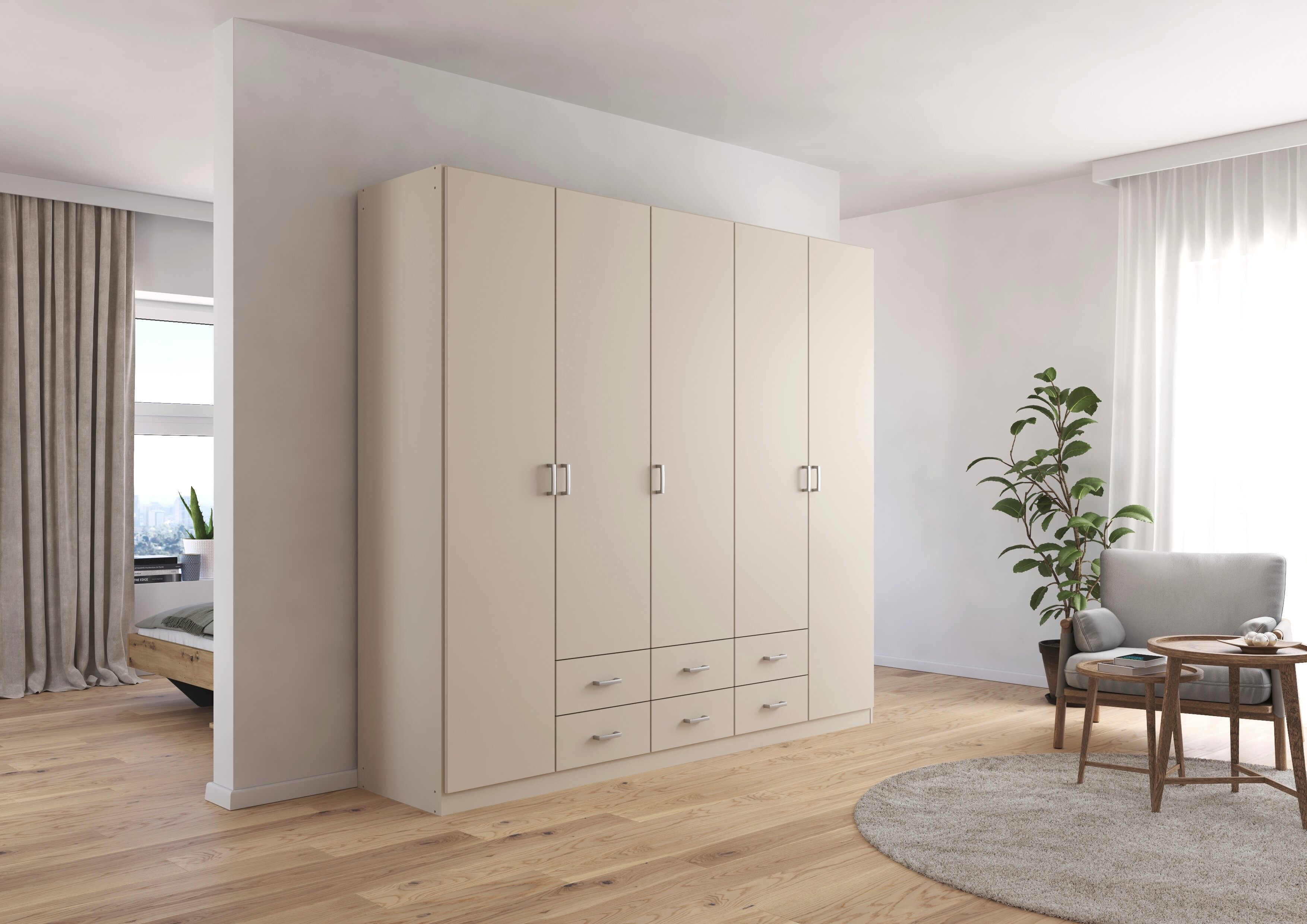 Die Kleiderschränke der Modellserie Gamma sind Ordnungshelfer und Blickfang in einem. Hier werden klassische Drehtüren mit praktischen Schubladen clever kombiniert. Im geräumigen Inneren des Schrankes finden deine Jacken, Pullover, Hosen und Co. ausreichend Platz, während du Wäsche und Accessoires in den Schubladen ordentlich aufbewahren kannst.