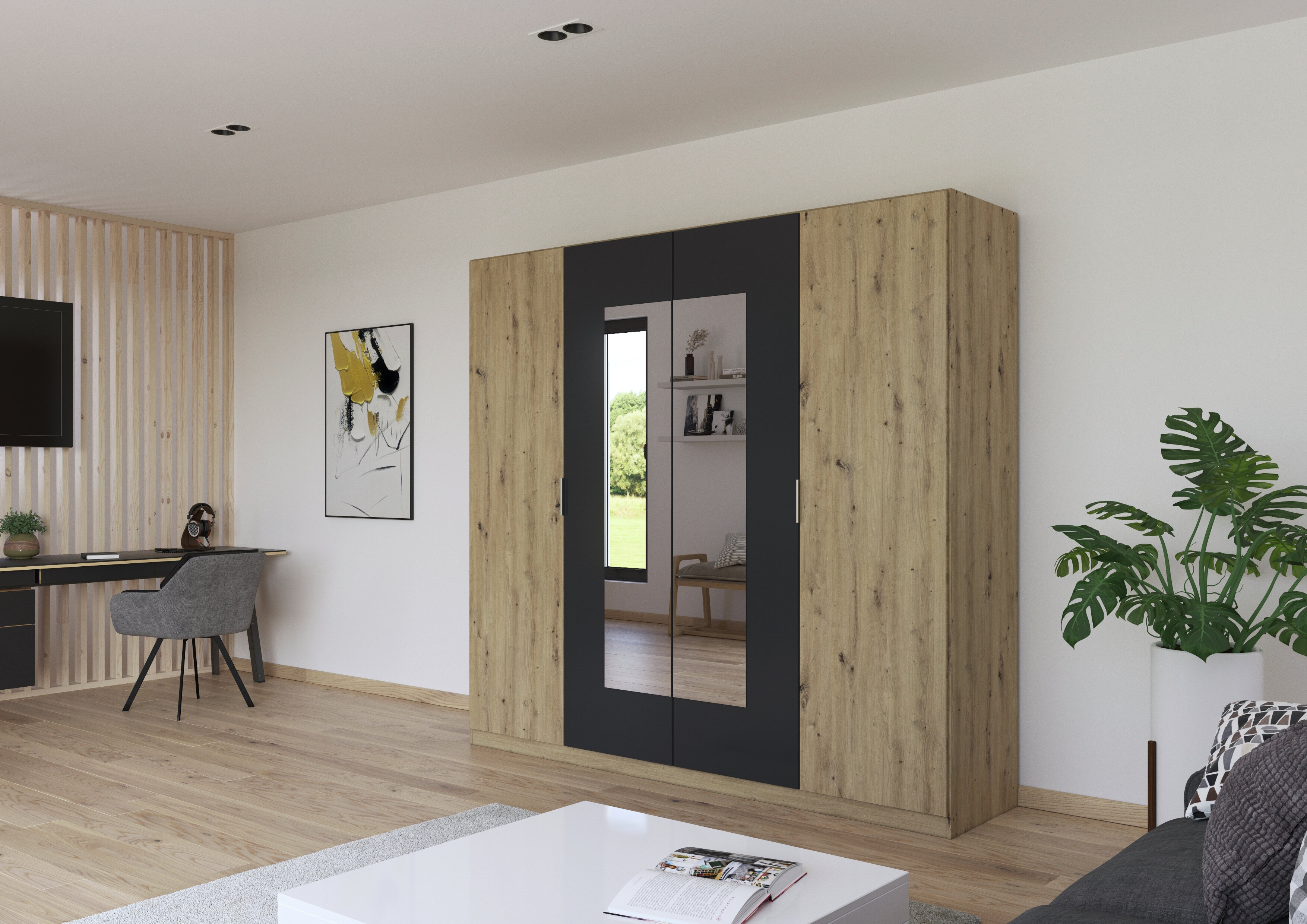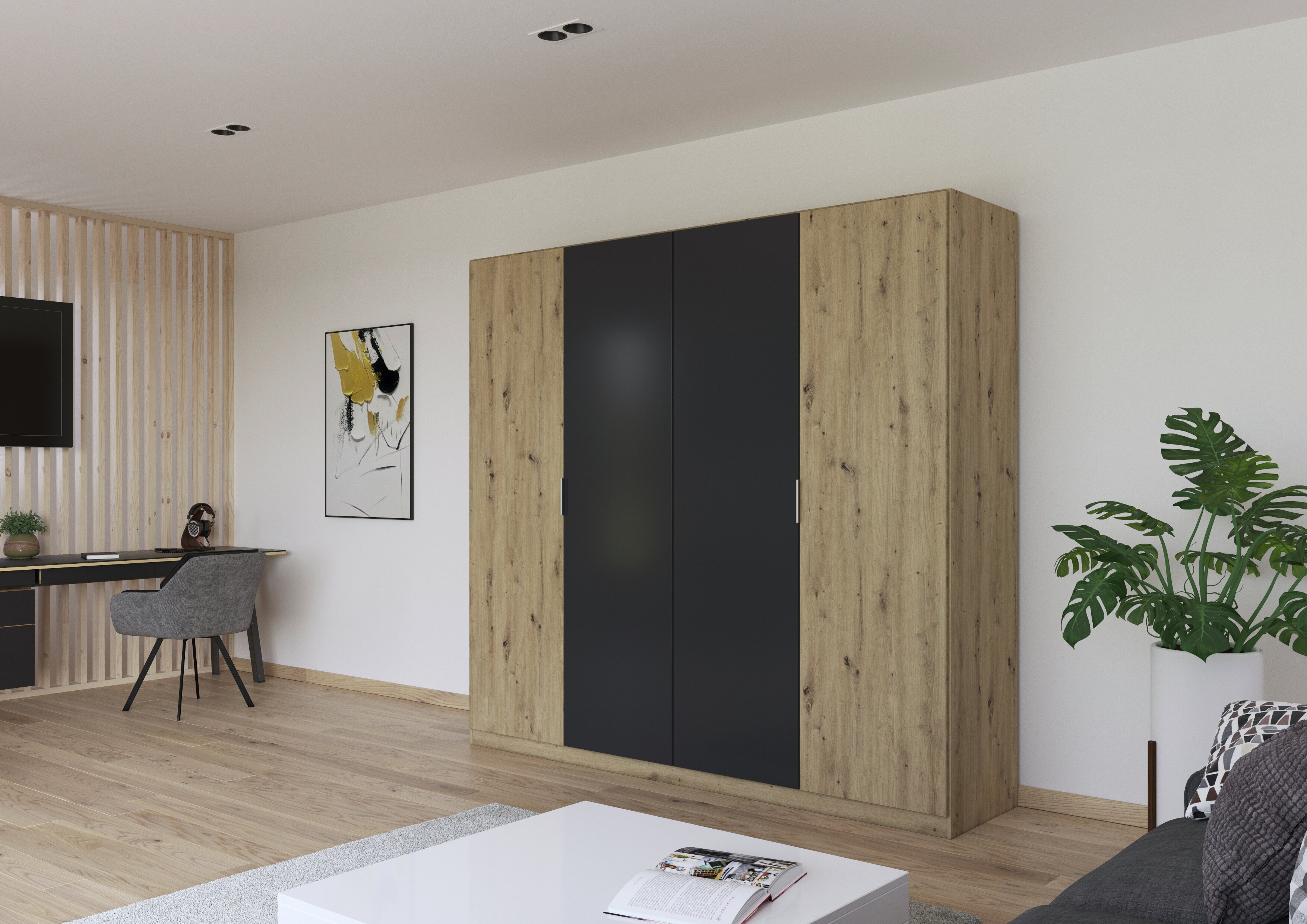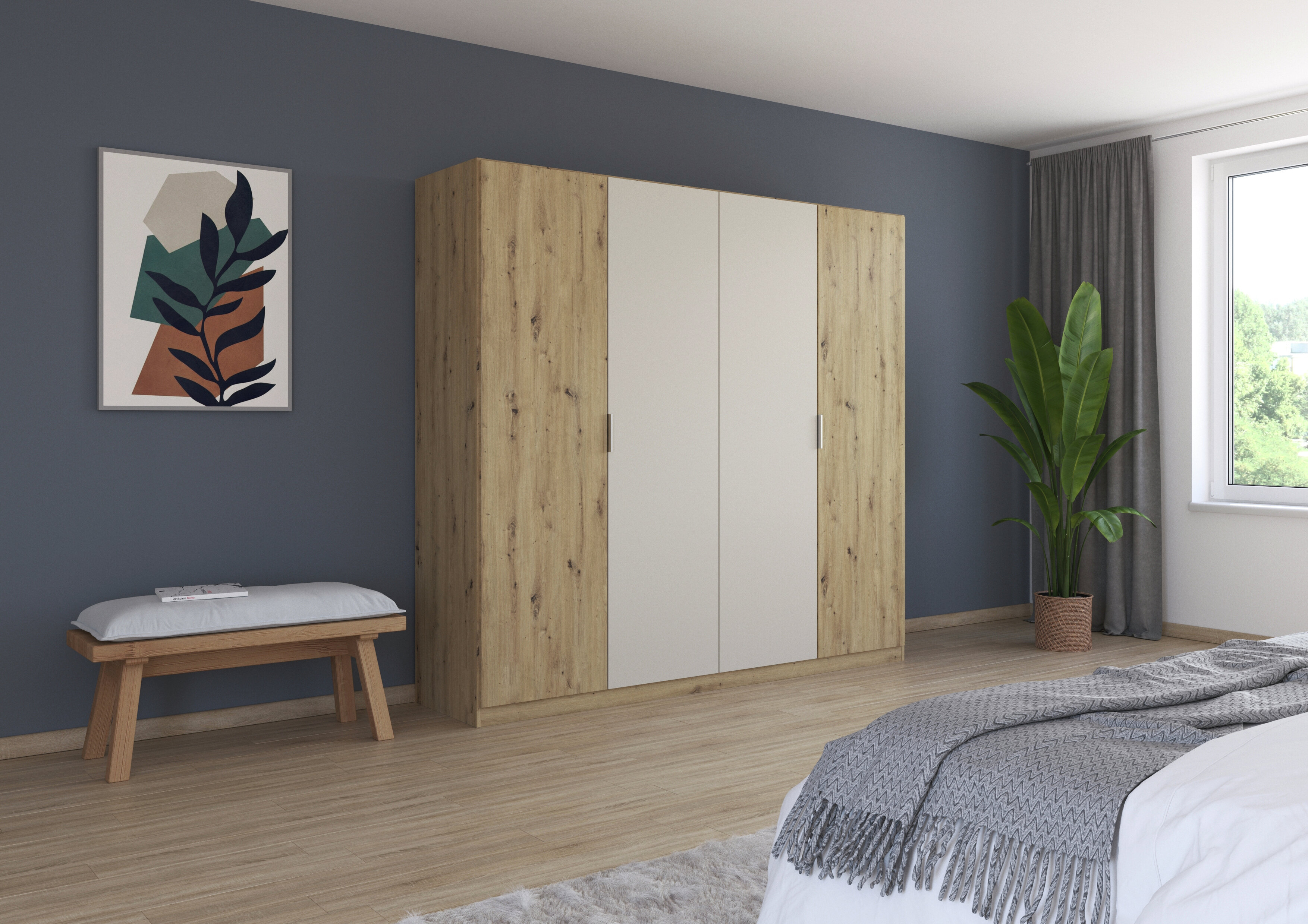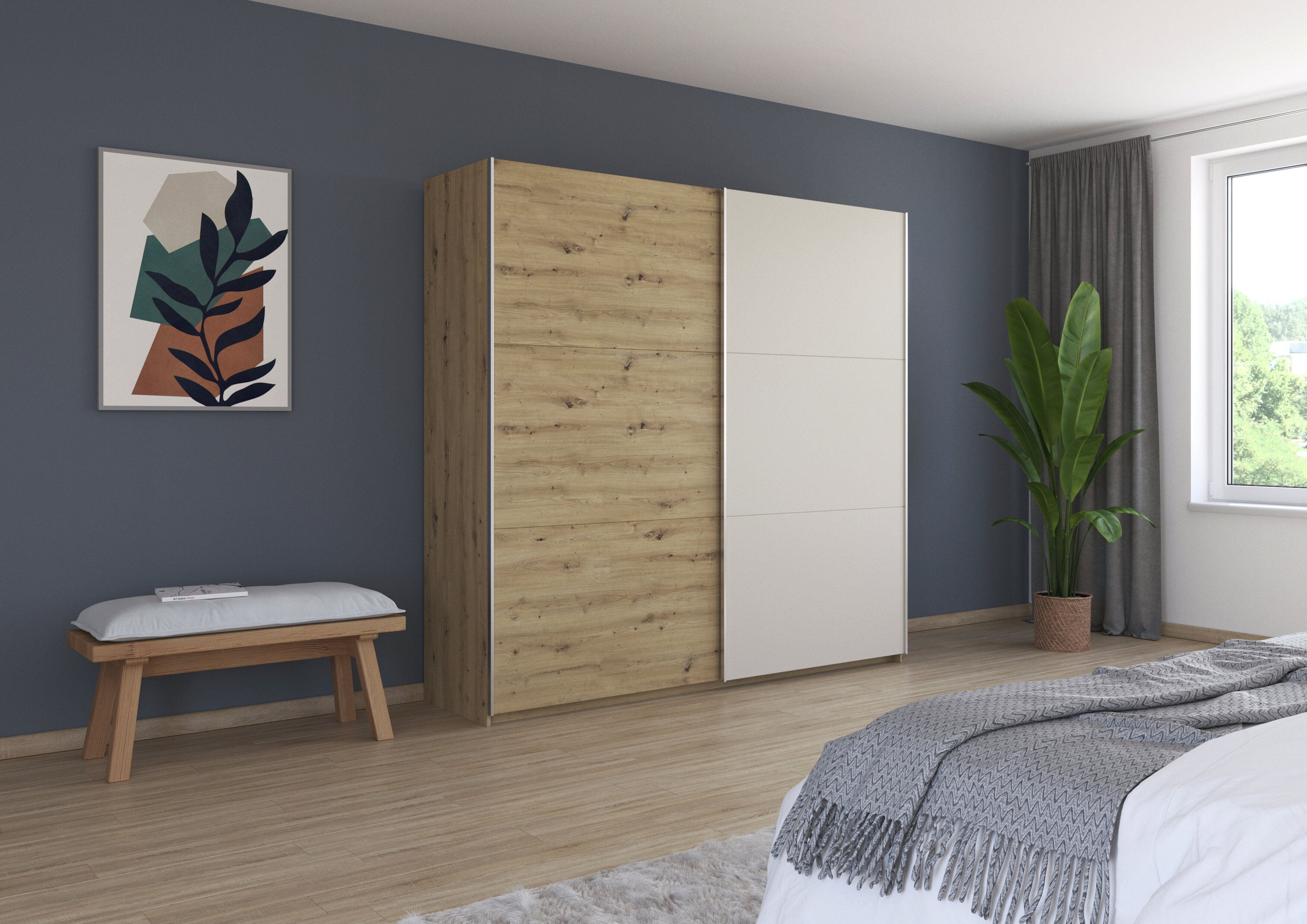 Das moderne Schlafzimmer Monza umfasst eine Bettanlage mit hängenden Nachttischen, Drehtüren- und Schwebetürenschränke und für noch mehr Stauraum auch passende Kommoden. Es präsentiert sich in einem zeitlosen und wohnlichen Design. Eine breite Auswahl an Farbkombinationen aus warmen Dekor-Druck Eiche Artisan sowie klassischen Farben in Alpinweiß, Grau-metallic und Champagner ermöglichen ein Schlafzimmer-Look ganz nach deinem Geschmack.