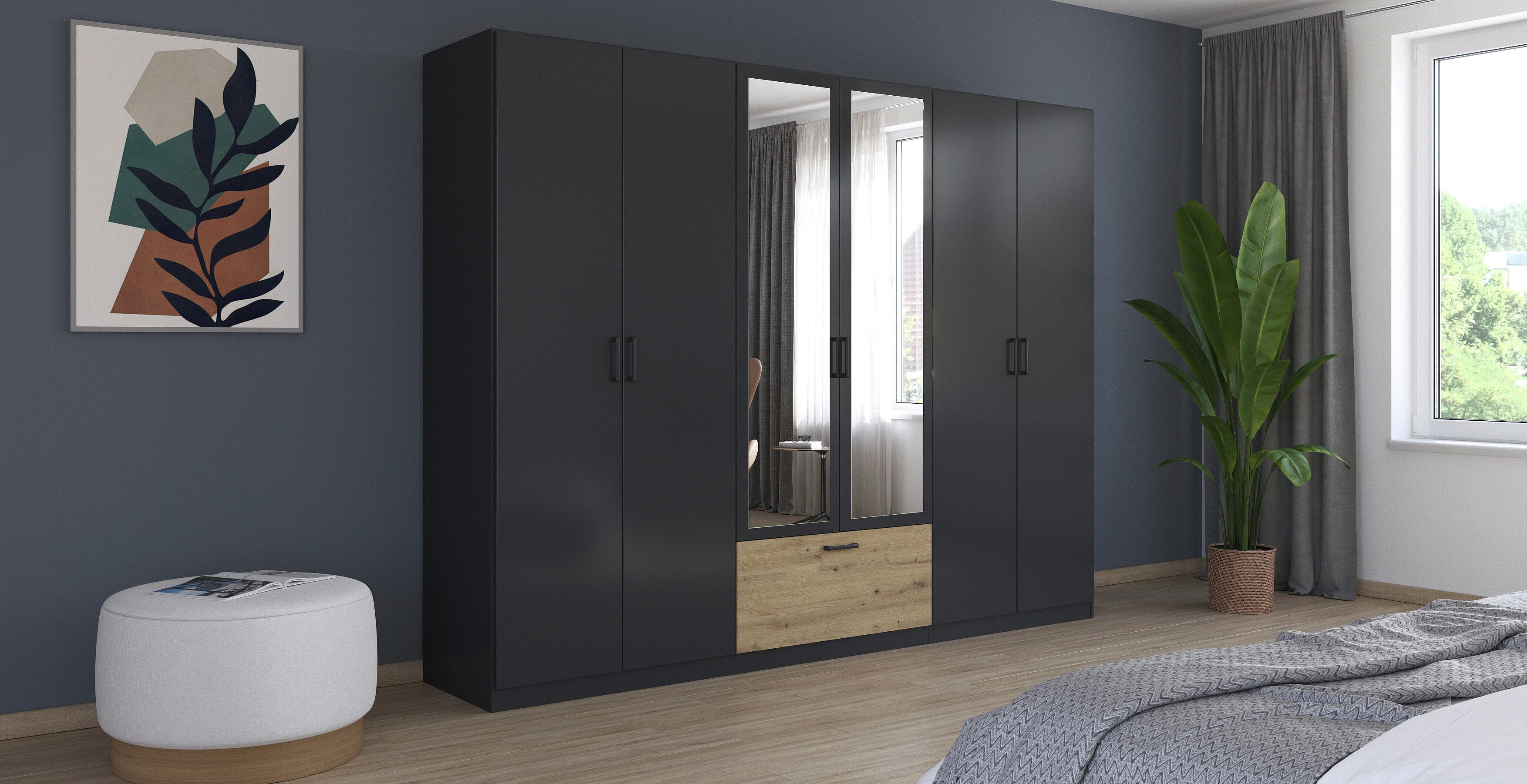 Berücksichtige die Platzierung des Schranks im Raum, um zu vermeiden, dass direktes Sonnenlicht reflektiert wird und Blendungen entstehen. Spiegeltüren am Kleiderschrank können den Raum optisch vergrößern, sollten aber so positioniert werden, dass sie harmonisch ins Raumkonzept passen.