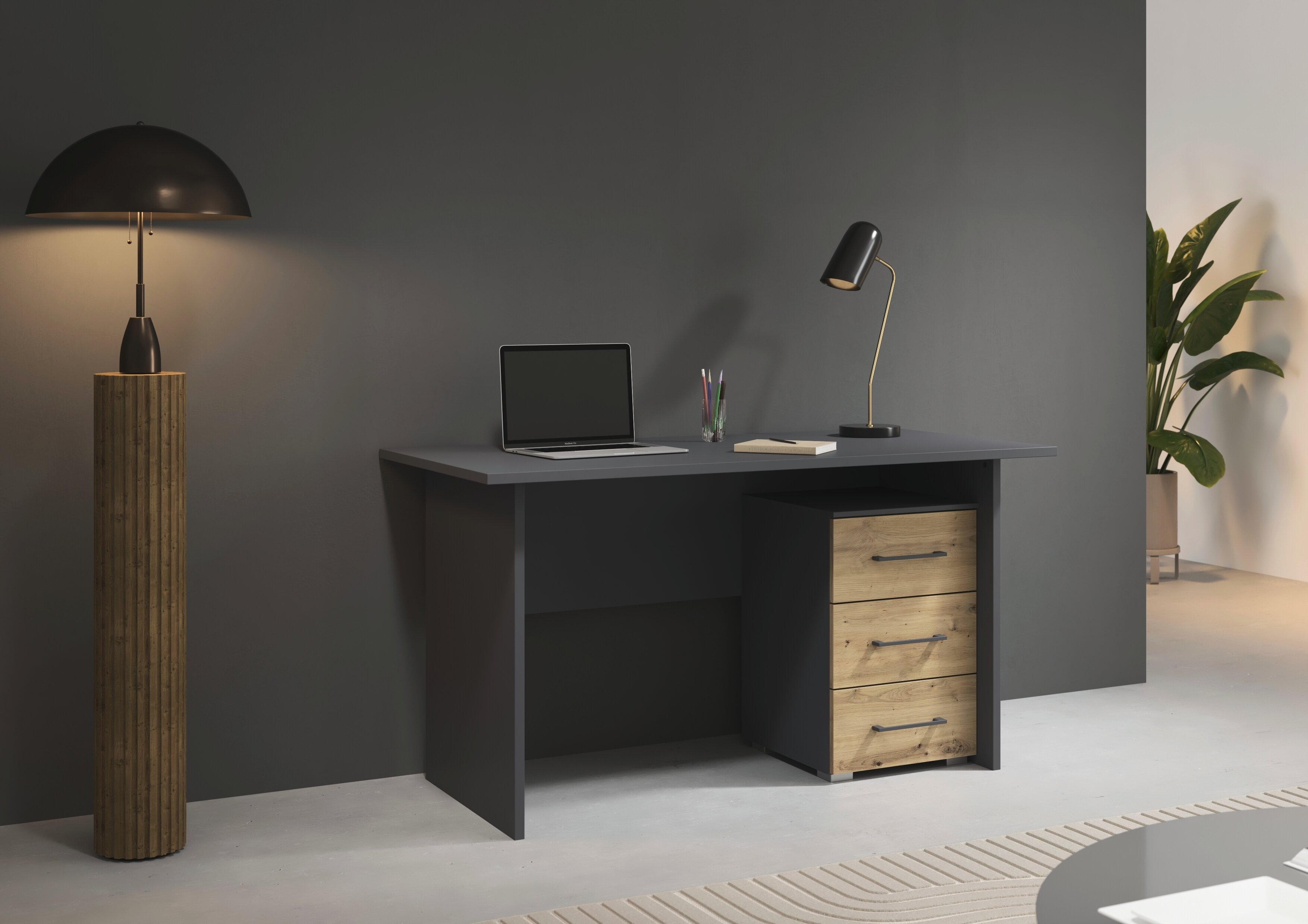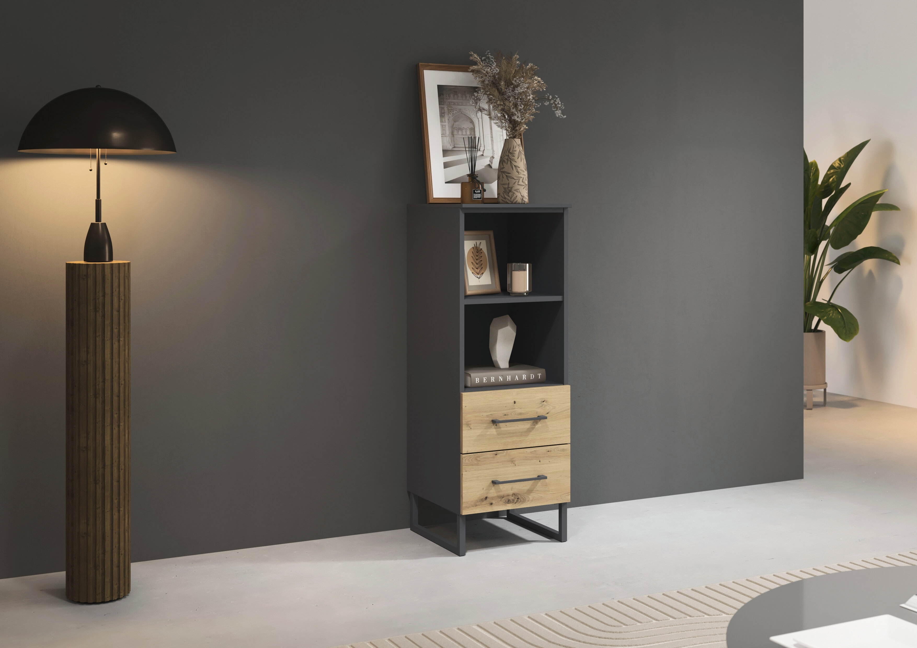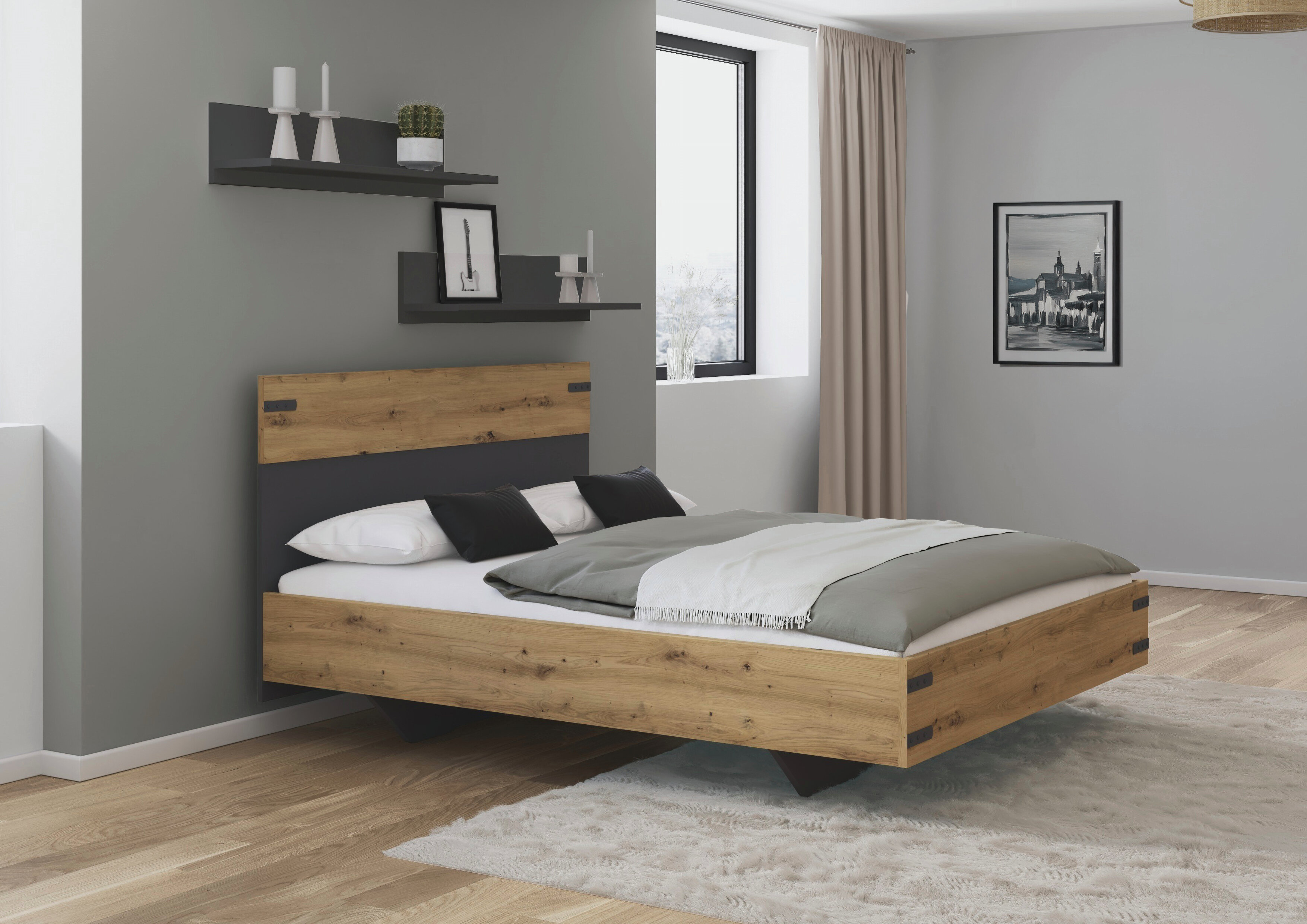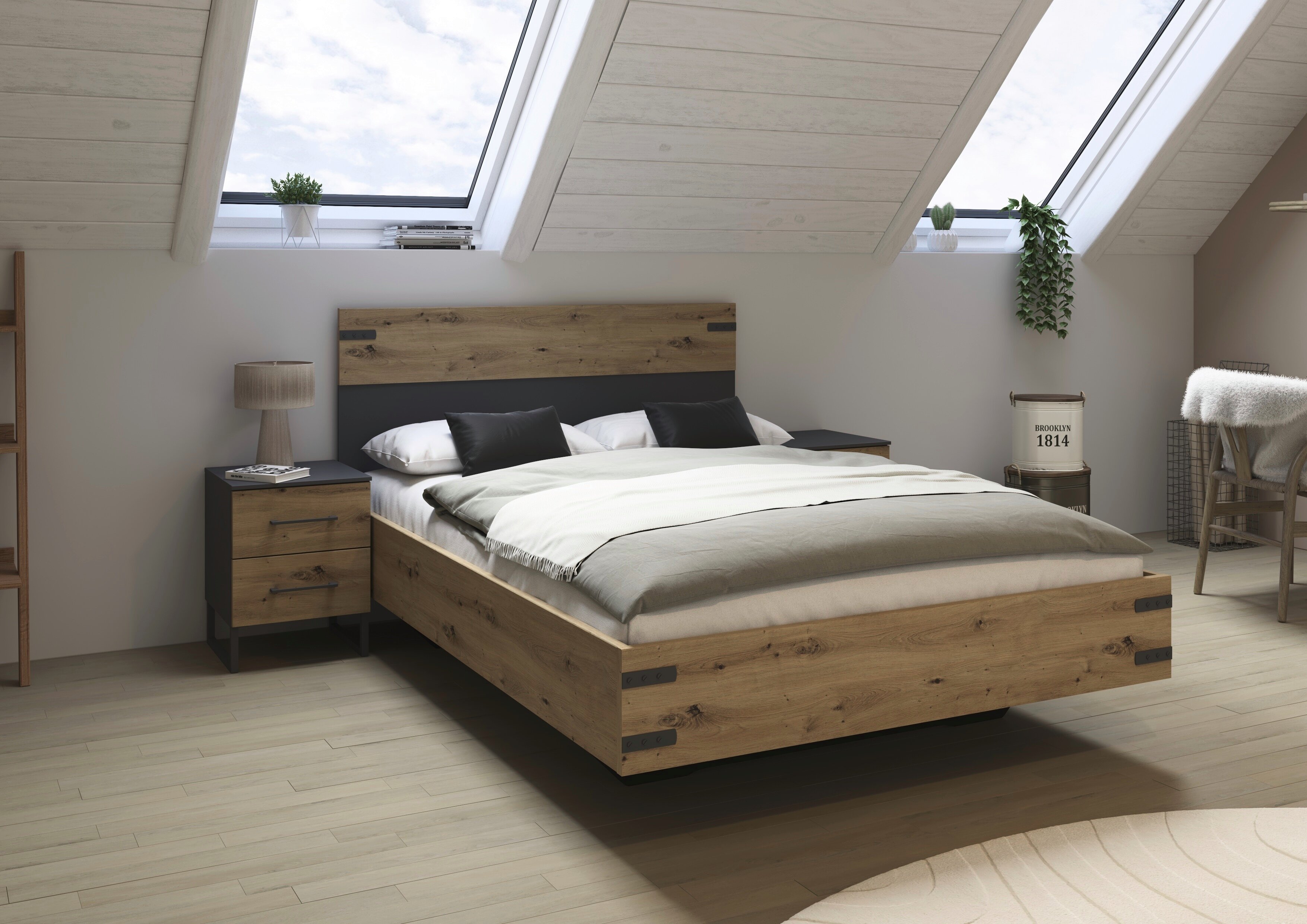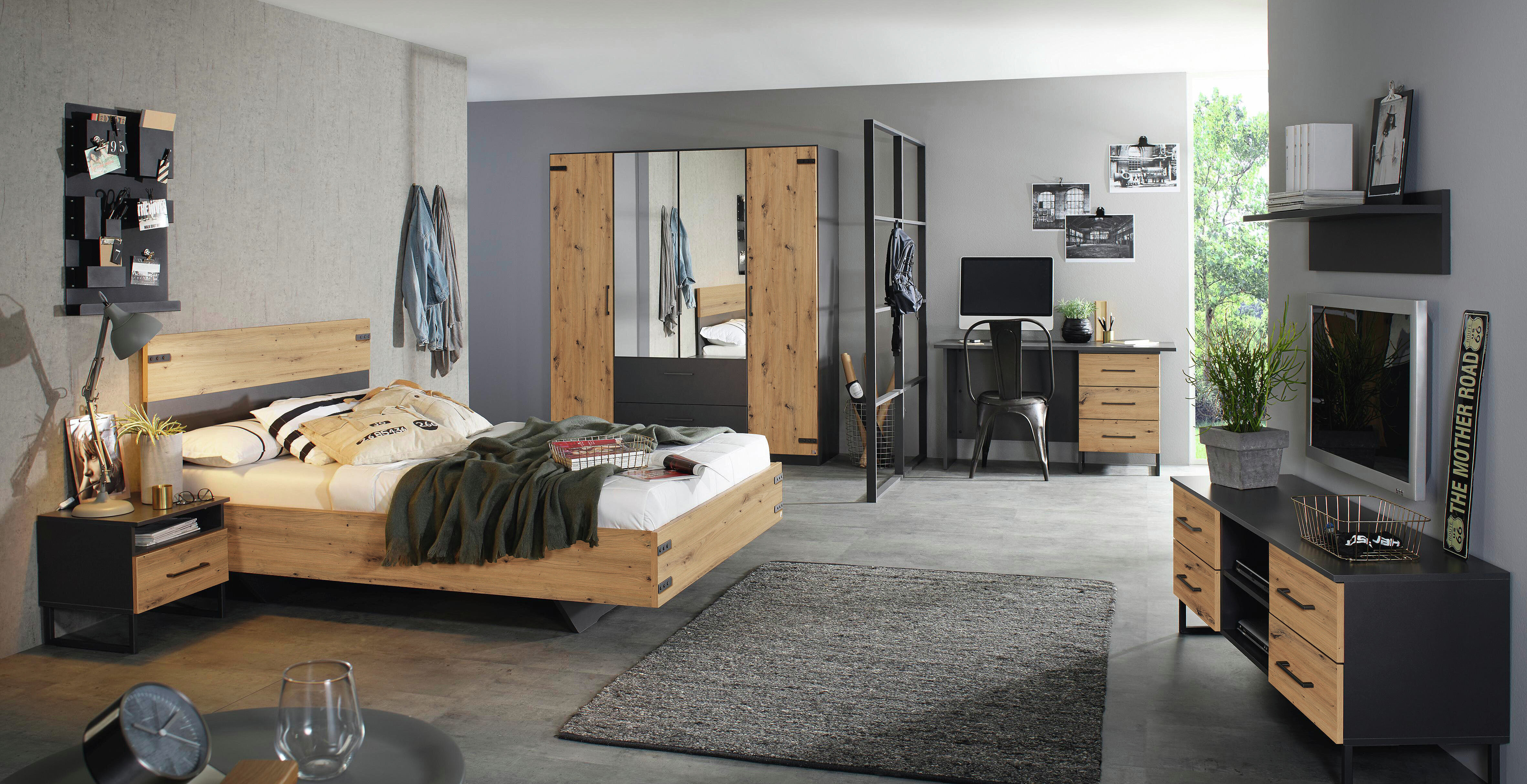 Oberflächen in dunklem graumetallic werden bei der Jugendzimmer-Serie Butte mit attraktivem Eiche-Holzdekor kombiniert. So entsteht eine angesagte Optik im Industrial-Look. Komplettiert wird der raue Style mit ansprechenden Applikationen in graumetallic: formschöne Metall-Griffe und Metall-Füße in Kufen-Form sowie Türscharnier-Applikationen werden zum Hingucker.