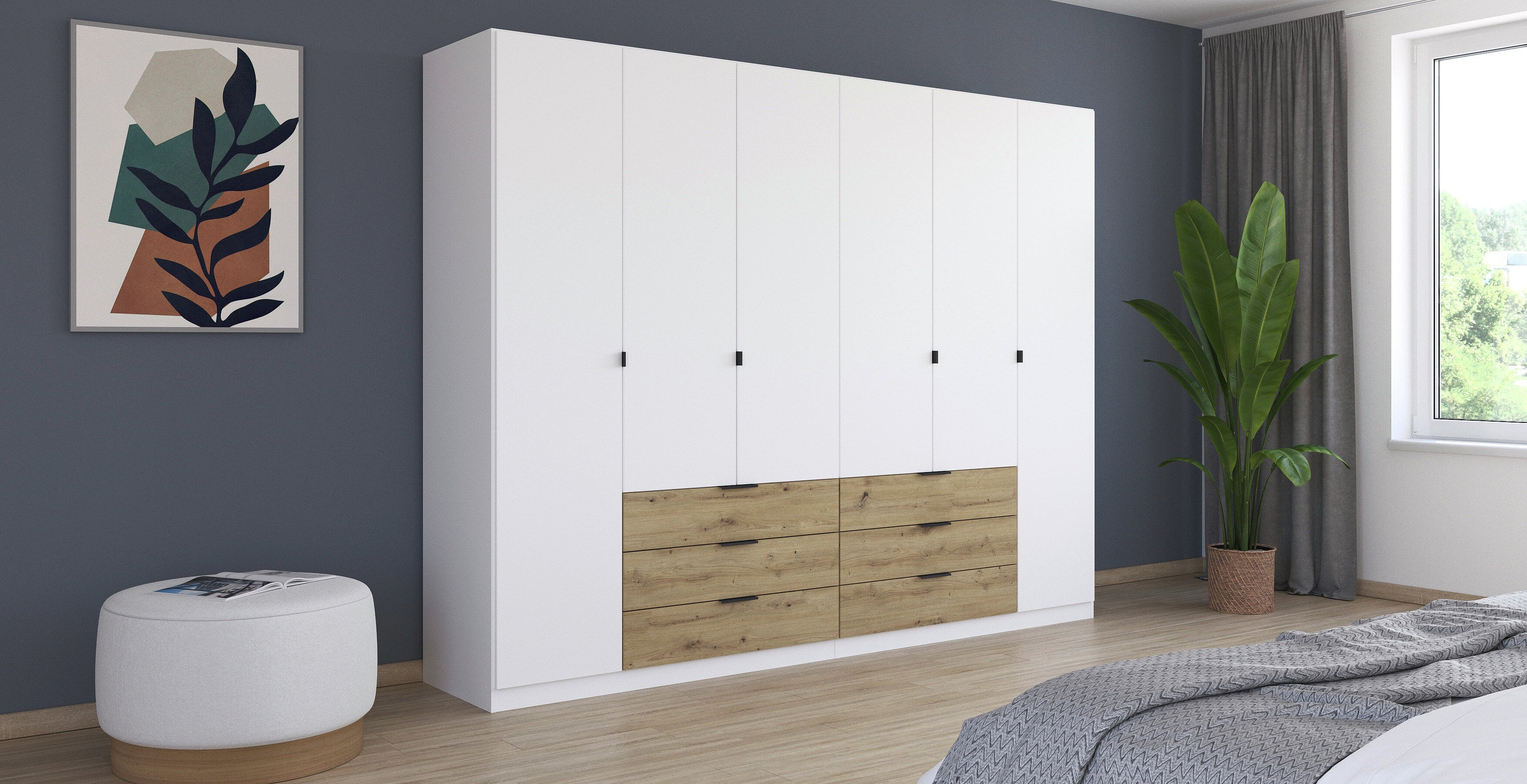 Schränke im skandinavischen Stil zeichnen sich durch ihre schlichte Eleganz und Funktionalität aus. Helle Farben, klare Linien und minimalistische Designs dominieren diesen Look. Materialien wie helles Massivholz und weiße Oberflächen schaffen eine freundliche und einladende Atmosphäre. Diese Drehtürenschränke sind ideal für moderne, minimalistische Schlafzimmer, in denen Wert auf Licht und Gemütlichkeit gelegt wird.