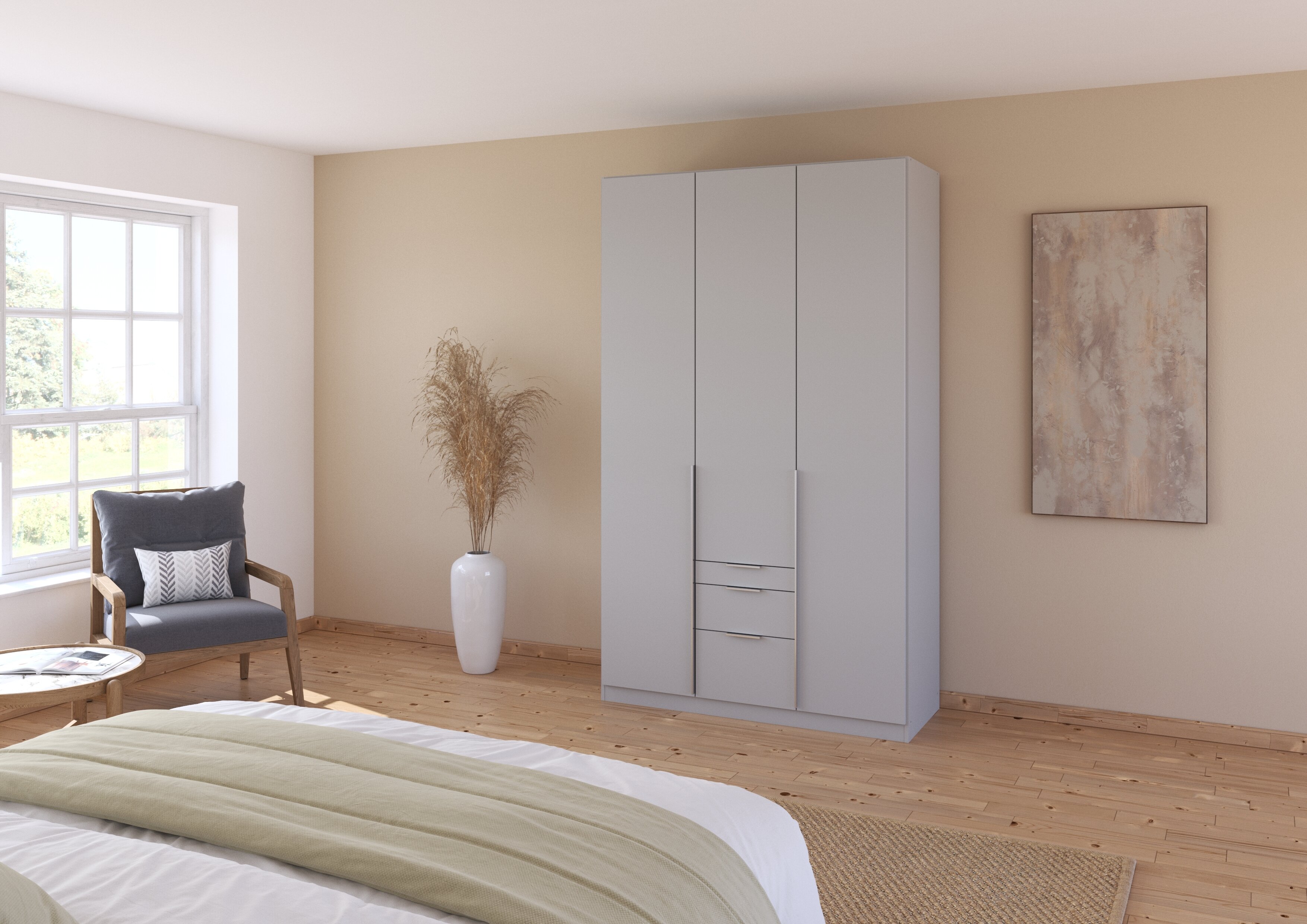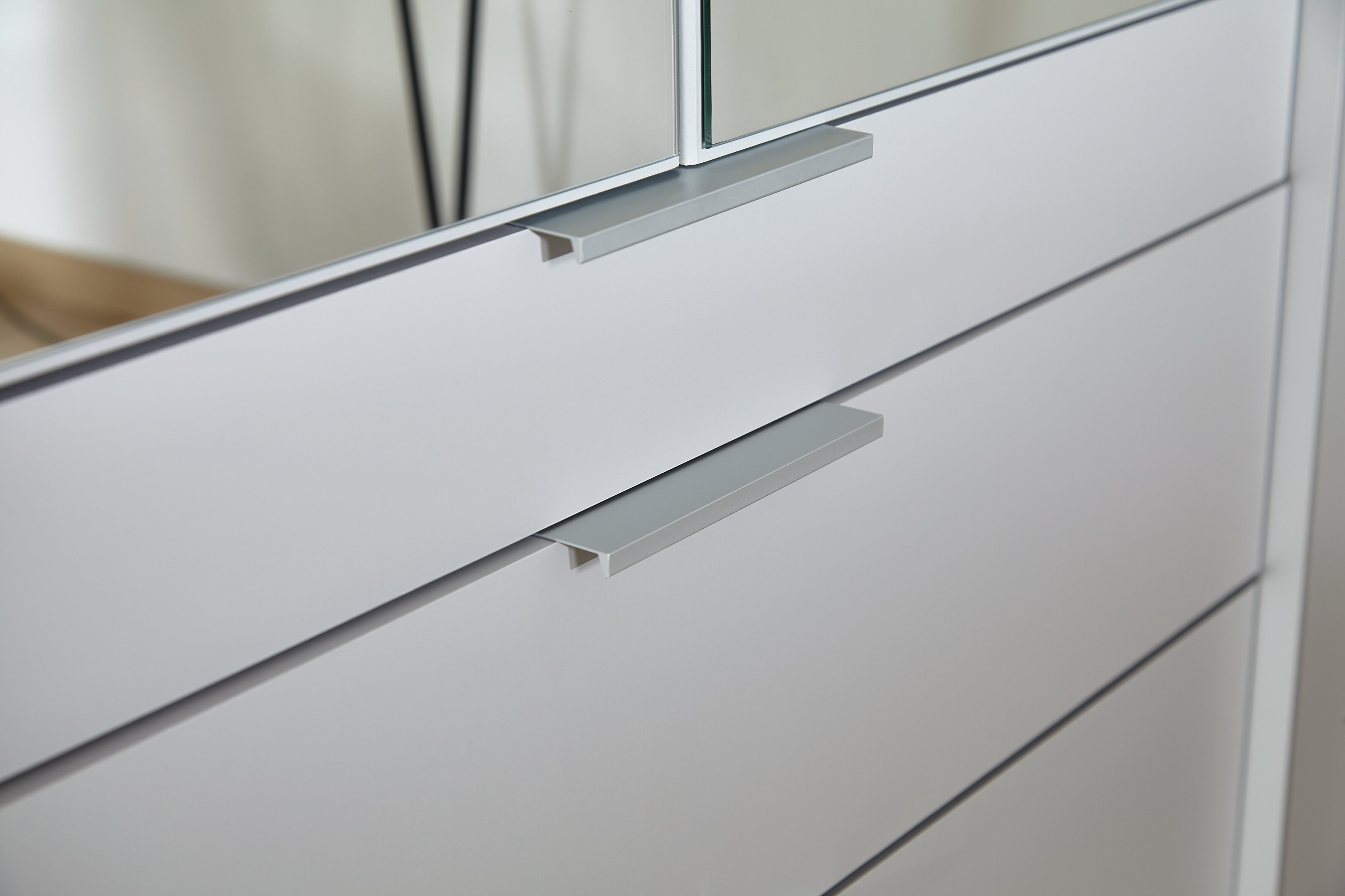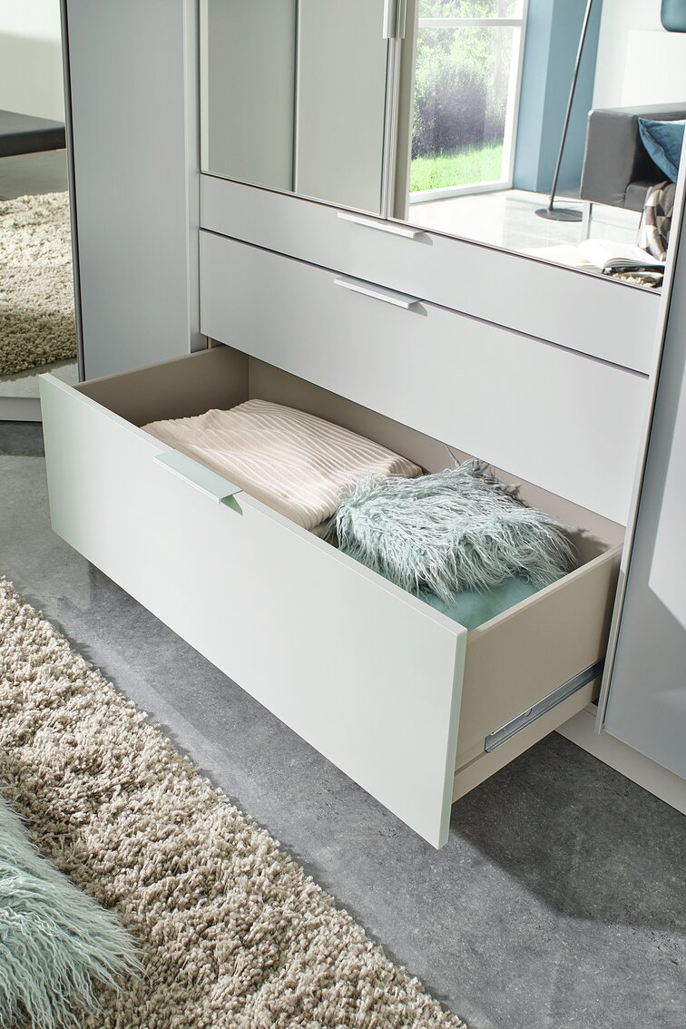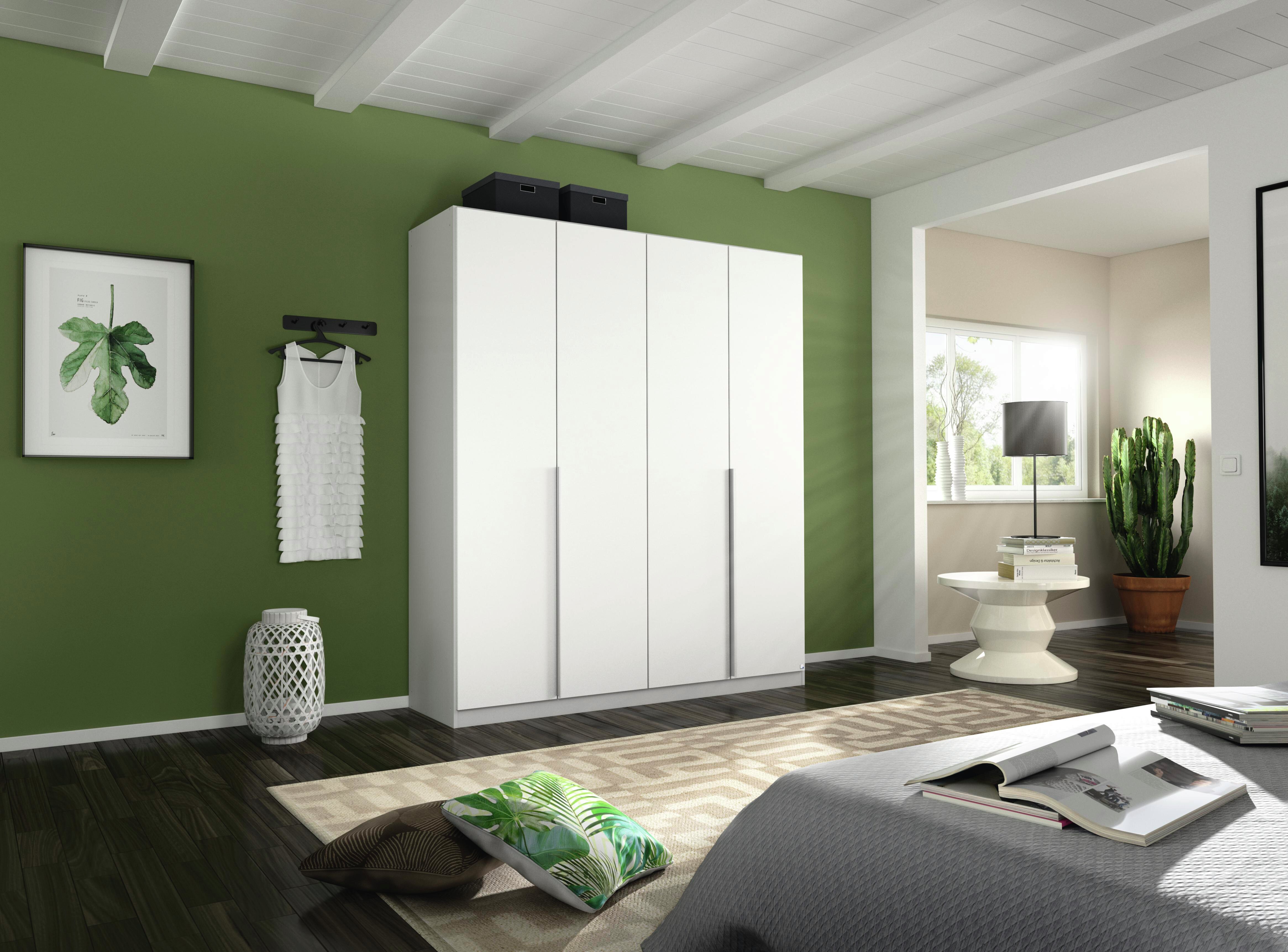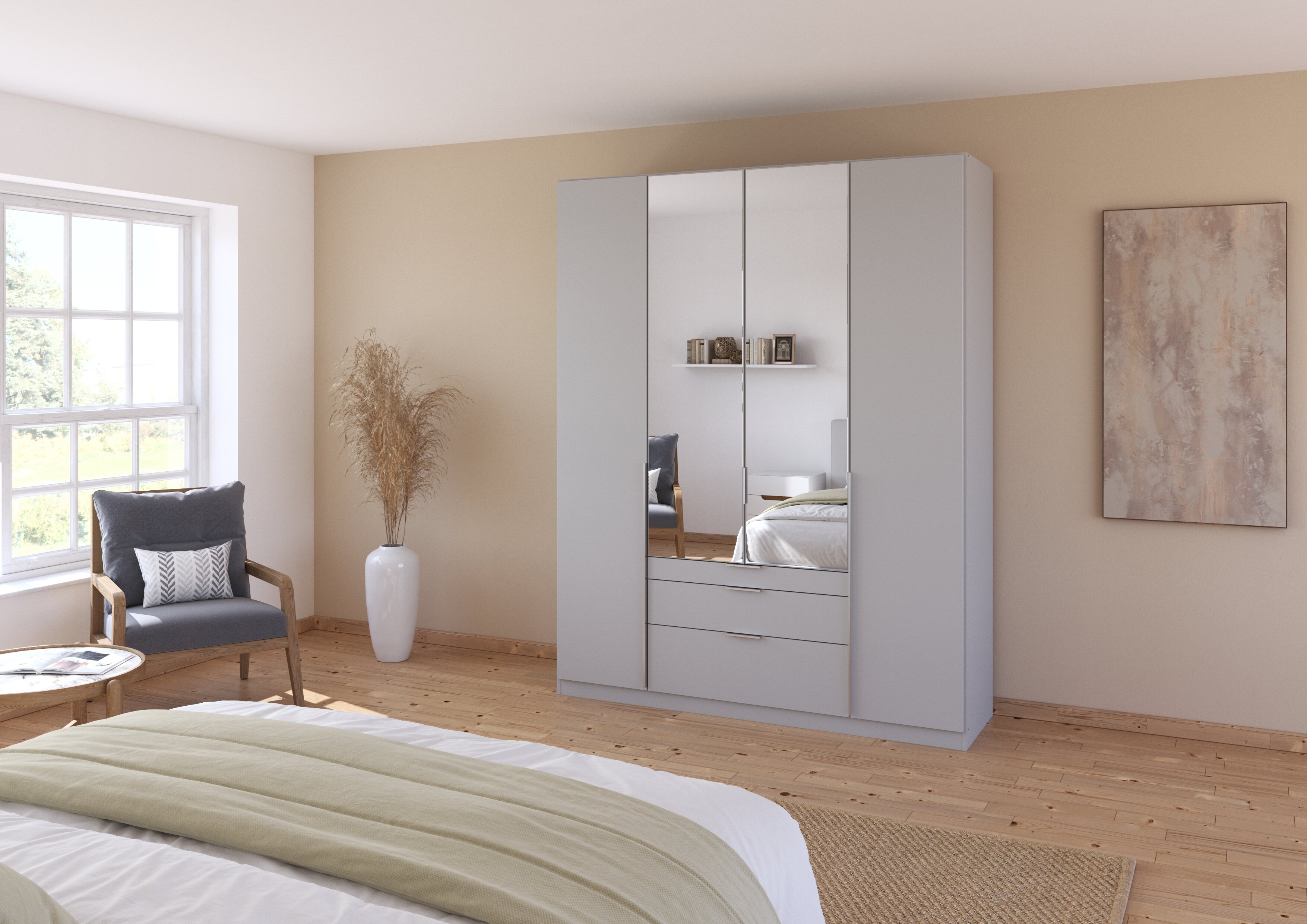 Die geräumigen Kleiderschränke der Serie Alabama von rauch wirken zeitlos und elegant zugleich. Hier werden klassische Drehtüren mit modernen Farbzusammenstellungen und einer eleganten, langen Griffleiste kombiniert.