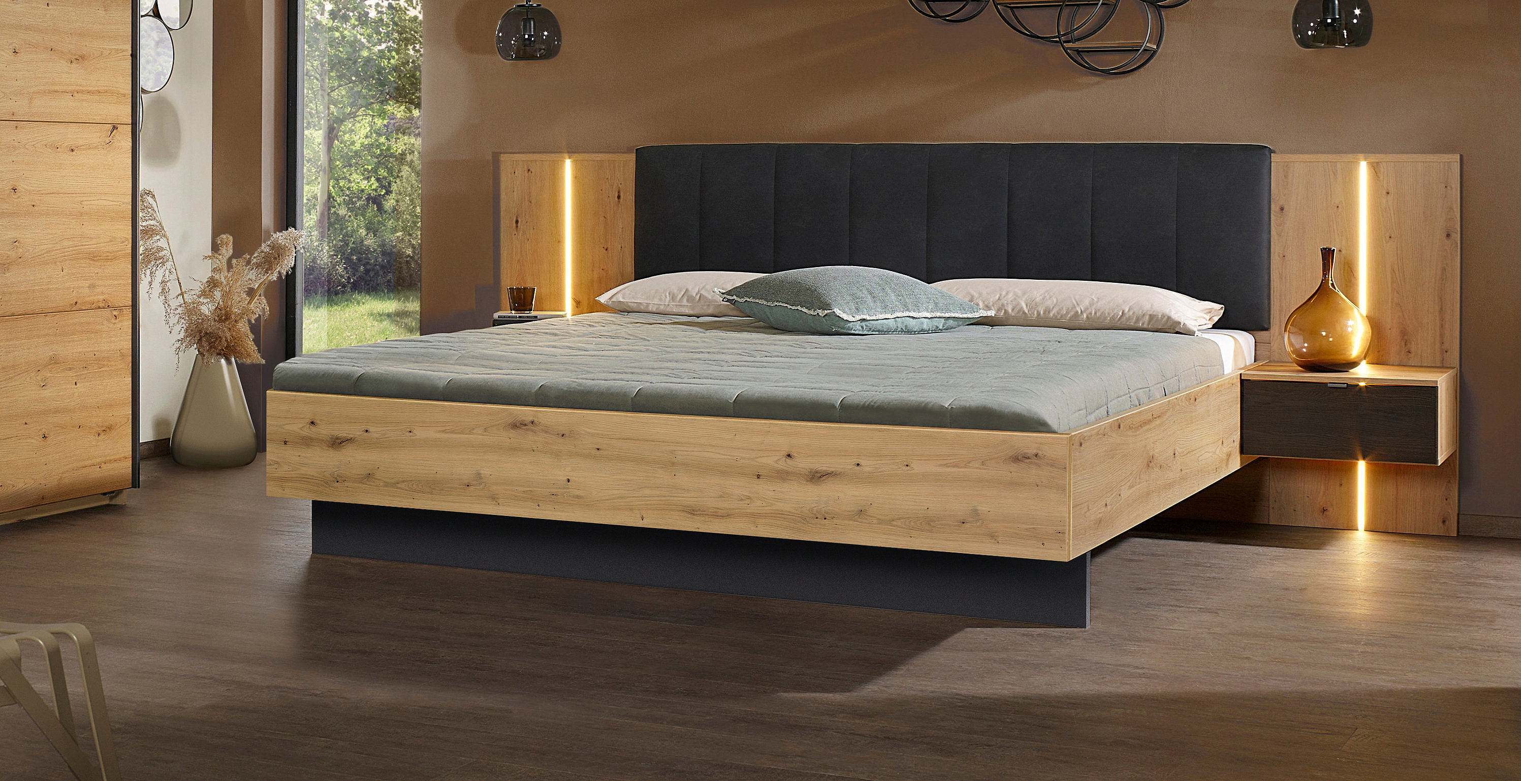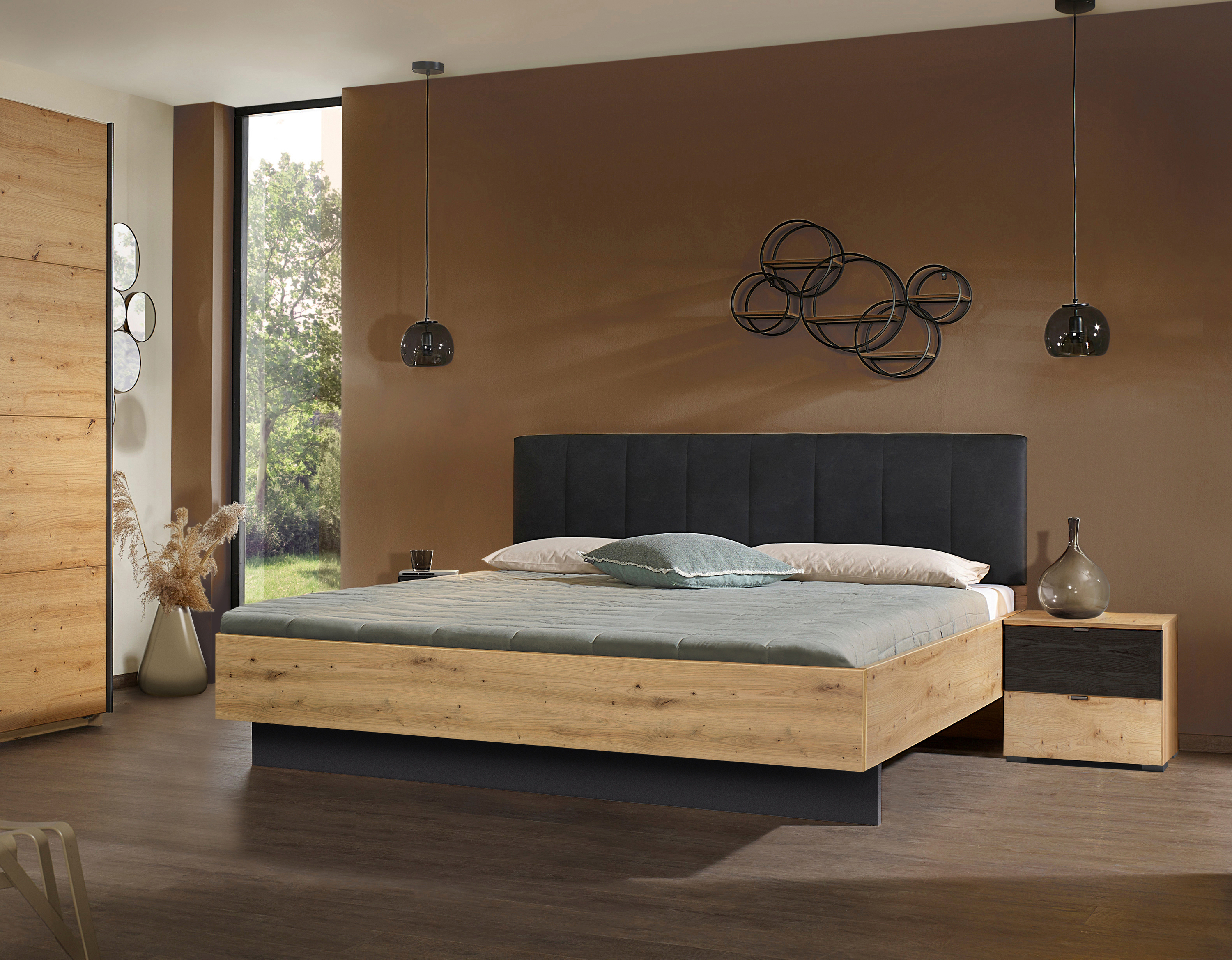 Ein optisches Highlight ist die Bettanlage mit ihrem schwarz gepolstertem Kopfteil in Lederoptik. Verfügbar in zwei verschiedenen Breiten passt das Bett in sämtliche Raumkonzepte. Abgerundet wird der Look durch die beiden Paneelnachttische mit stimmungsvoller Beleuchtung inklusive.