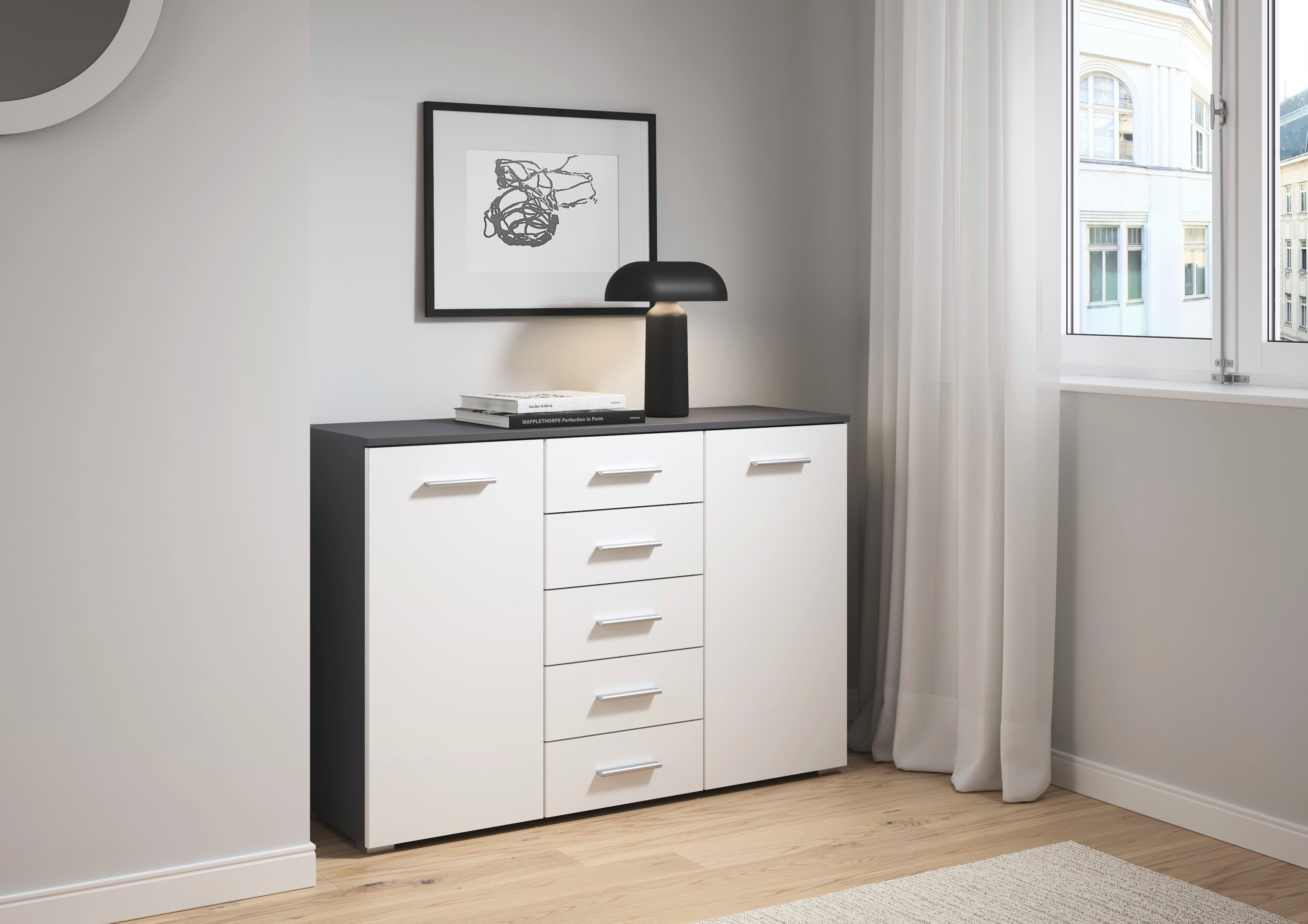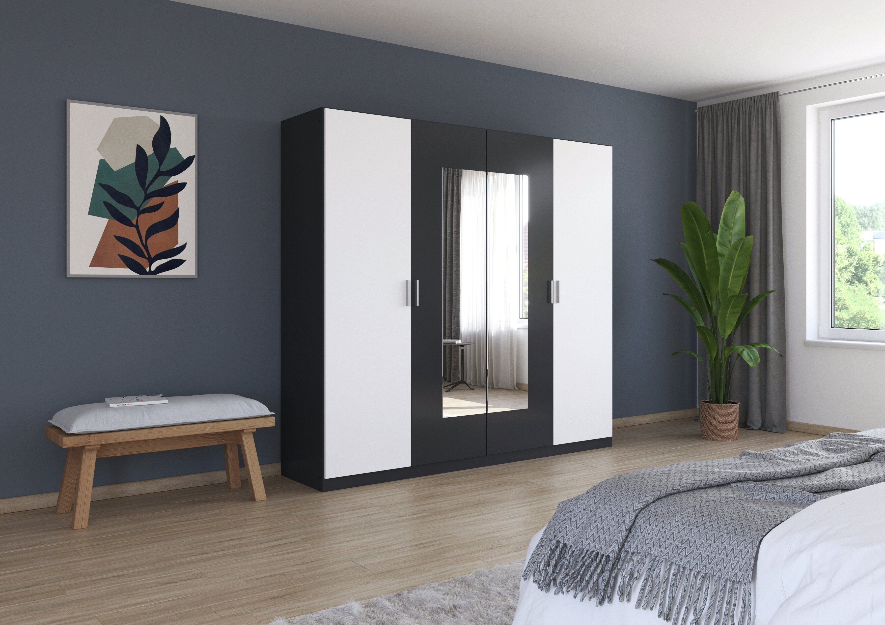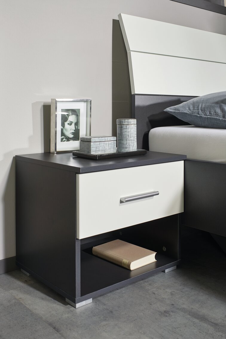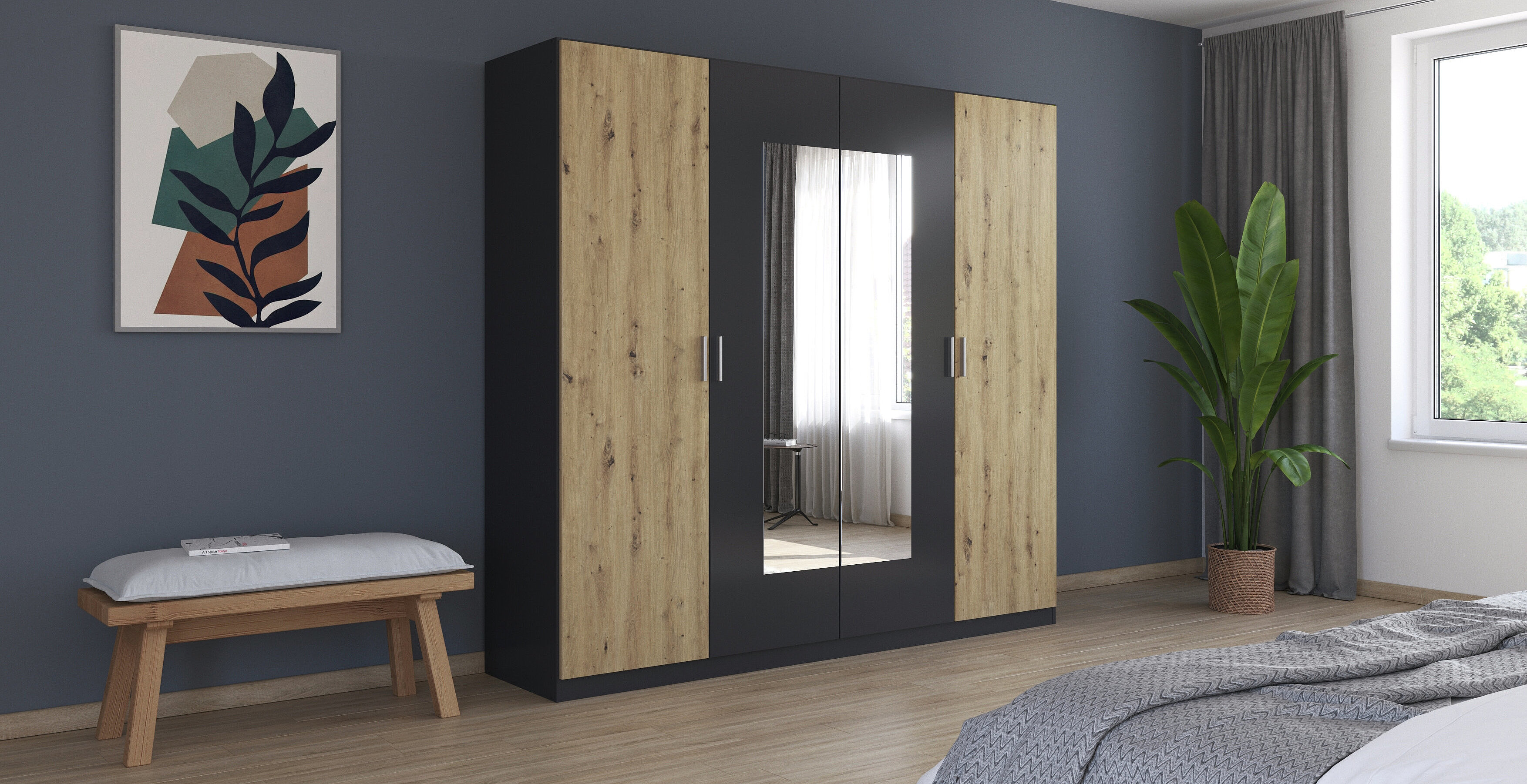 Das Schlafzimmer-Programm Borneo überzeugt mit seinem erfrischenden Farbmix und jeder Menge Stauraum. Die Bettanlage, bestehend aus Doppelbett und zwei Nachttischen, kannst du mit einem geräumigen Kleiderschrank, praktischen Kommoden und Rollbettkasten ergänzen. Dabei hast du die Möglichkeit, deinen Schrank mit Drehtüren oder Schwebetüren auszuwählen. Beide Tür-Varianten sind mit einem Spiegelelement ausgestattet und machen dir mit einem großzügigen Innenleben das Ordnung halten leicht. Dank der einfachen, gut durchdachten Möbel-Auswahl sind individuelle Zusammenstellungen möglich.