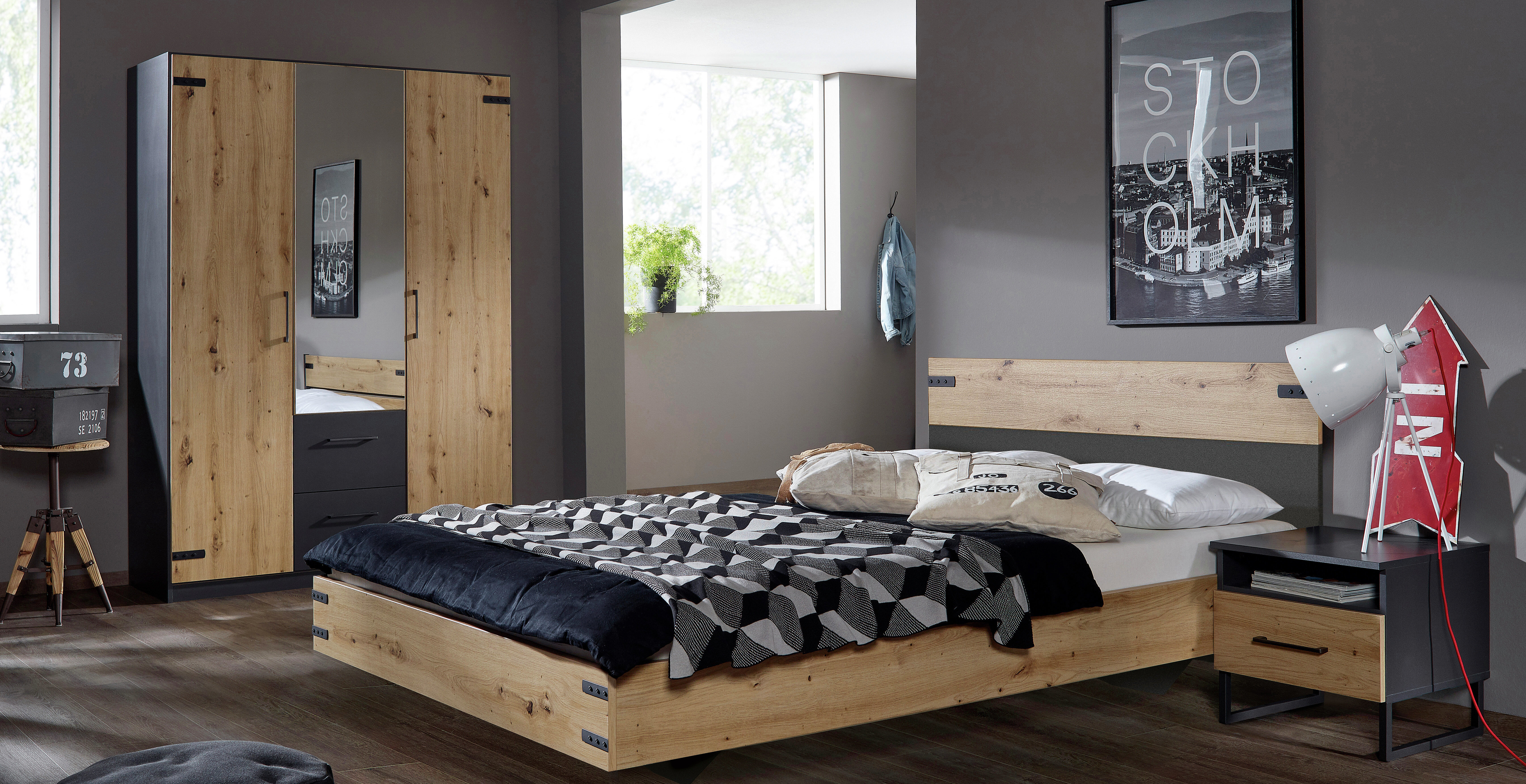 Oberflächen in dunklem graumetallic werden bei der Jugendzimmer-Serie Butte mit attraktivem Eiche-Holzdekor kombiniert. So entsteht eine angesagte Optik im Industrial-Look. Komplettiert wird der raue Style mit ansprechenden Applikationen in graumetallic: formschöne Metall-Griffe und Metall-Füße in Kufen-Form sowie Türscharnier-Applikationen werden zum Hingucker.