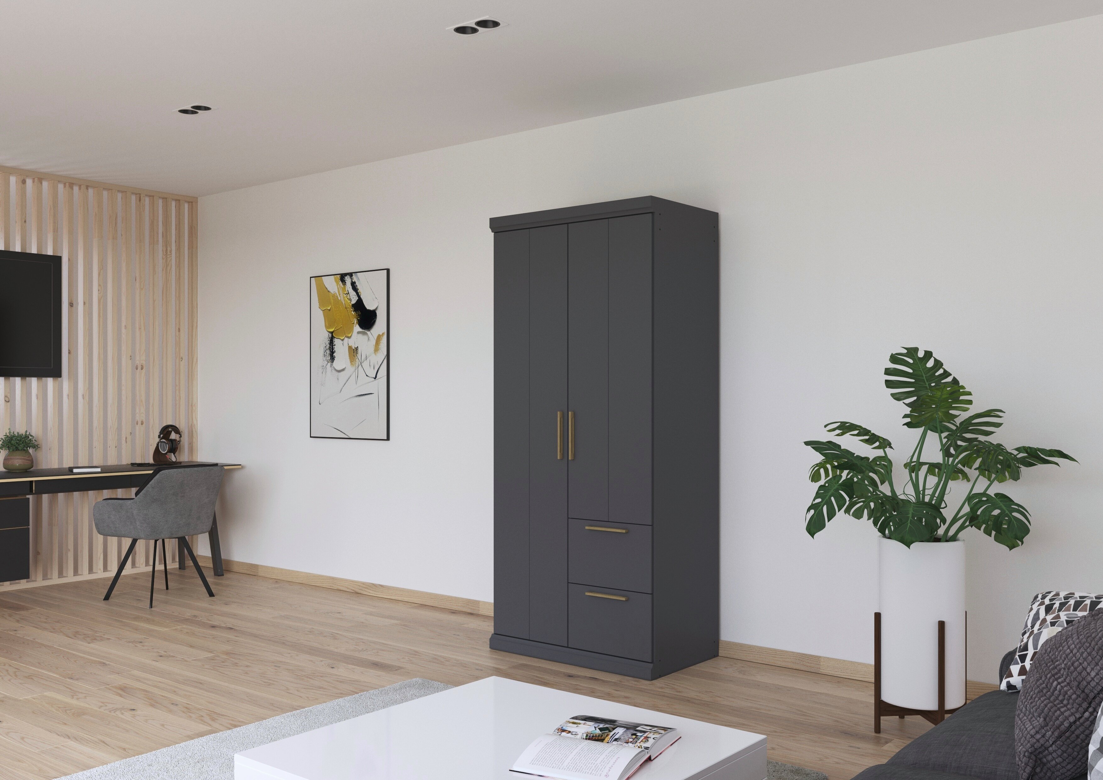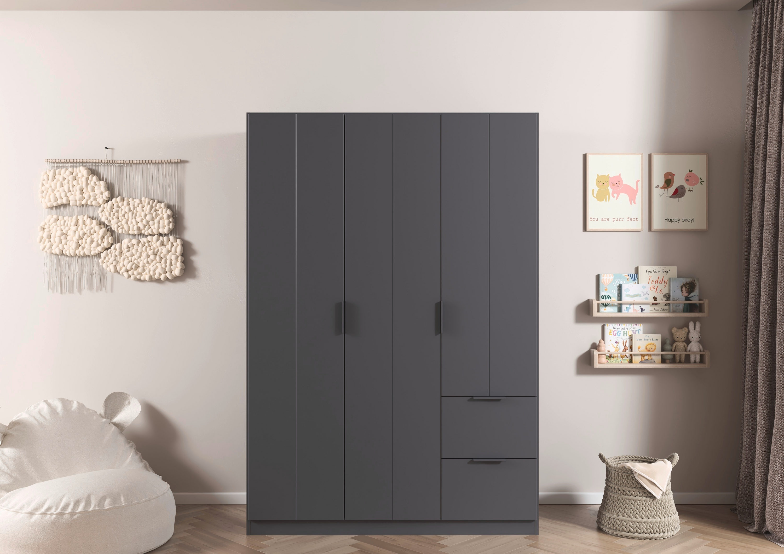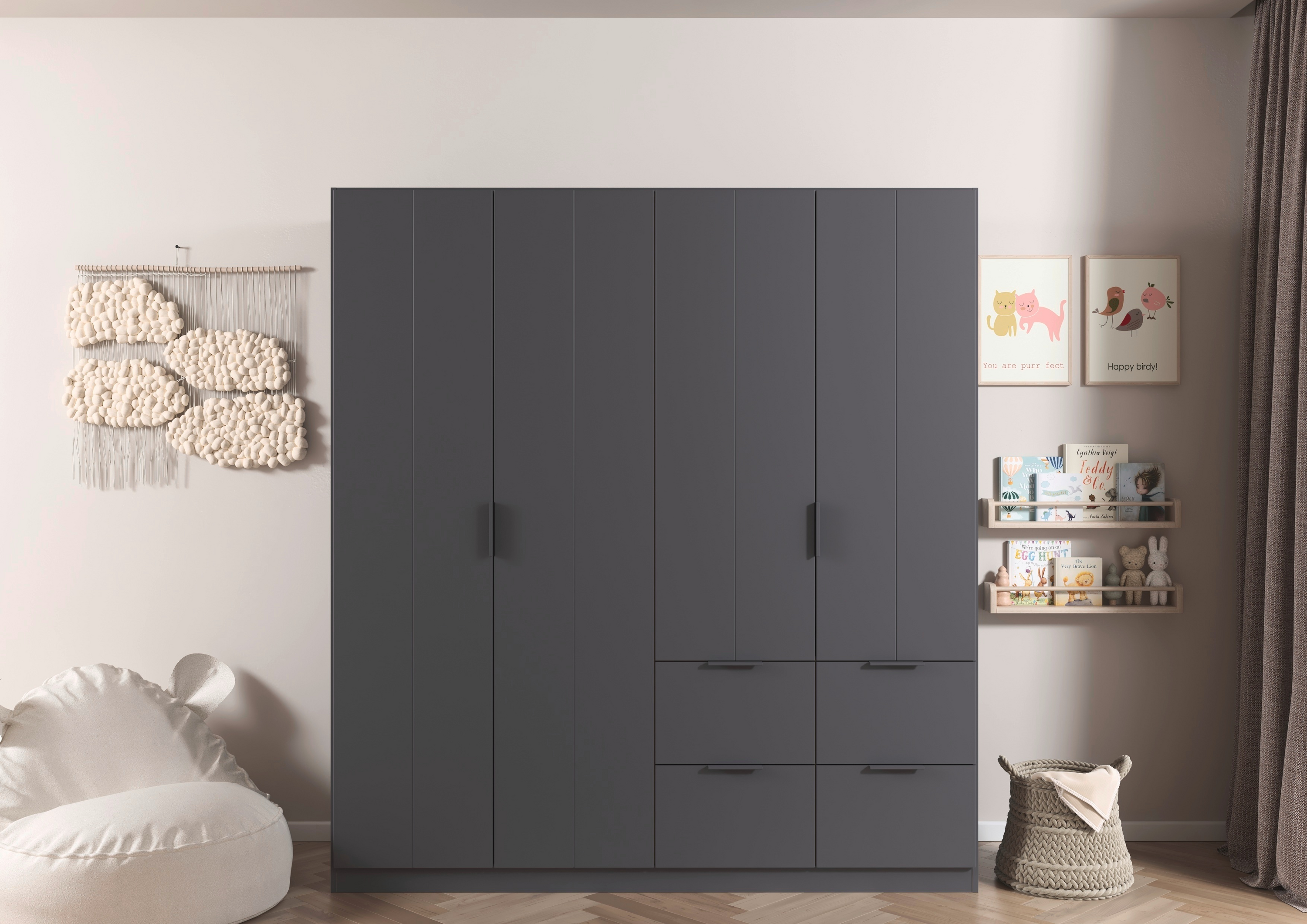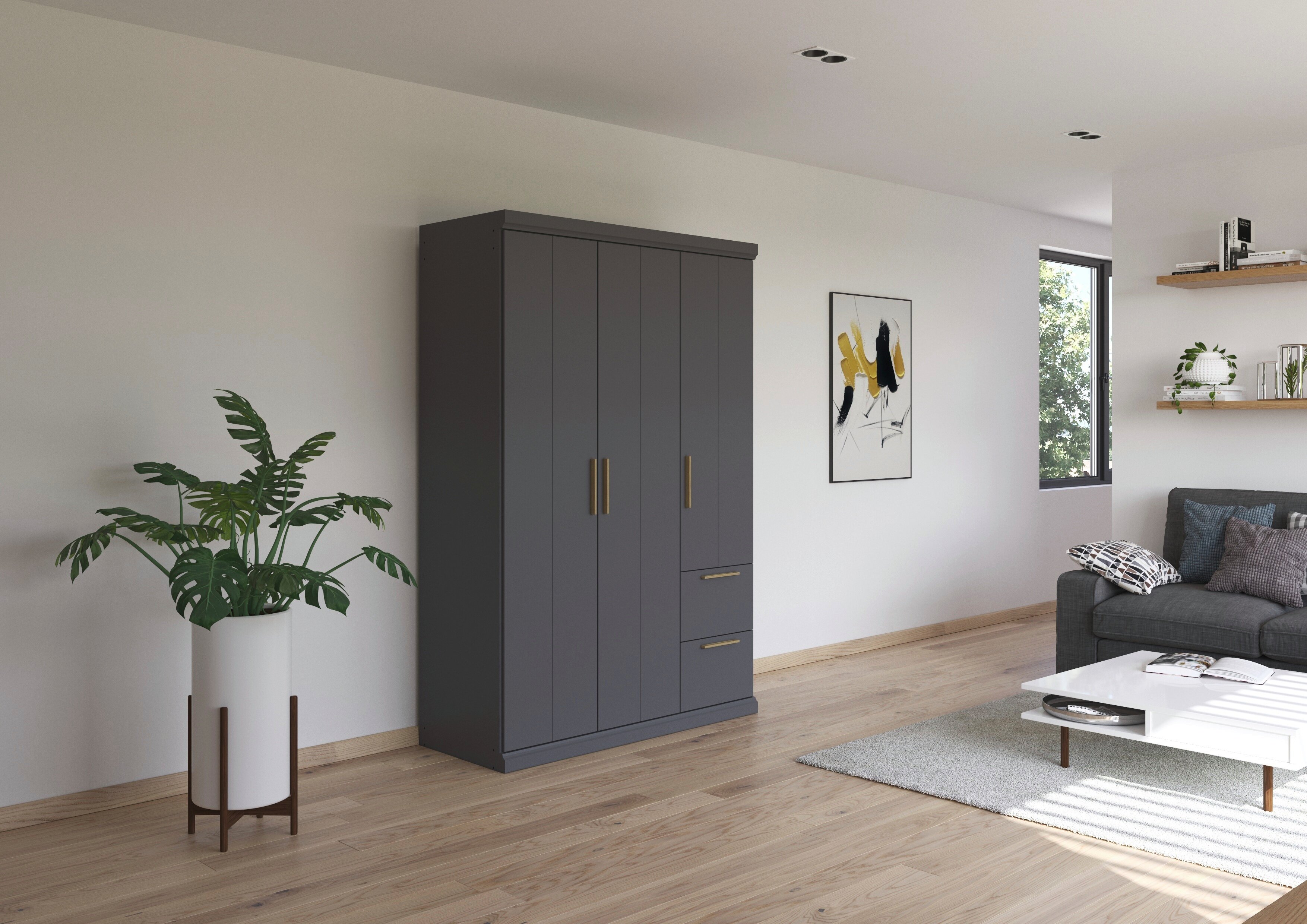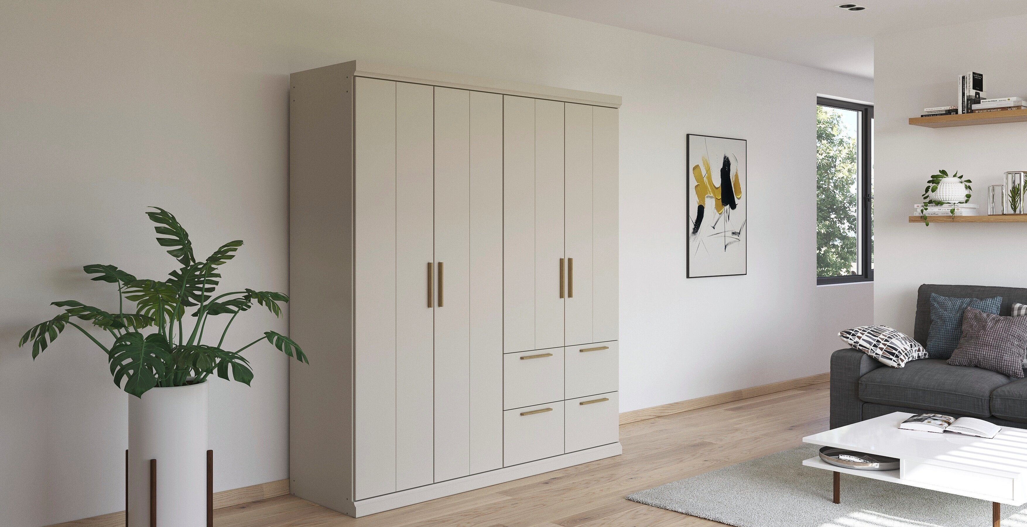 Der rauch Kleiderschrank Ella steht für ein ruhiges Design und eine Aufteilung, die dir den Alltag spürbar leichter macht. Die Front des Drehtürenschrankes wirkt ordentlich und zeitlos, während die dezenten Griffe in Holz oder Metall den Look elegant abrunden.