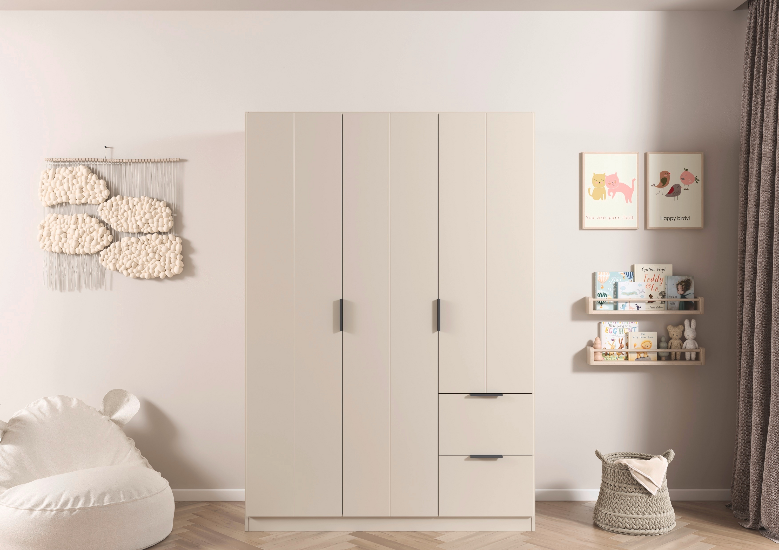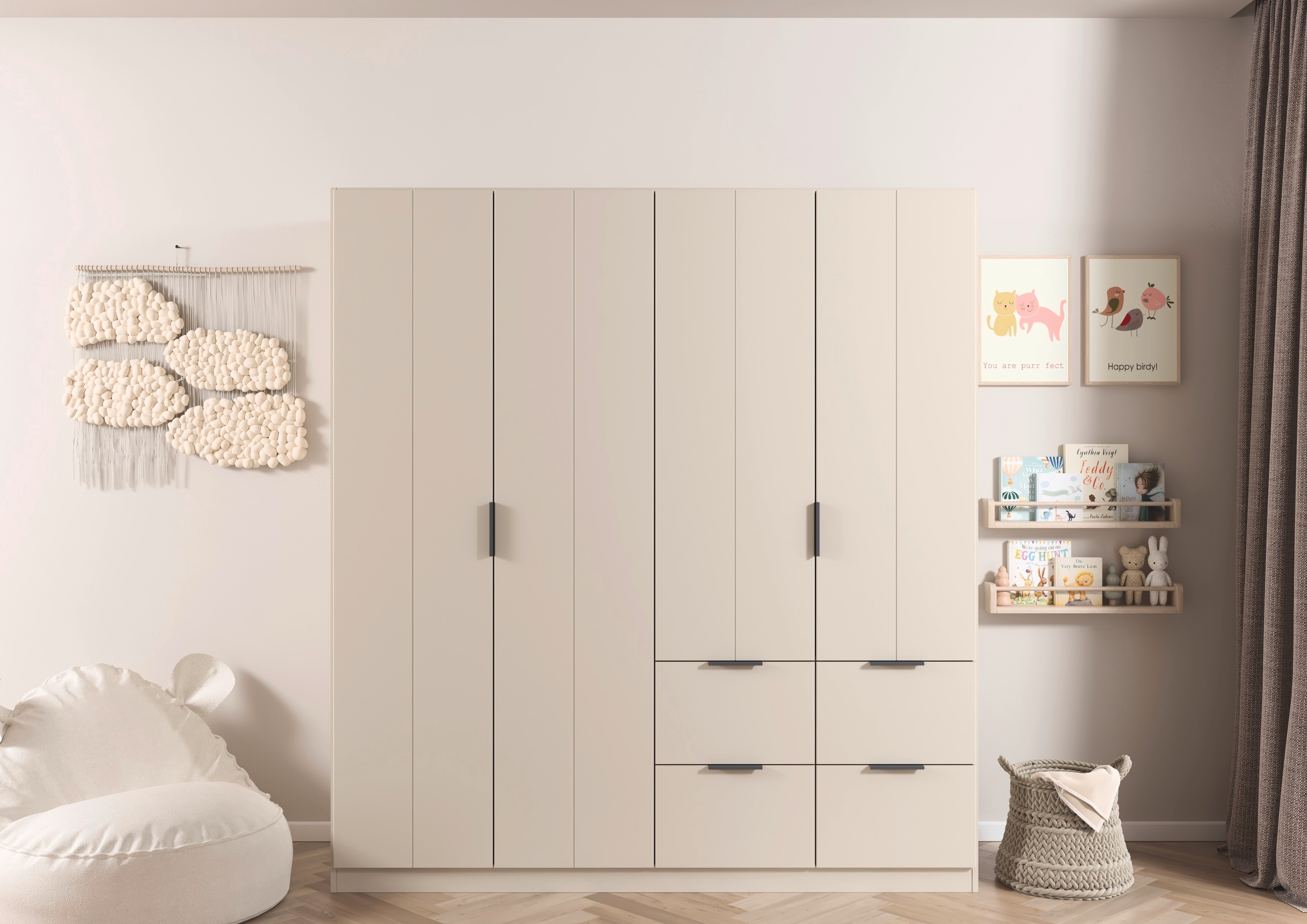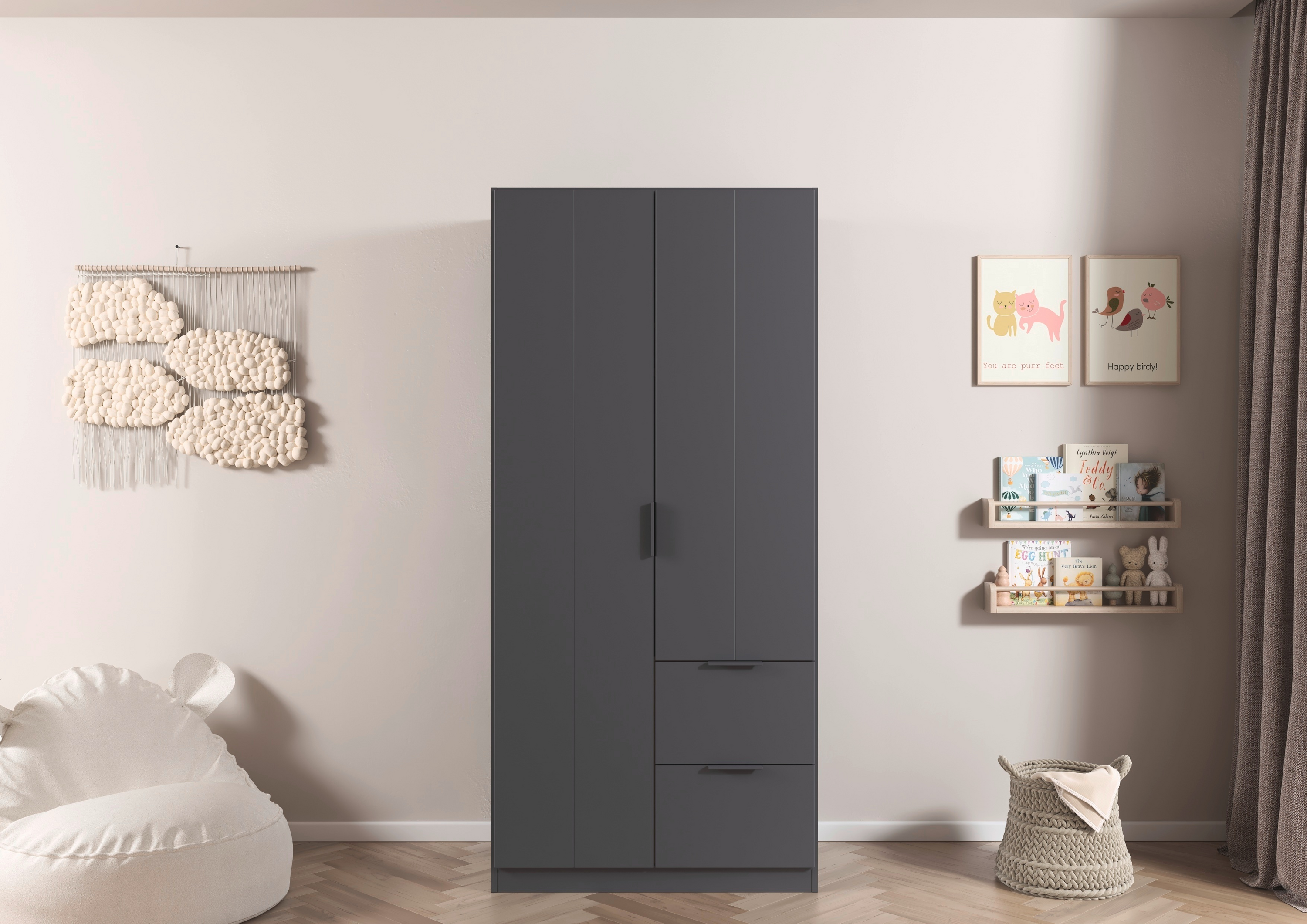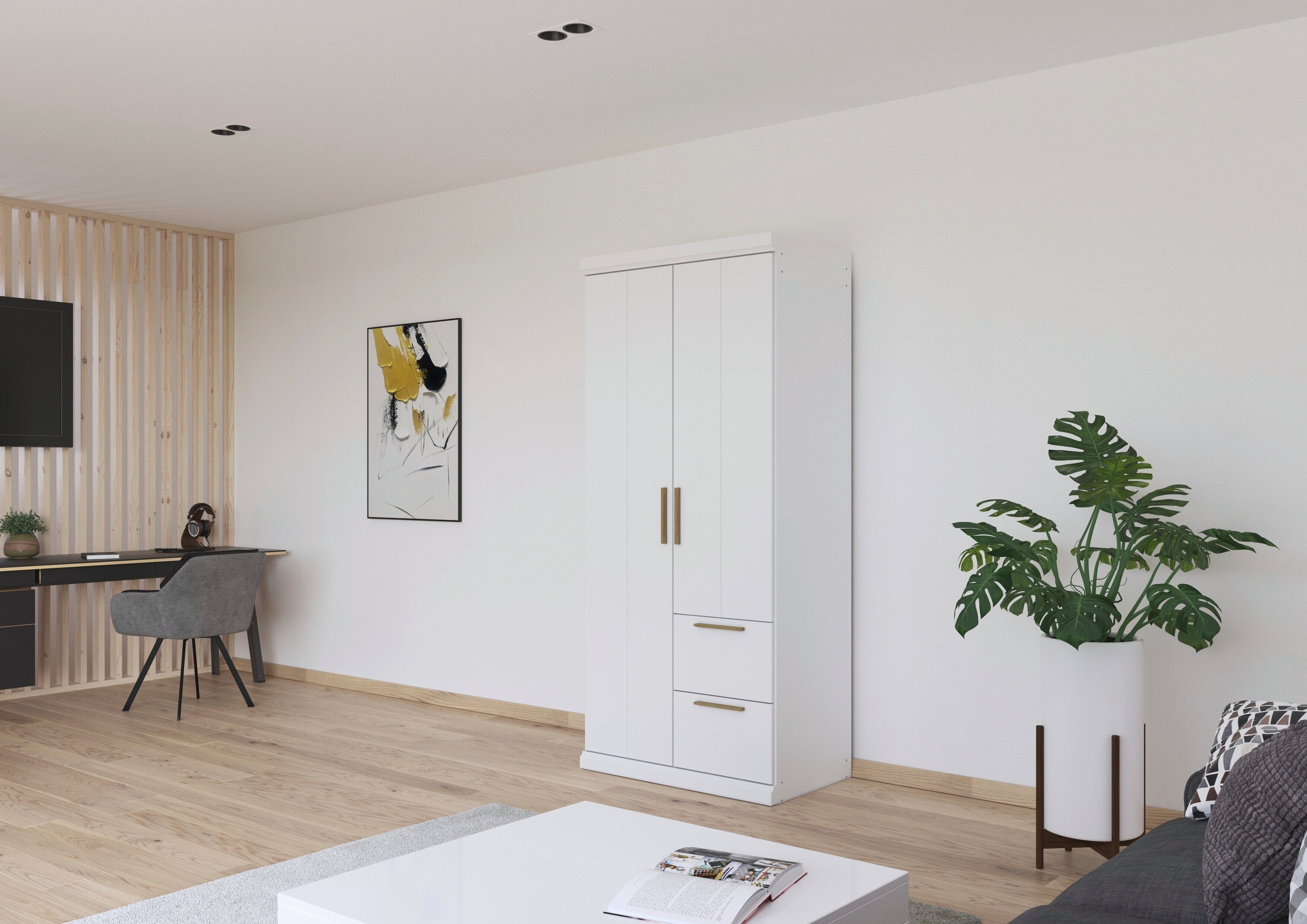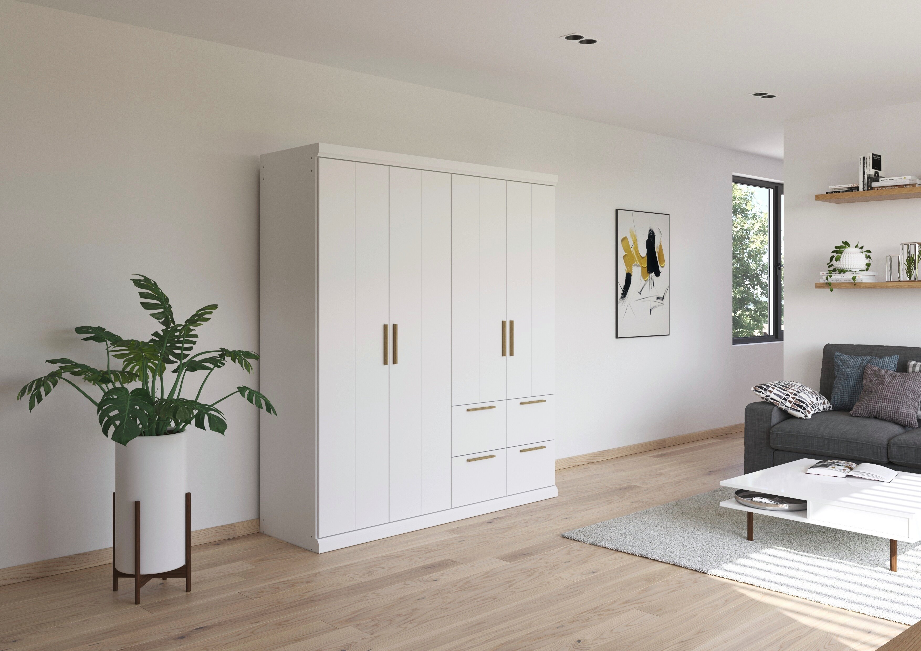Der rauch Kleiderschrank Ella steht für ein ruhiges Design und eine Aufteilung, die dir den Alltag spürbar leichter macht. Die Front des Drehtürenschrankes wirkt ordentlich und zeitlos, während die dezenten Griffe in Holz oder Metall den Look elegant abrunden.