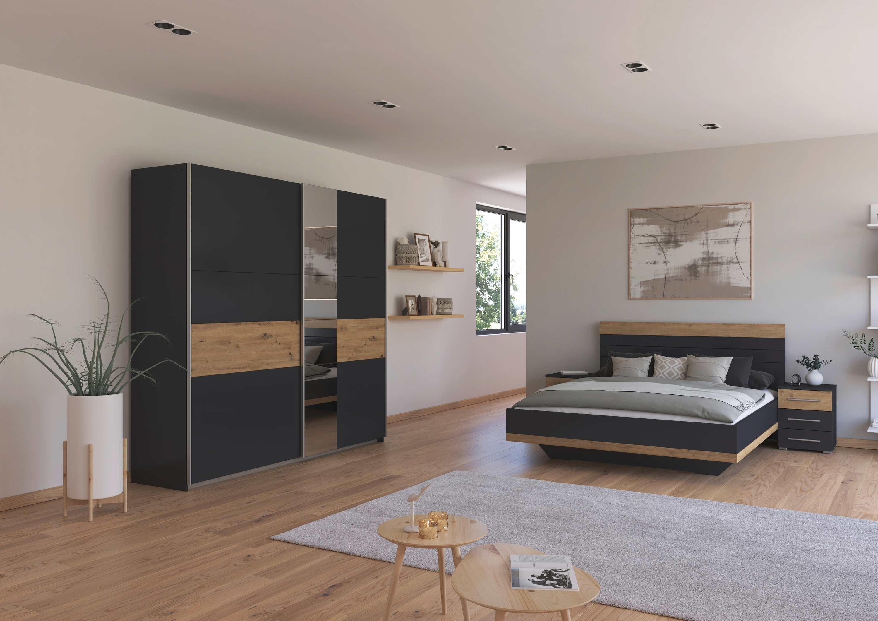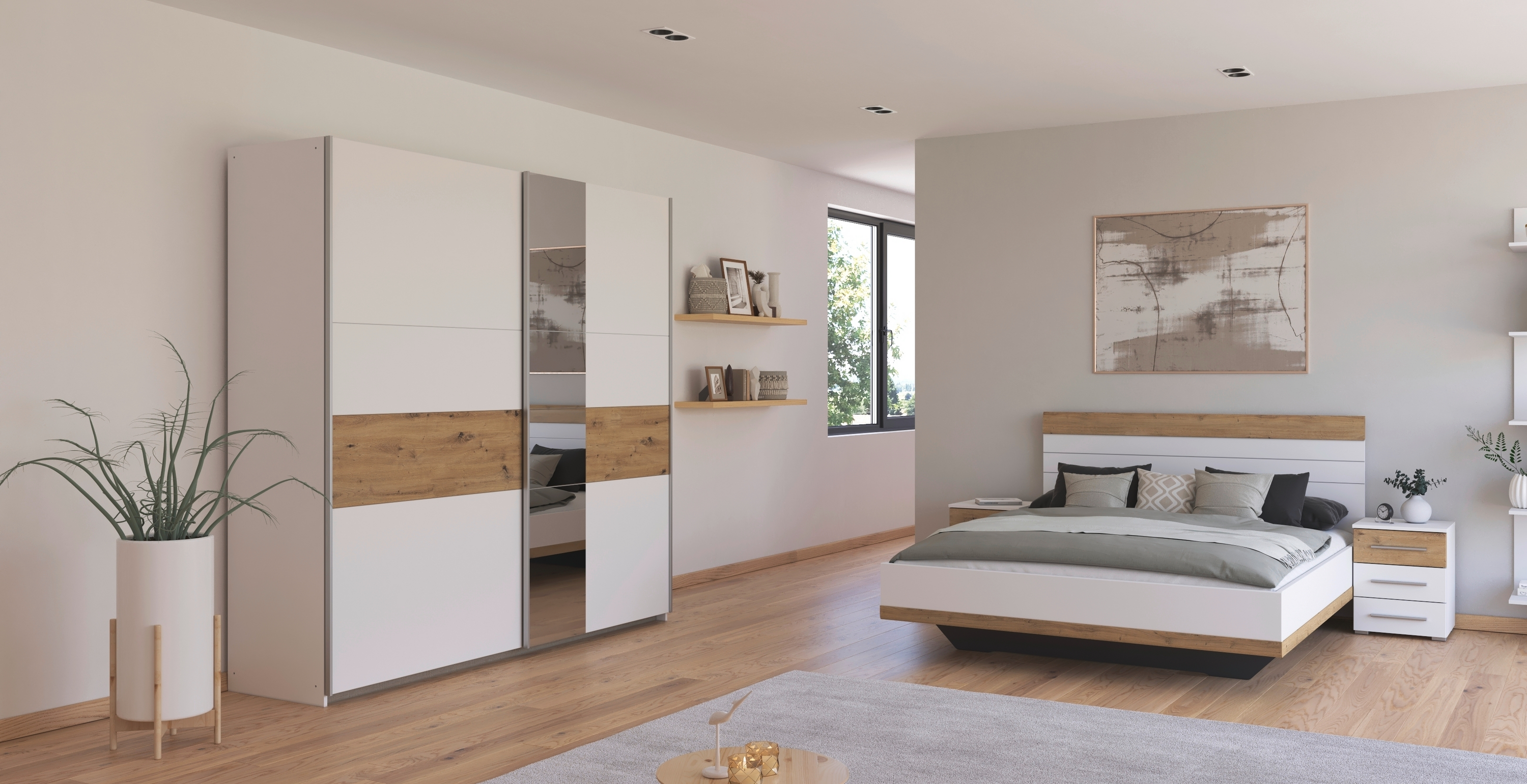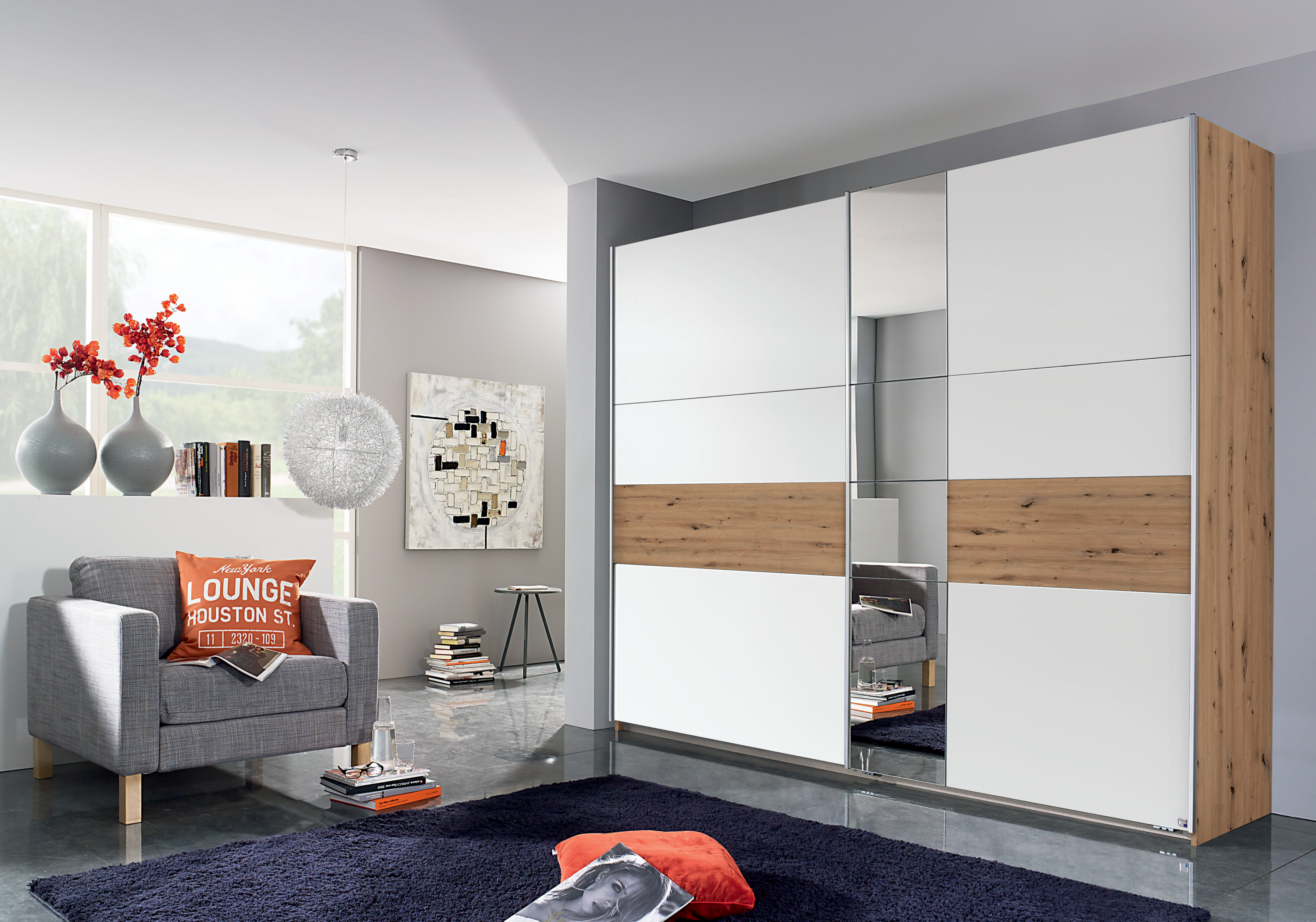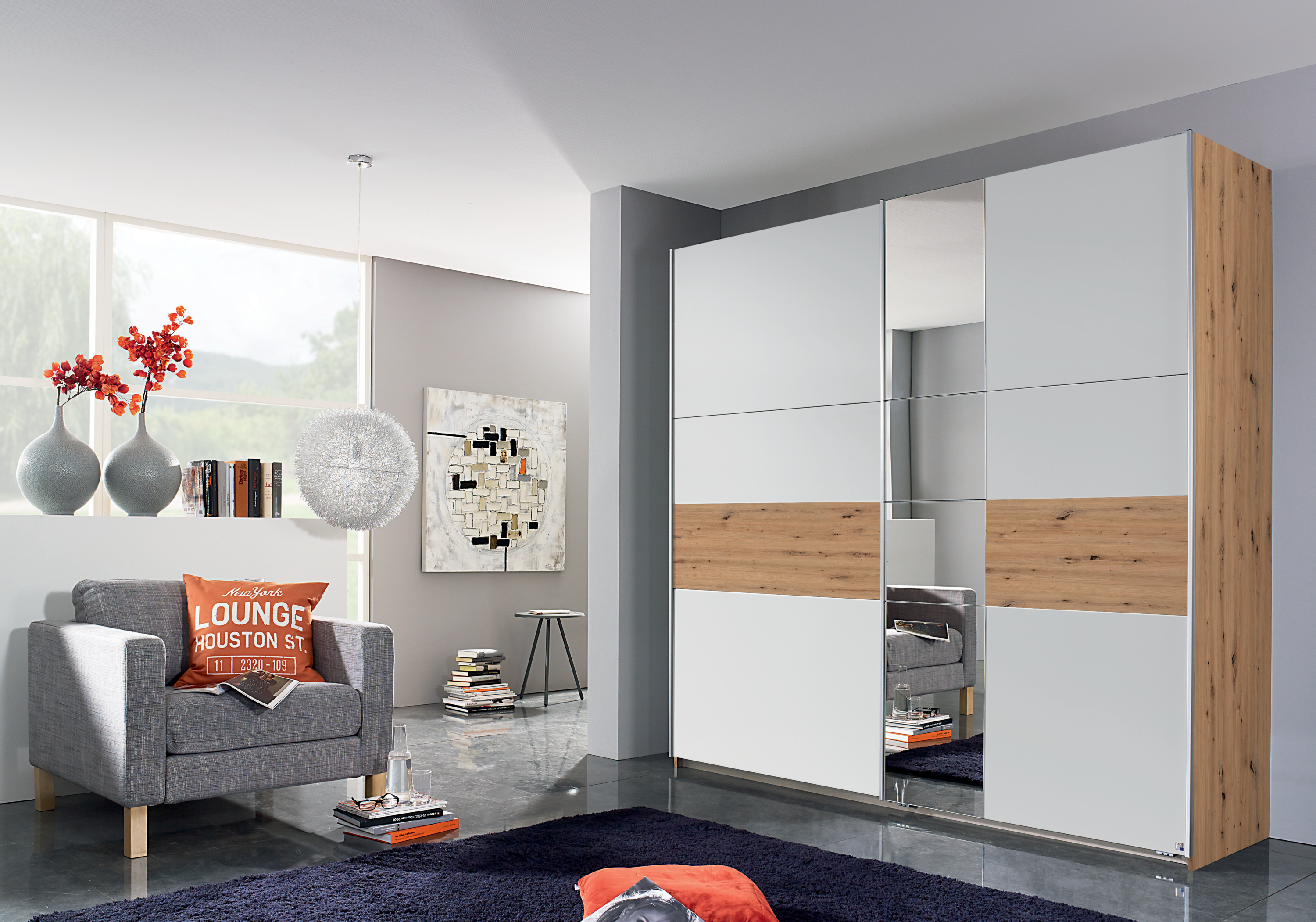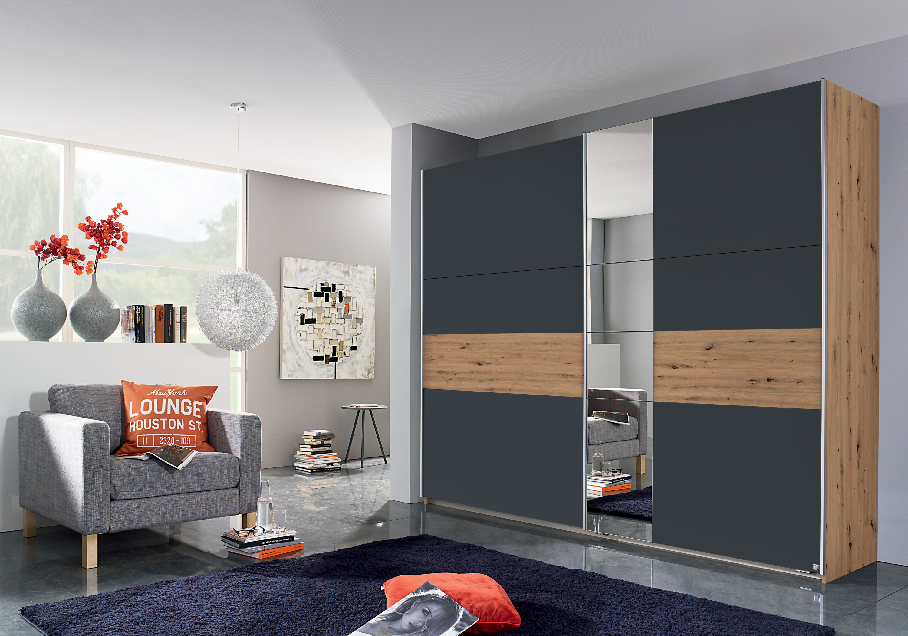 Die Kleiderschränke mit Schwebetüren aus der Serie Korbach vereinen modernes Design mit großzügigem Stauraum-Angebot. Durch die Kombination von aktuellen Farben, schicken, horizontalen Absetzungen und vertikalem Spiegelstreifen entsteht ein spannungsvolles, asymmetrisches Frontdesign.