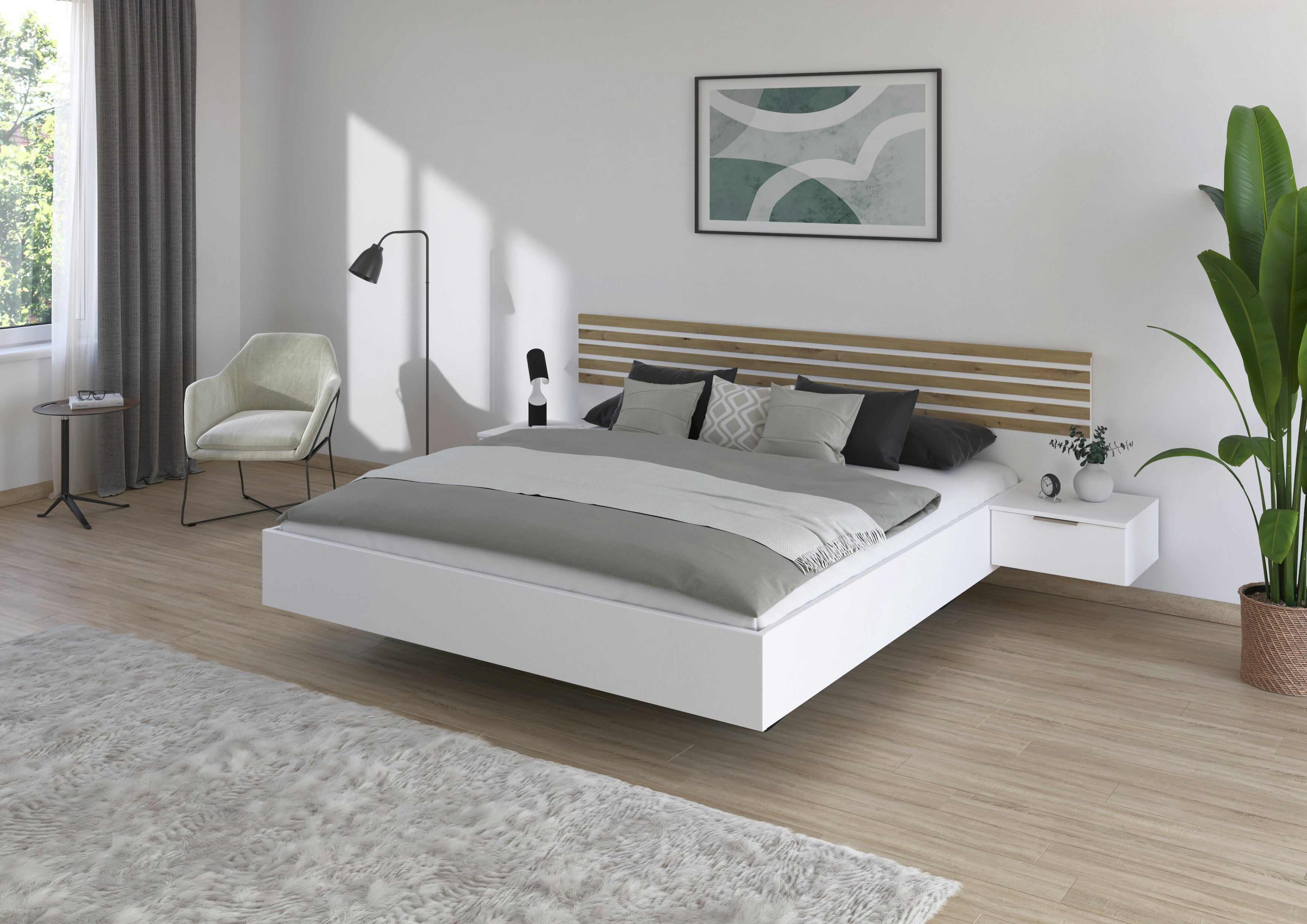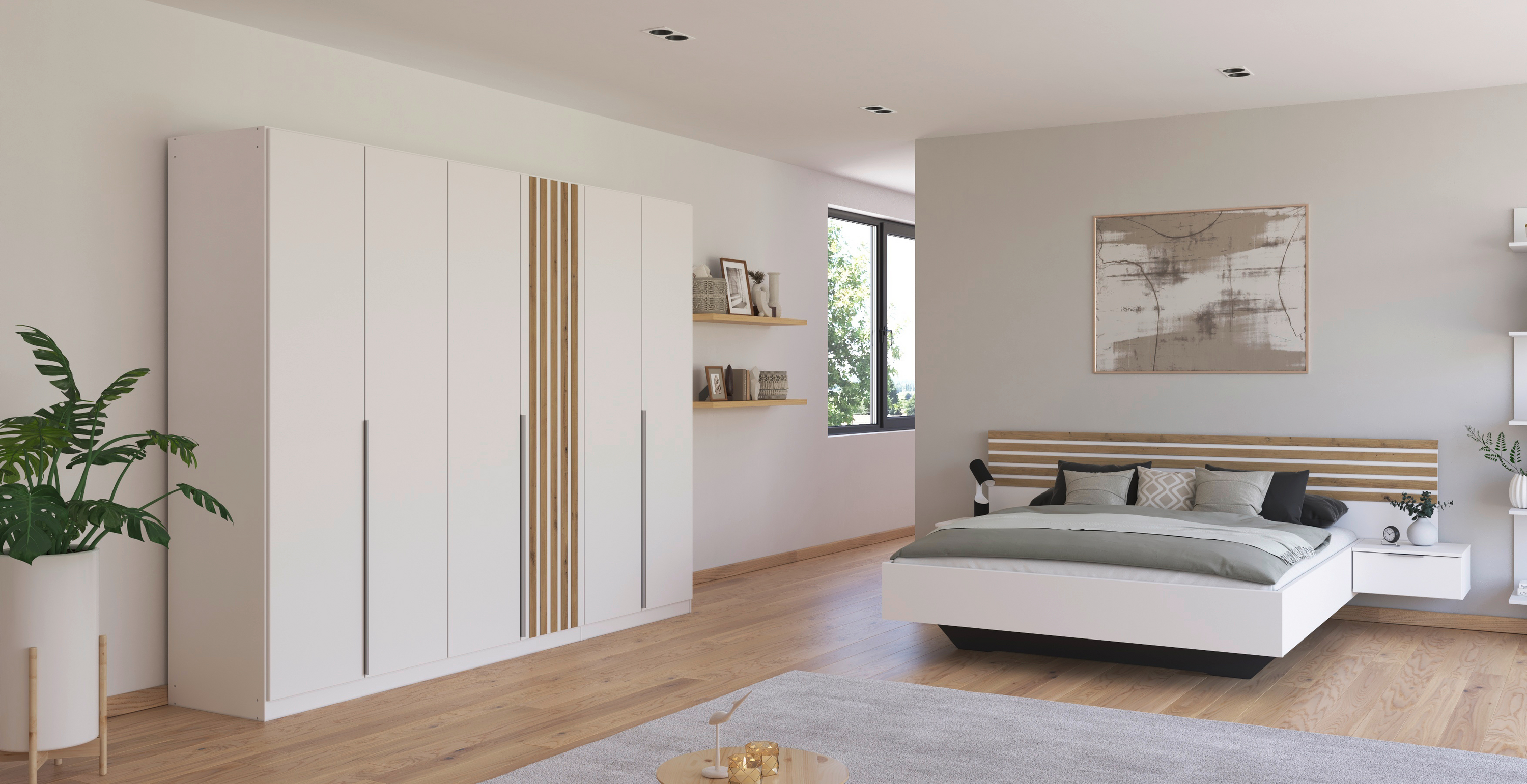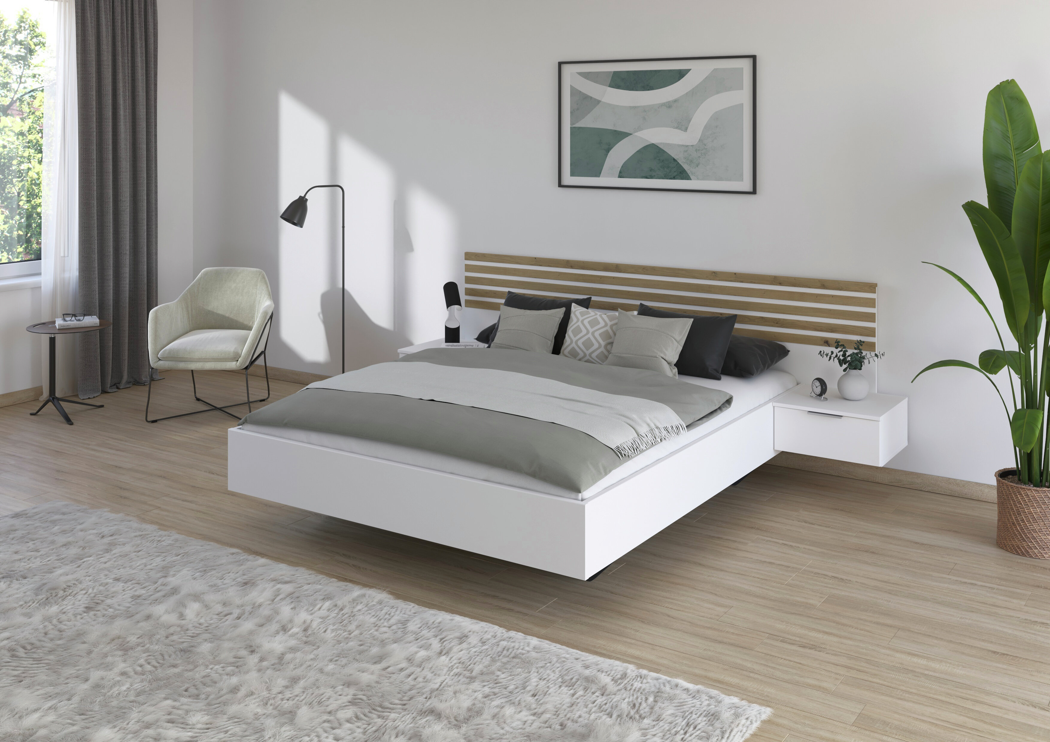 Mit dem Schlafzimmer Lamella triffst du die richtige Entscheidung für dein Schlafzimmer. Im Mittelpunkt steht die Bettanlage im beruhigenden, schlicht wirkenden Design mit schwebender Optik.