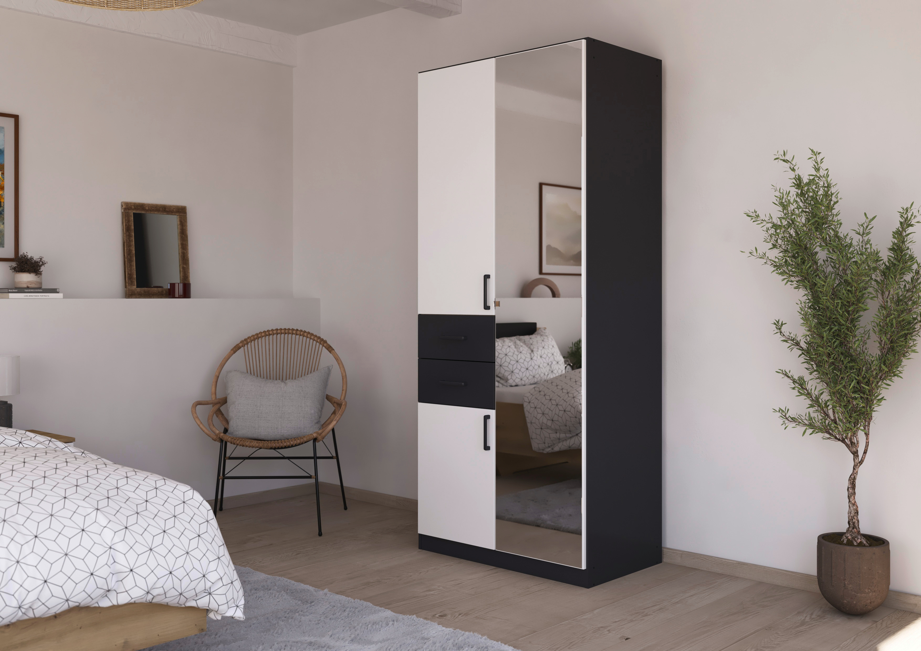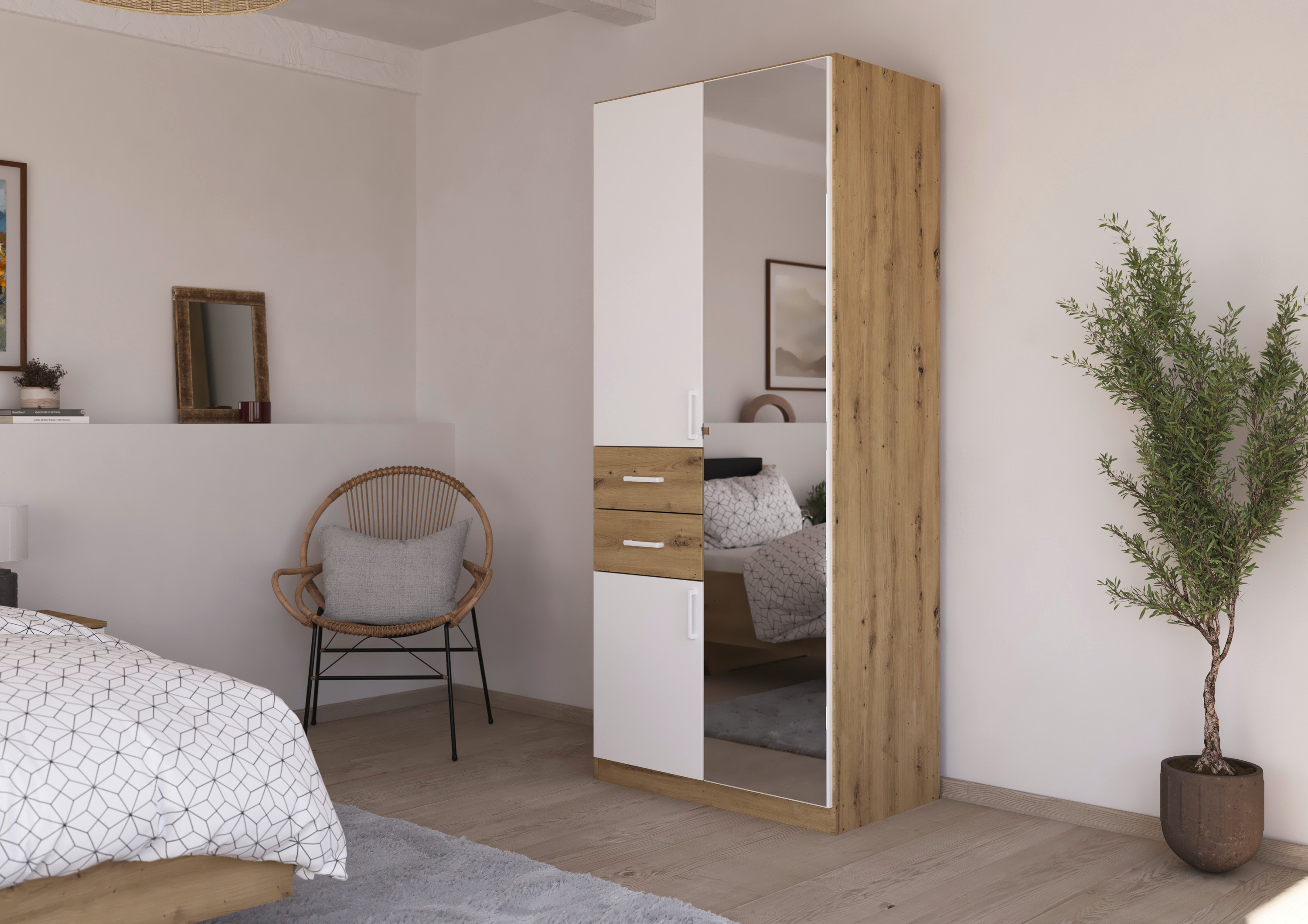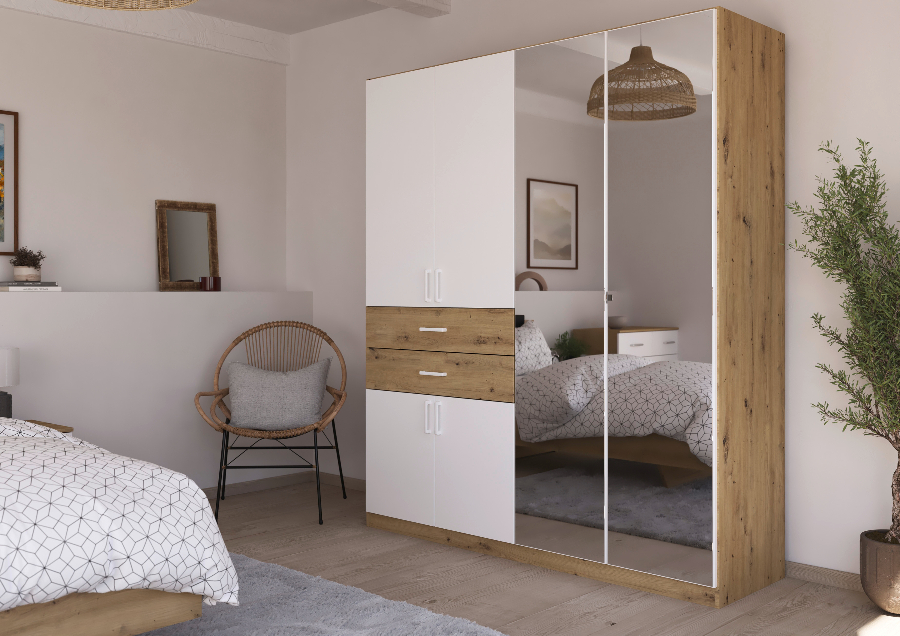 Das klassische Schlafzimmer-Set Maika von rauch umfasst ein Bett mit passenden Nachttischen, einen Drehtürenschrank und zeitlose Kommoden, die zusammen ein einheitliches Gesamtbild ergeben