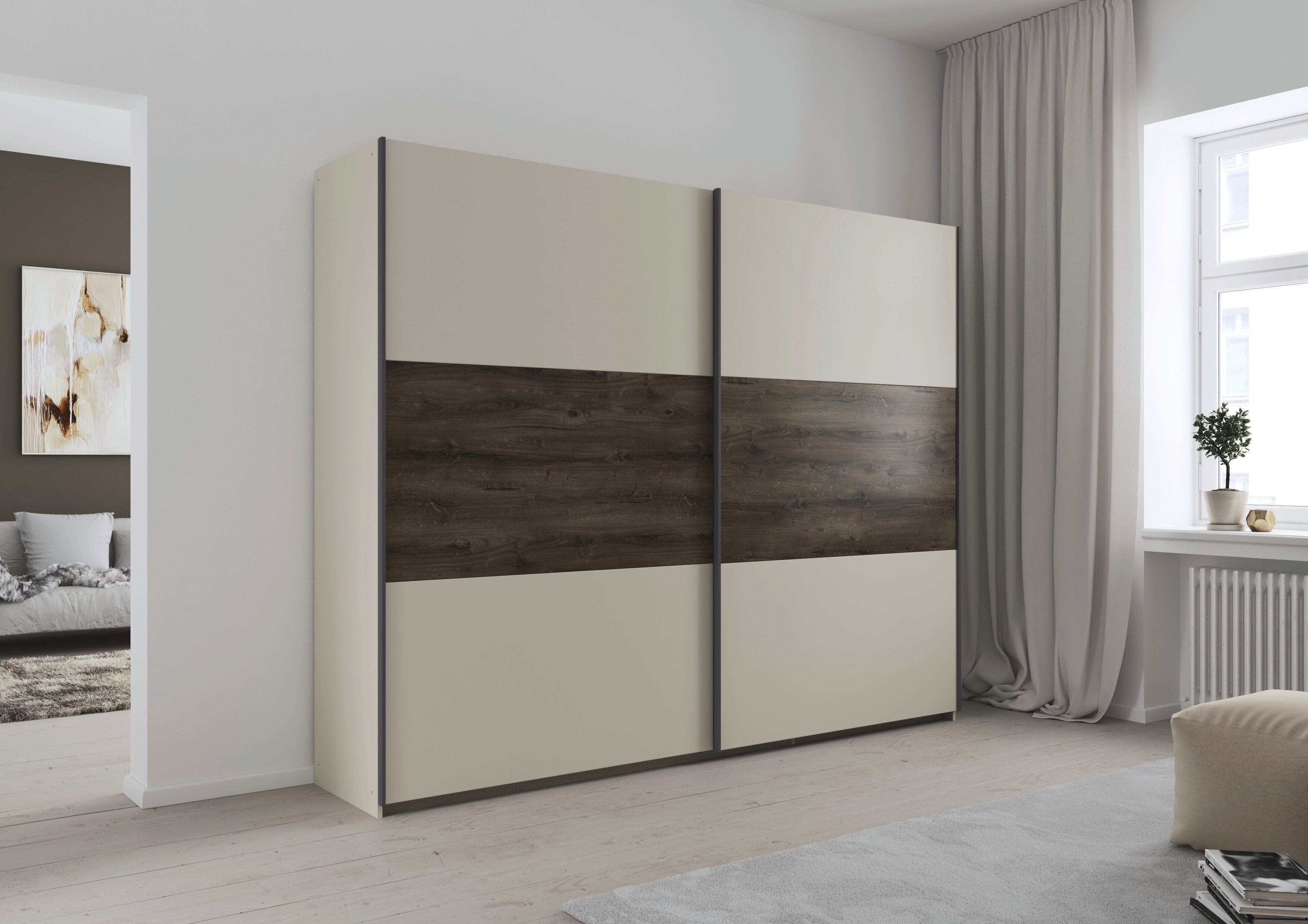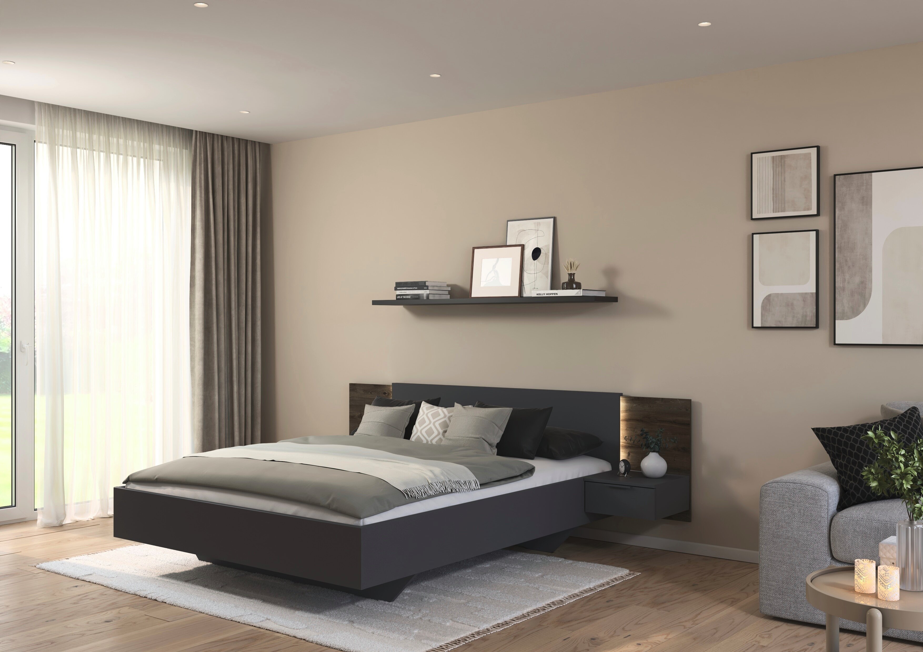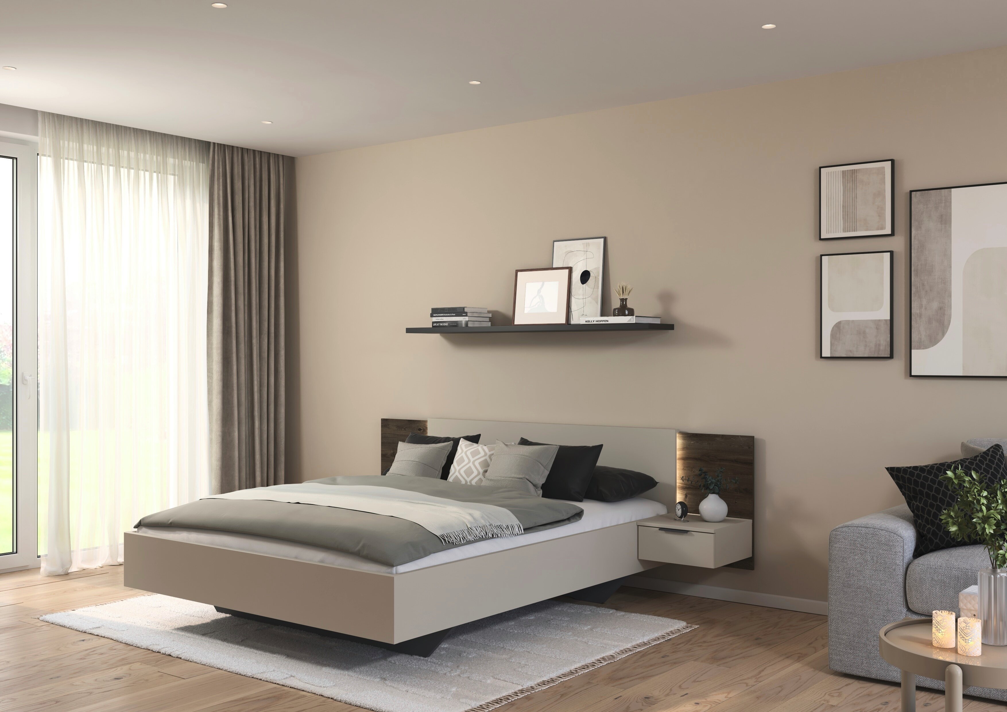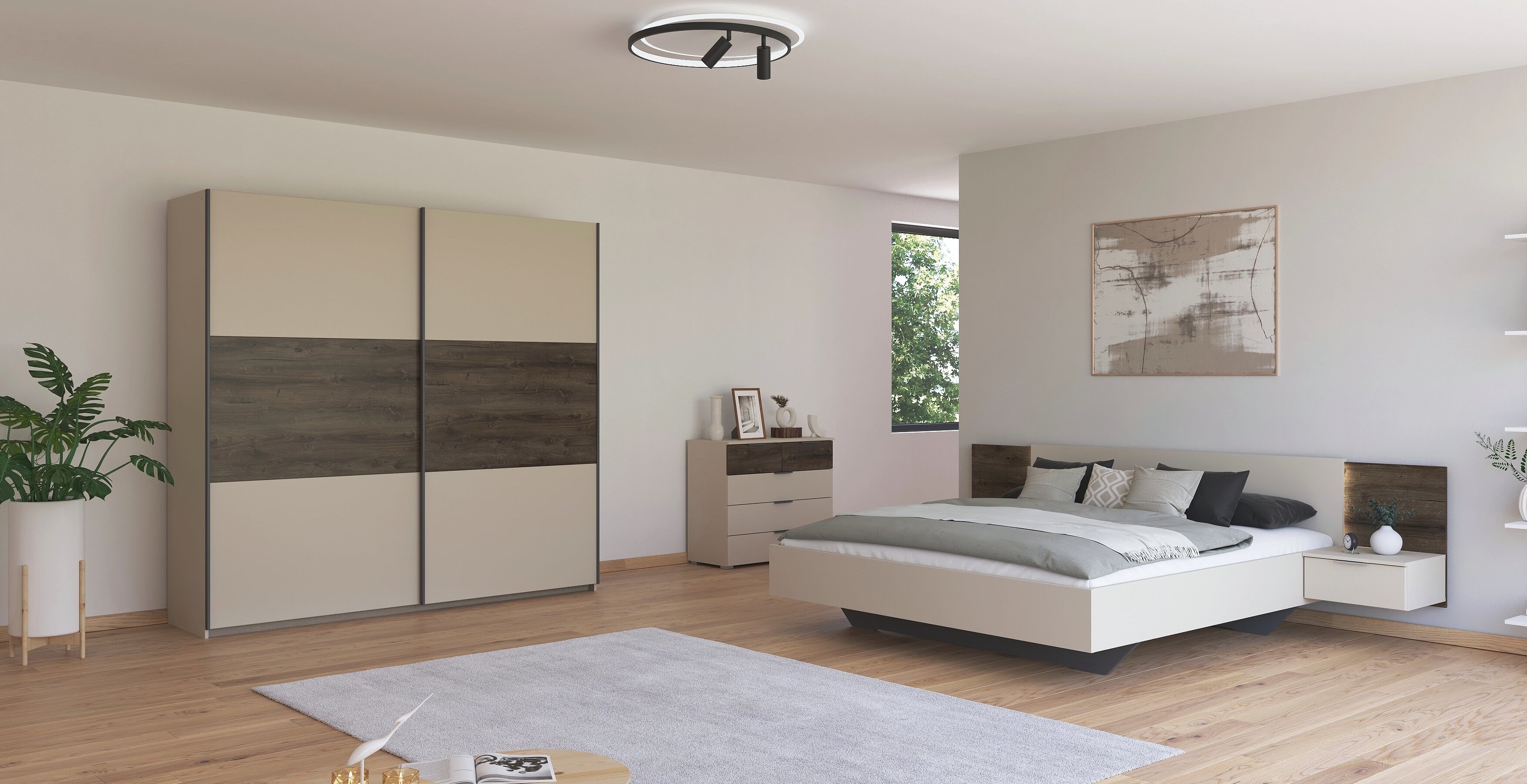 Das rauch Schlafzimmer Marbella schafft ein stimmiges Ambiente zum Abschalten. Seine klaren Flächen wirken aufgeräumt, während die markante Holzabsetzung als Gestaltungselement Tiefe und Wohnlichkeit in den Raum bringt.