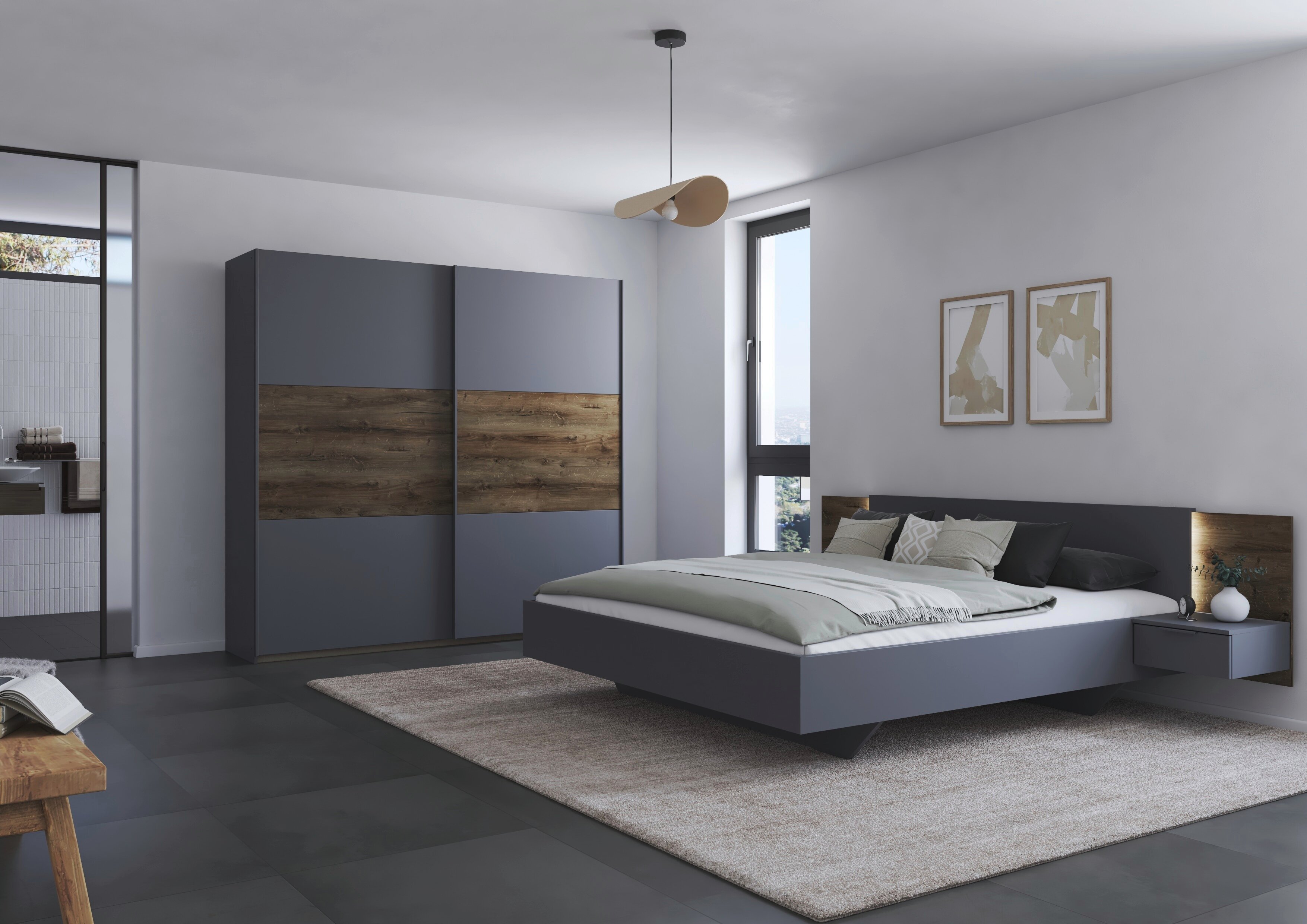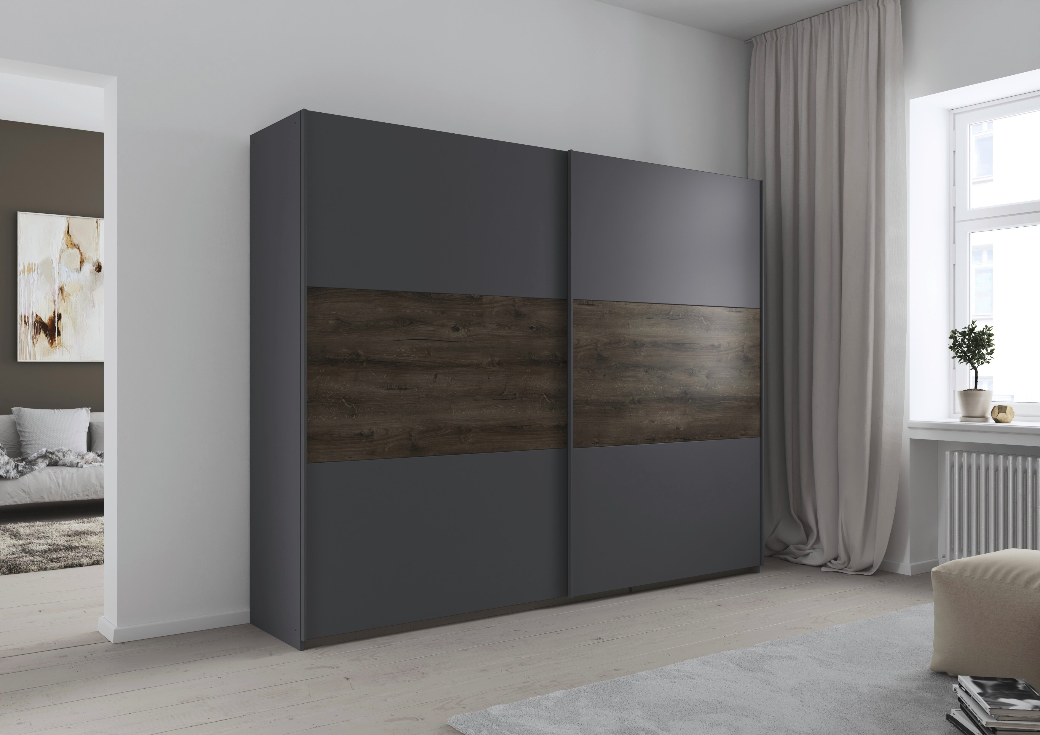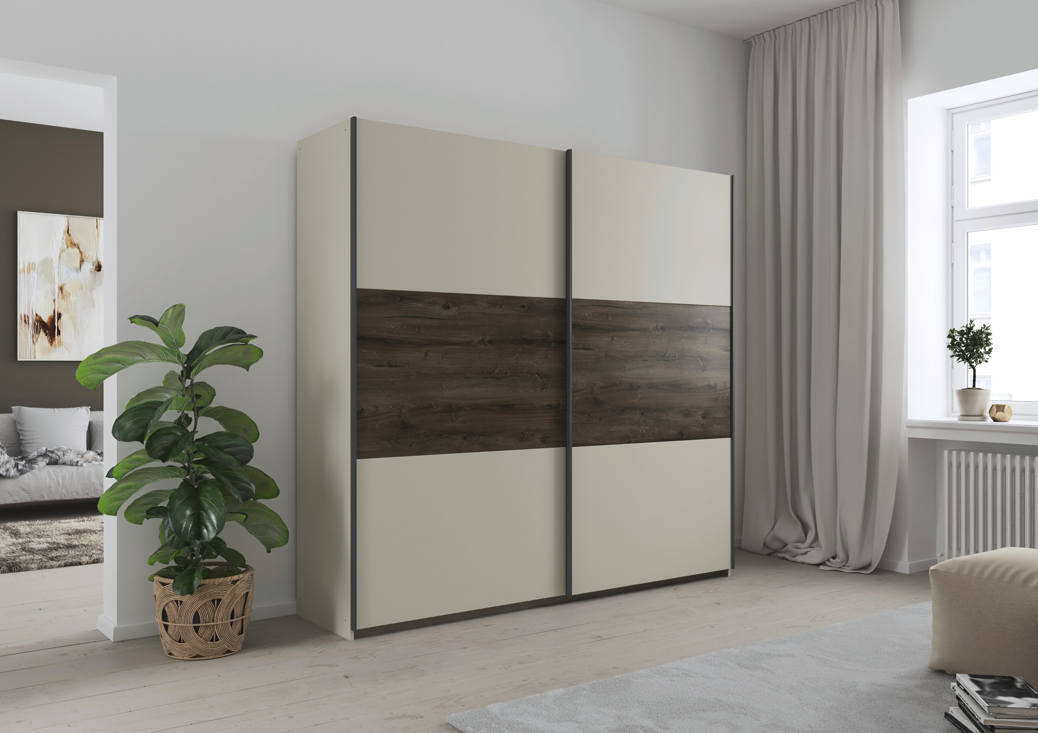 Das rauch Schlafzimmer Marbella schafft ein stimmiges Ambiente zum Abschalten. Seine klaren Flächen wirken aufgeräumt, während die markante Holzabsetzung als Gestaltungselement Tiefe und Wohnlichkeit in den Raum bringt.