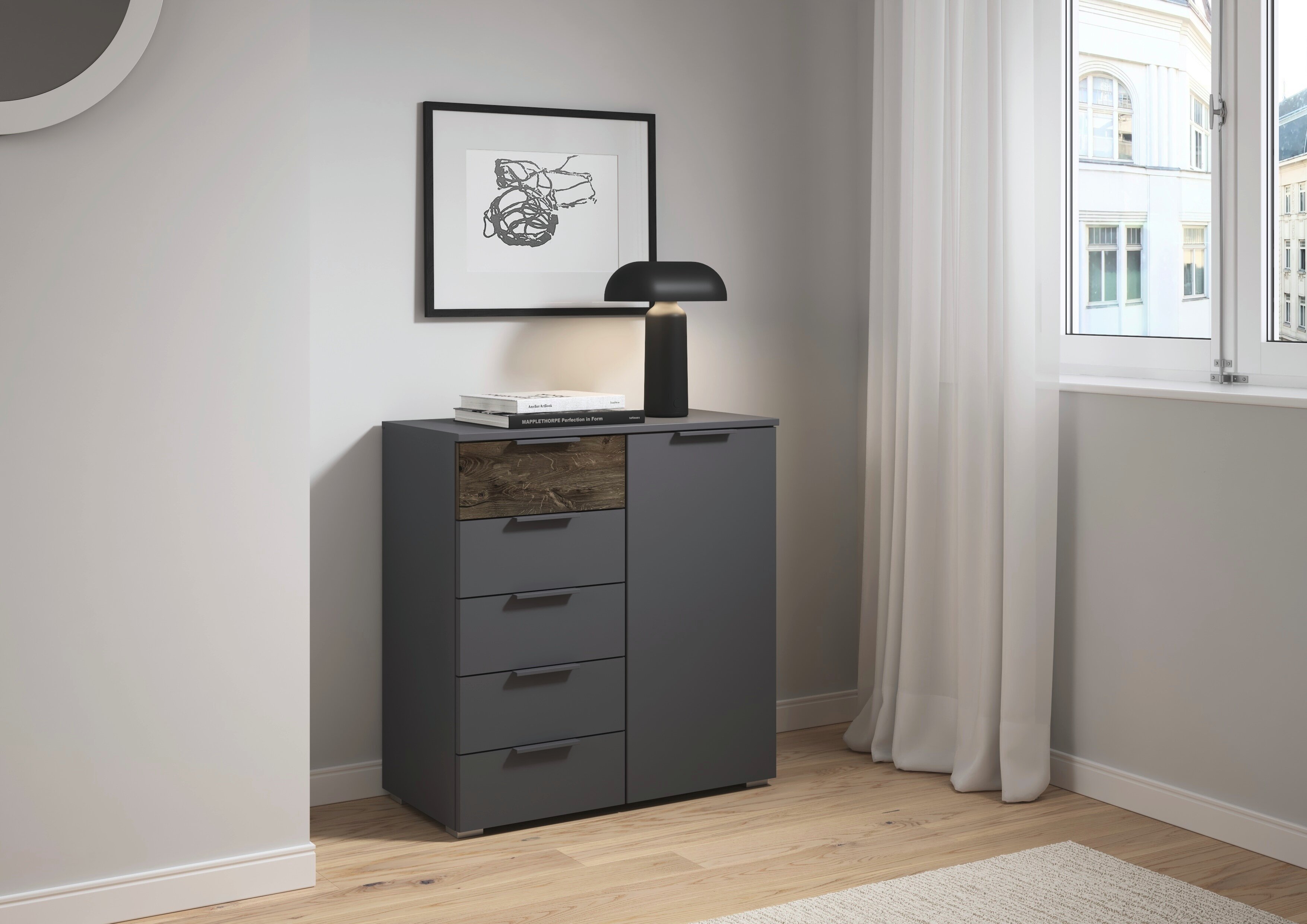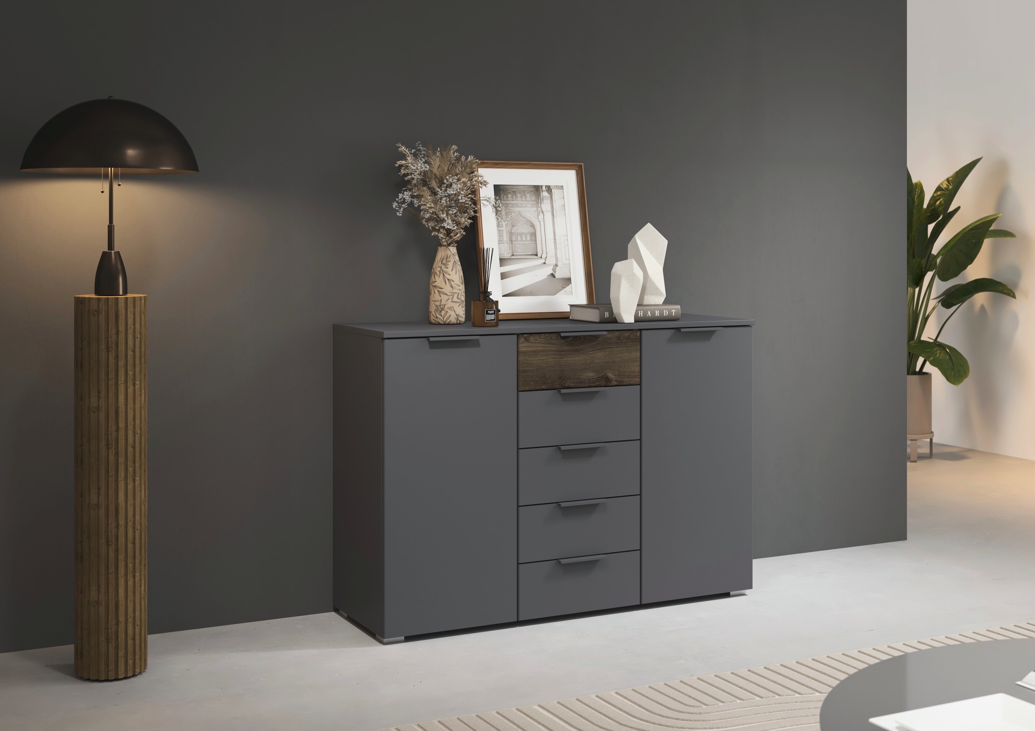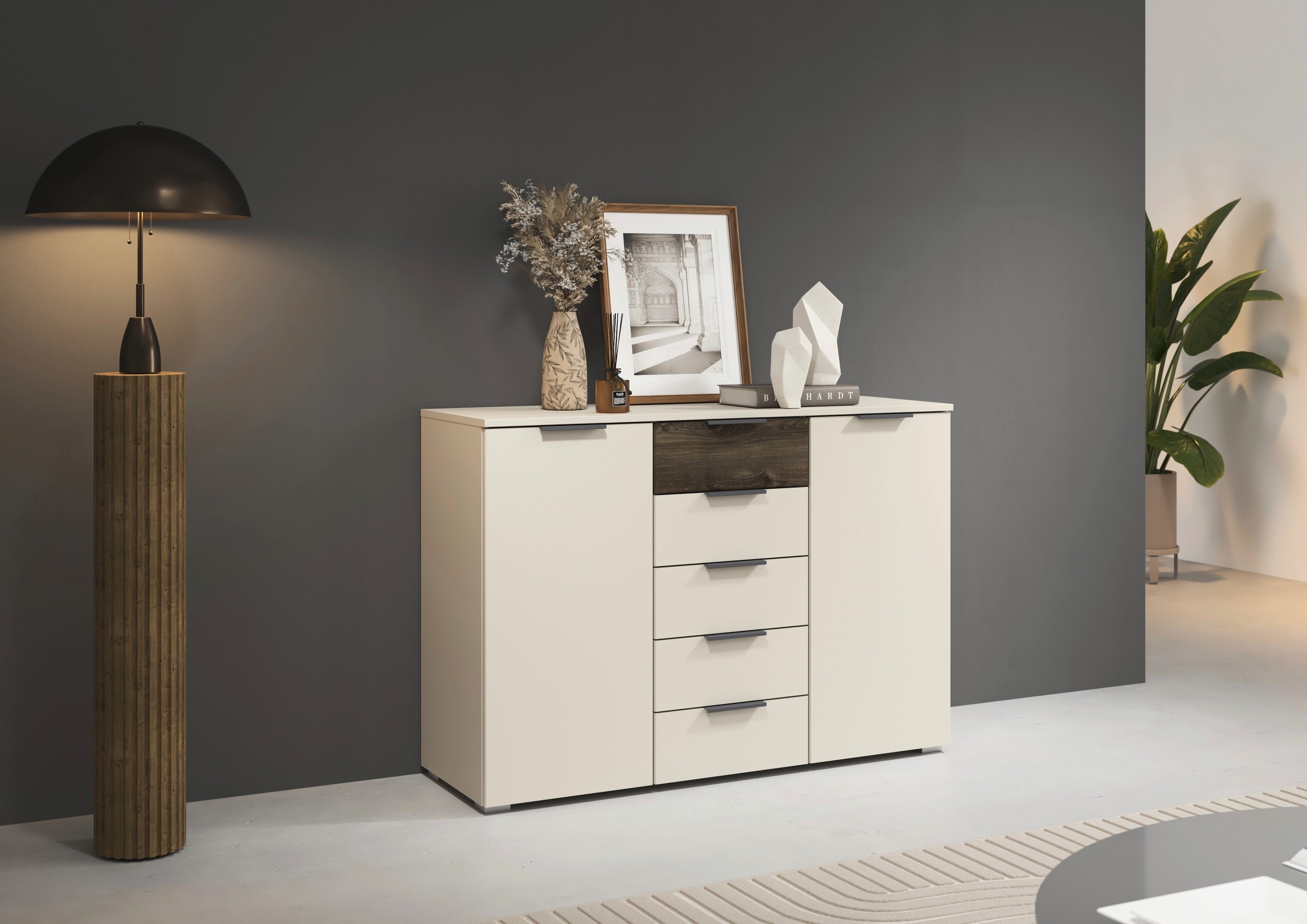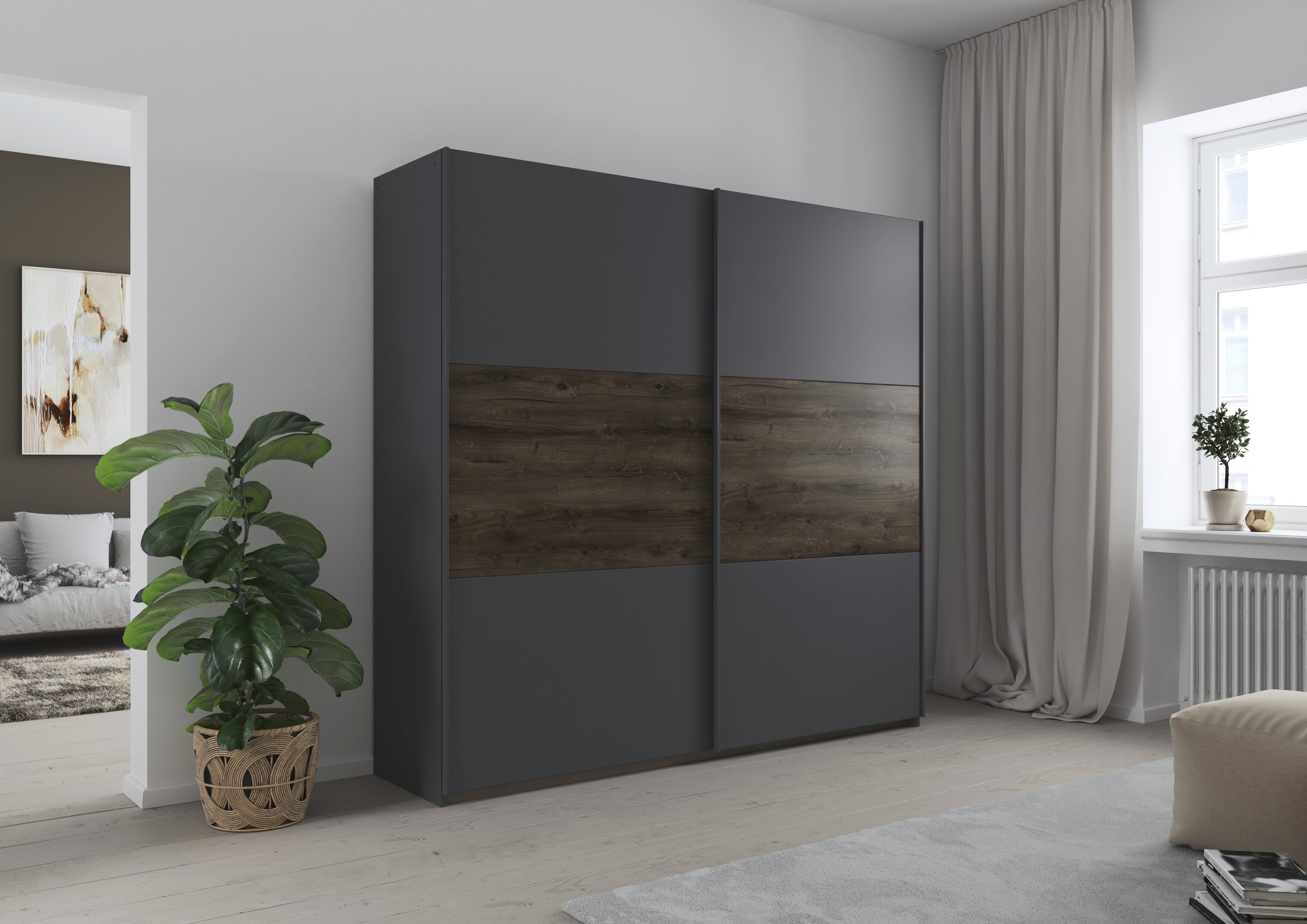 Das rauch Schlafzimmer Marbella schafft ein stimmiges Ambiente zum Abschalten. Seine klaren Flächen wirken aufgeräumt, während die markante Holzabsetzung als Gestaltungselement Tiefe und Wohnlichkeit in den Raum bringt.