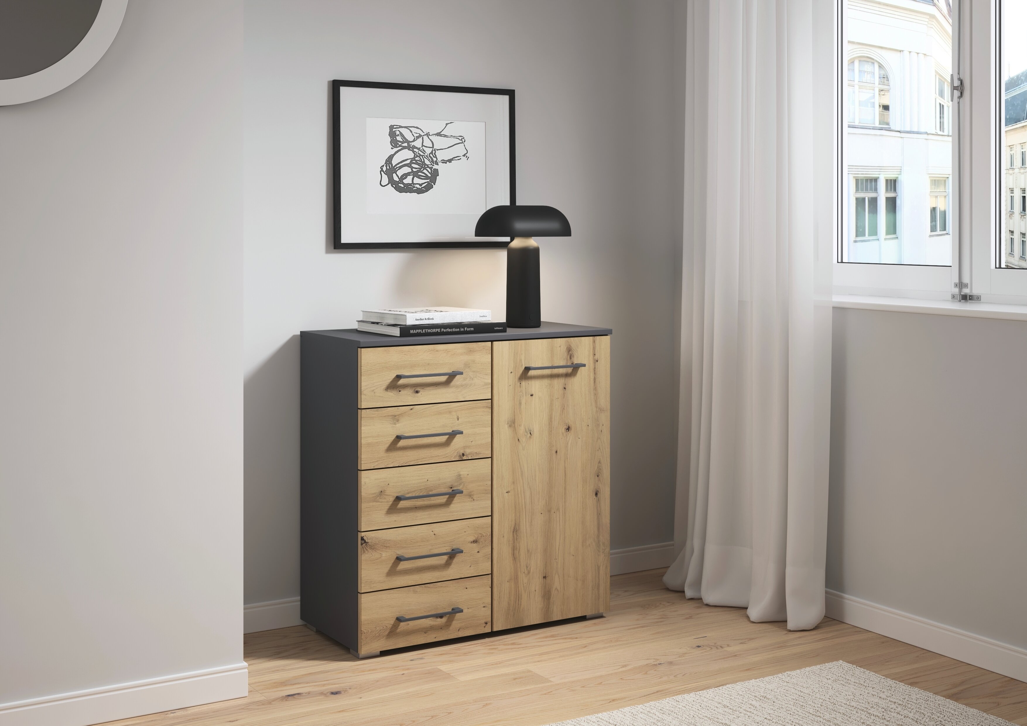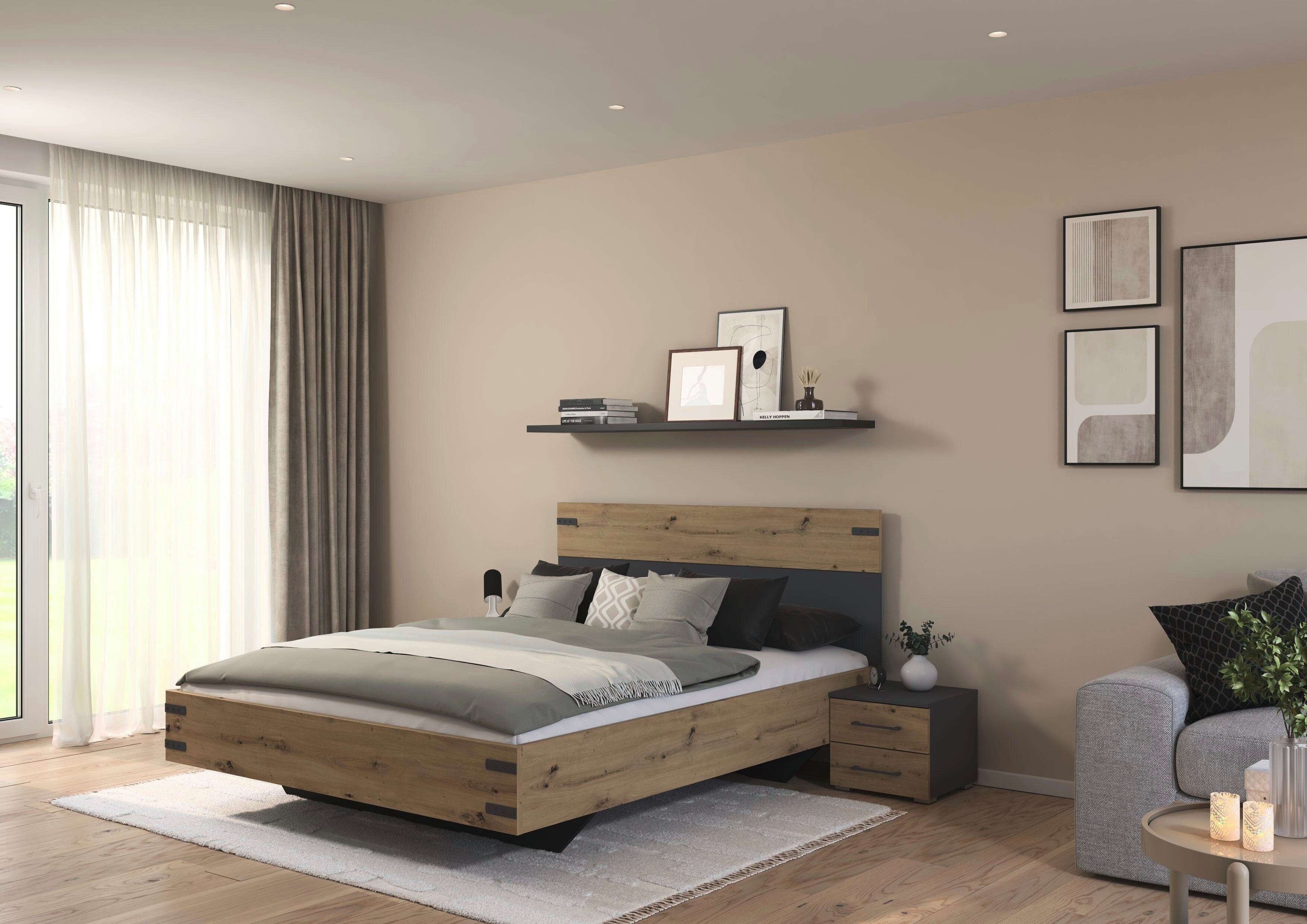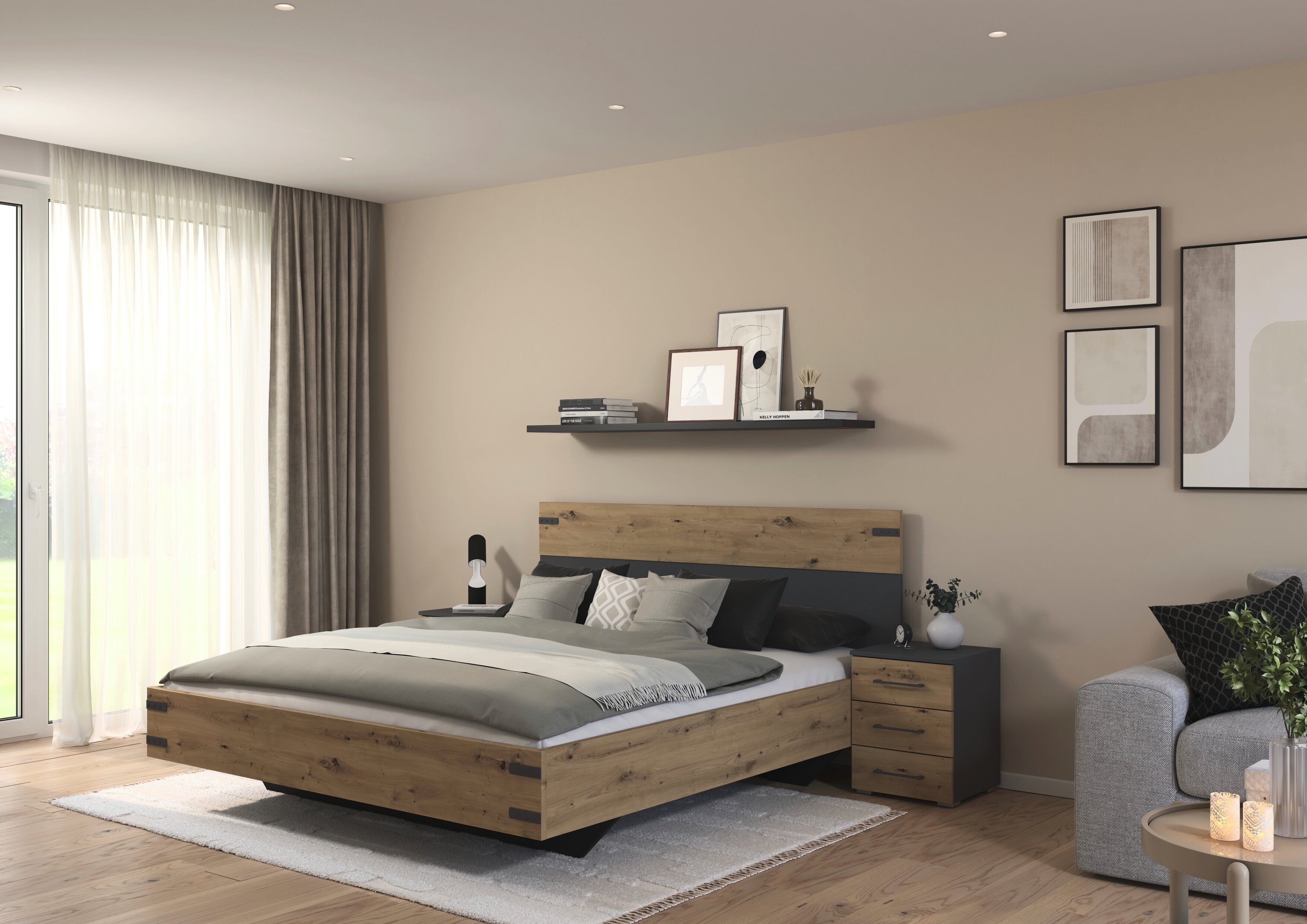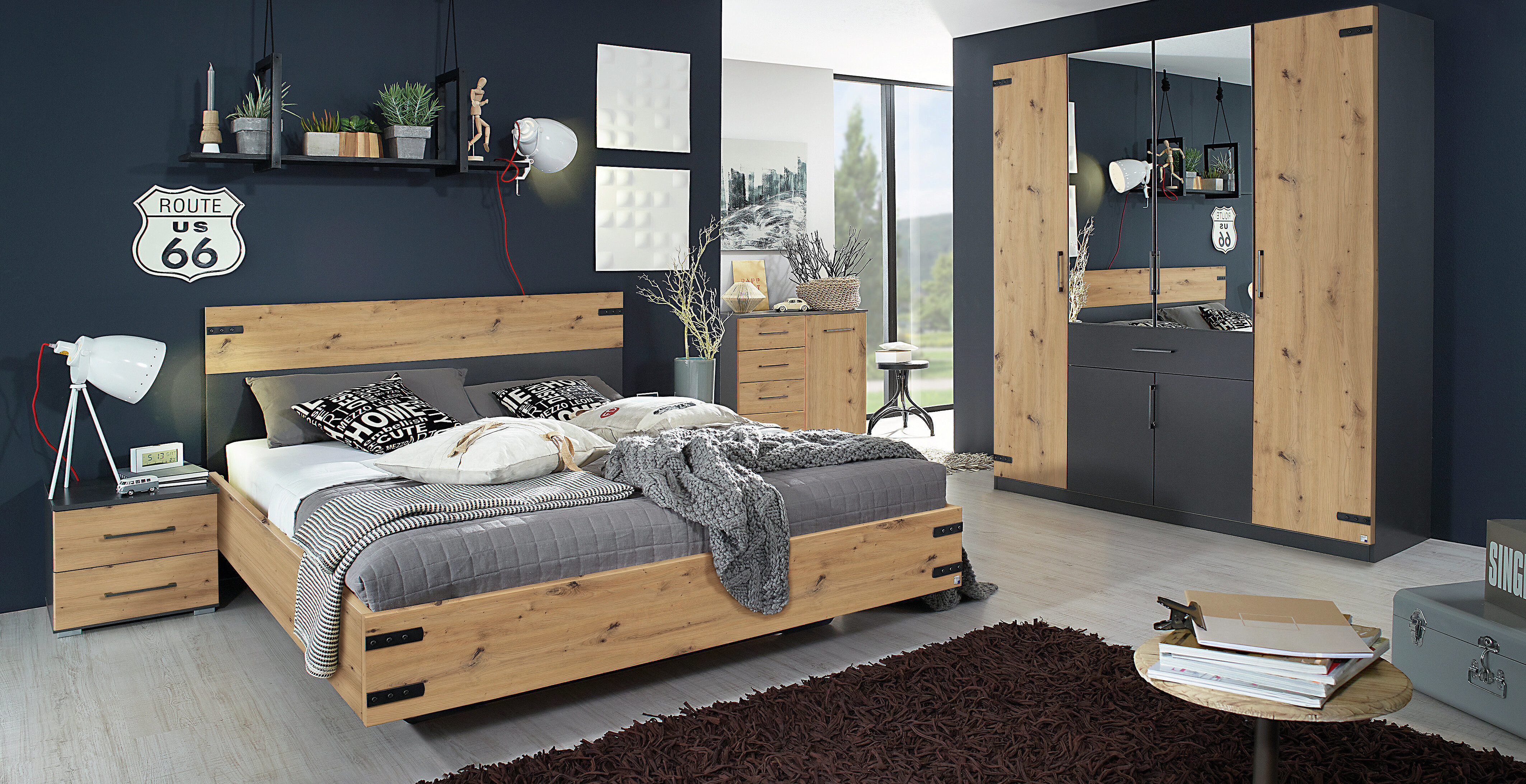 Attraktives Eiche-Holzdekor in Kombination mit Oberflächen in dunklem graumetallic erzeugt beim Modell Nevada einen Look im modernen Industrial-Style. Die angesagte Optik wird mit ansprechenden Applikationen und auffälligen, formschönen Griffen zum Hingucker.