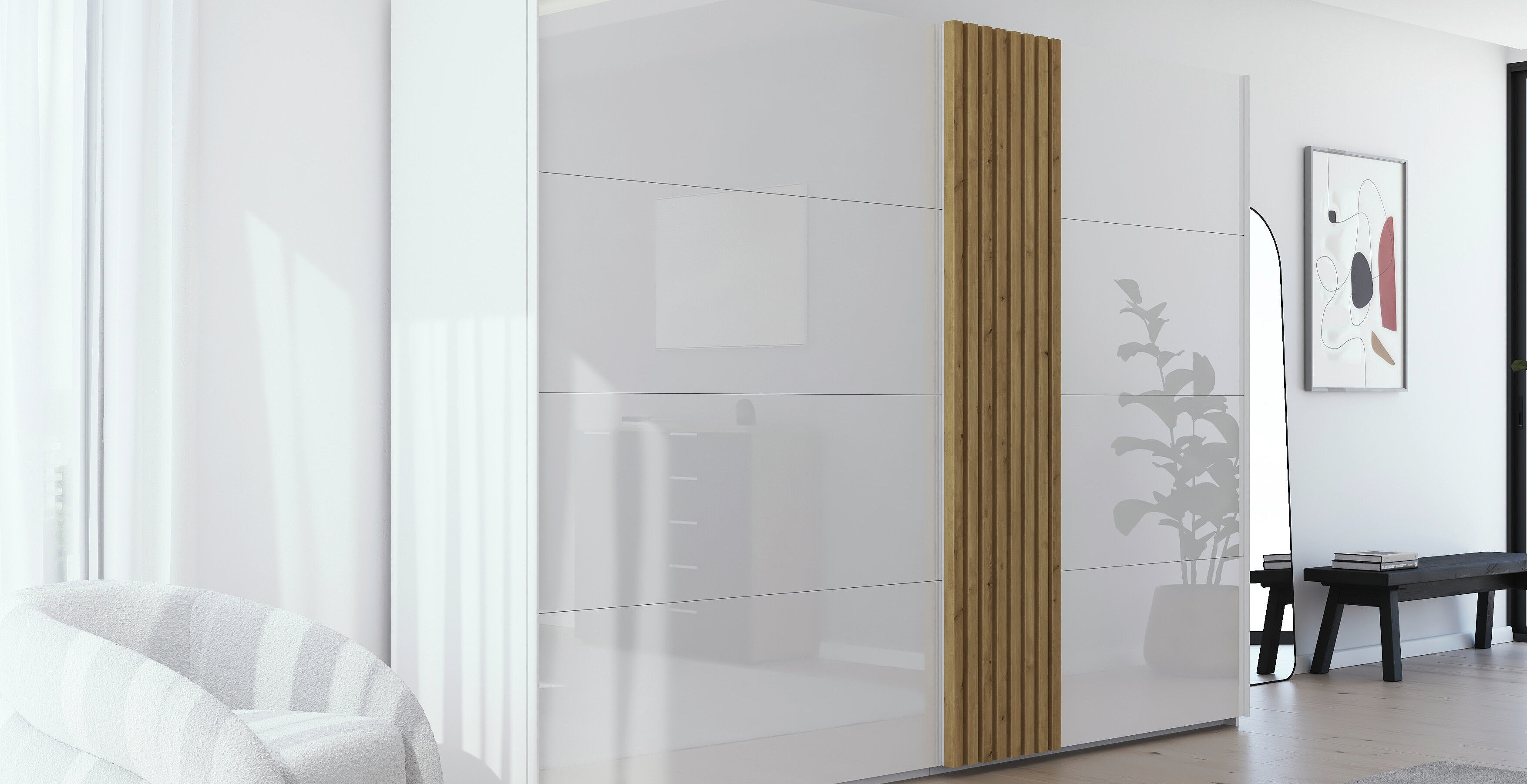 Die Schrankfront von Tegio kannst du entweder mit elegant glänzendem Farbglas oder mit Kristallspiegel auswählen. So kommen die markanten, vertikalen Leisten auf der Front noch besser zur Geltung. Sie verleihen deinem Kleiderschrank ein ganz besonderes, asymmetrisches Erscheinungsbild. Die großflächigen Schwebetüren gleiten dank dem rauch easy slide Schwebetürensystem sanft und lautlos zur Seite und eröffnen dir, ohne Platzverlust im Raum, einen umfassenden Blick ins Schrankinnere.